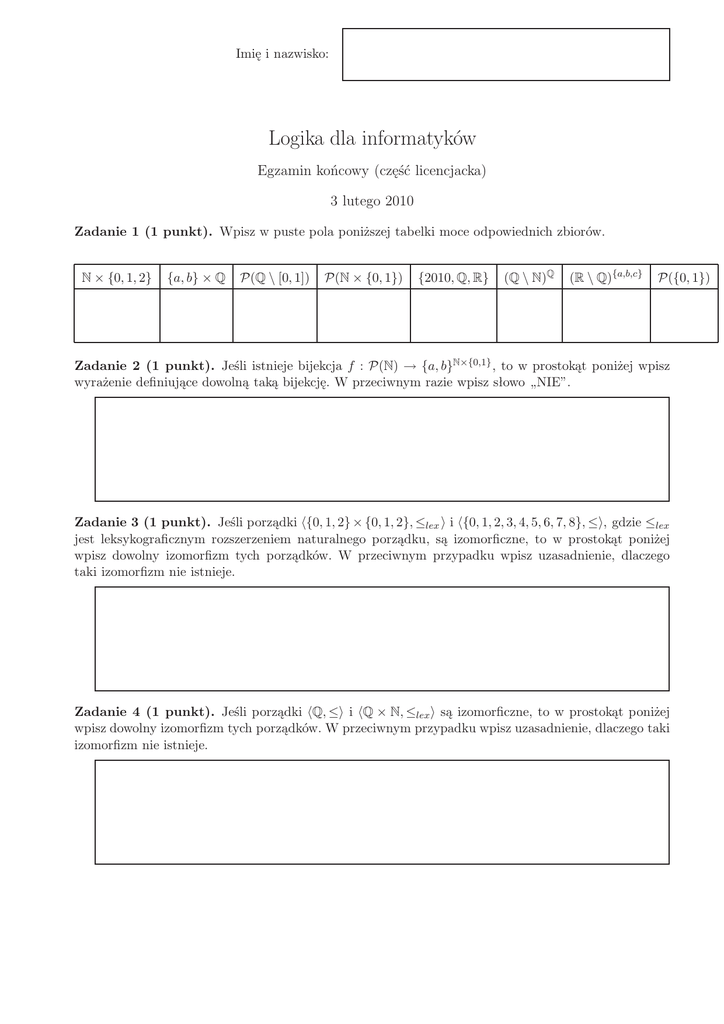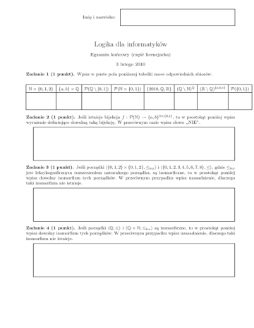Zadanie 4 (1 punkt). Jeśli porządki hQ, ≤i i hQ × N, ≤lex i są izomorficzne, to w prostokąt poniżej