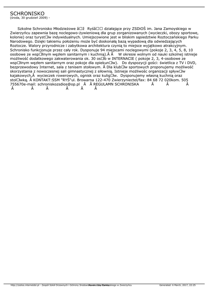 SCHRONISKO (środa, 30 grudzień 2009) - Szkolne Schronisko Młodzieżowe „ Ryśâ€• działające przy ZSDiOŚ im. Jana Zamoyskiego w Zwierzyńcu zapewnia bazę noclegowo-żywieniową dla grup zorganizowanych (wycieczki, obozy sportowe, kolonie) oraz turystÃłw indywidualnych. Umiejscowione jest w bliskim sąsiedztwie Roztoczańskiego Parku Narodowego. Dzięki takiemu położeniu może być doskonałą bazą wypadową dla odwiedzających Roztocze. Walory przyrodnicze i zabytkowa architektura czynią to miejsce wyjątkowo atrakcyjnym. Schronisko funkcjonuje przez cały rok. Dysponuje 94 miejscami noclegowymi (pokoje 2, 3, 4, 5, 8, 10 osobowe ze wspÃłlnym węzłem sanitarnym i kuchnią).  W okresie wolnym od nauki szkolnej istnieje możliwość dodatkowego zakwaterowania ok. 30 osÃłb w INTERNACIE ( pokoje 2, 3, 4-osobowe ze wspÃłlnym węzłem sanitarnym oraz pokoje dla opiekunÃłw). Do dyspozycji gości: świetlica z TV i DVD, bezprzewodowy Internet, sala z tenisem stołowym.  Dla klubÃłw sportowych proponujemy możliwość skorzystania z nowoczesnej sali gimnastycznej z siłownią. Istnieje możliwośc organizacji spływÃłw kajakowych, wycieczek rowerowych, ognisk oraz kuligÃłw. Dysponujemy własną kuchnią oraz stołÃłwką.  KONTAKT:SSM "RYŚ"ul. Browarna 122-470 Zwierzyniectel/fax: 84 68 72 020kom. 505 755670e-mail: [email protected]   REGULAMN SCHRONISKA          http://zsdios.internetdsl.pl - Zespół Szkół Drzewnych i Ochrony Środowiska Powered im. Jana by Mambo Zamoyskiego w Zwierzyńcu Generated: 6 March, 2017, 22:25