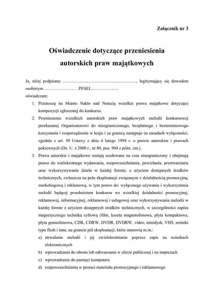 Załącznik nr 3 Oświadczenie dotyczące przeniesienia autorskich praw majątkowych Ja, niżej podpisany ……………………………………………, legitymujący się dowodem osobistym ……………………PESEL………………. oświadczam: 1. Przenoszę na Miasto Nakło nad Notecią wszelkie prawa majątkowe dotyczące kompozycji zgłoszonej do konkursu. 2. Przeniesienie wszelkich autorskich praw majątkowych melodii konkursowej przekazanej Organizatorowi do nieograniczonego, bezpłatnego i bezterminowego korzystania i rozporządzenia w kraju i za granicą następuje na zasadach wyłączności, zgodnie z art. 50 Ustawy z dnia 4 lutego 1994 r. o prawie autorskim i prawach pokrewnych (Dz. U. z 2000 r., nr 80, poz. 904 z późn. zm.). 3. Prawa autorskie i majątkowe zostają scedowane na czas nieograniczony i obejmują prawo do wielokrotnego wydawania, rozpowszechniania, powielania, przetwarzania oraz wykorzystywanie dzieła w każdej formie, z użyciem dostępnych środków technicznych, zwłaszcza na polu eksploatacji związanym z działalnością promocyjną, marketingową i reklamową, w tym prawo do: wyłącznego używania i wykorzystania melodii będącej przedmiotem konkursu we wszelkiej działalności promocyjnej, reklamowej, informacyjnej, reklamowej i usługowej oraz wykorzystywania melodii w każdej formie z użyciem dostępnych środków technicznych, w szczególności zapisu magnetycznego techniką cyfrową (film, kaseta magnetofonowa, płyta kompaktowa, płyta gramofonowa, CDR, CDRW, DVDR, DVDRW, video, minidysk, VHS, nośniki typu flesh i inne, na gruncie pól eksploatacji, które stanowią m.in.: a) utrwalanie melodii i jej zwielokrotnianie poprzez zapis na nośnikach elektronicznych b) wprowadzania do obrotu lub odtwarzania w sferze publicznej i na imprezach c) wprowadzenie do pamięci komputera d) rozpowszechniania w postaci materiału promocyjnego i reklamowego e) nadawanie za pomocą wizji przewodowej lub bezprzewodowej przez stację naziemną f) nadawanie za pośrednictwem satelity, równoczesne i integralne badanie utworu nadawanego przez inną organizację telewizyjną g) rozpowszechnianie poprzez Internet, Intranet, Extranet i inne dostępne sieci komputerowe 4. Zrzekam się prawa zezwalania na wykonywanie zależnego prawa autorskiego. 5. Przekazana przeze mnie w formie zapisu nutowego kompozycja staje się własnością miasta Nakło nad Notecią. 6. Zostając laureatem konkursu zobowiązuję się do nie zgłaszania żadnych roszczeń względem Organizatora konkursu z tytułu wykorzystywania przez niego melodii dostarczonej na konkurs. 7. Niniejsze oświadczenie rodzi skutki prawne z chwilą wygrania przeze mnie konkursu. Data Czytelny podpis