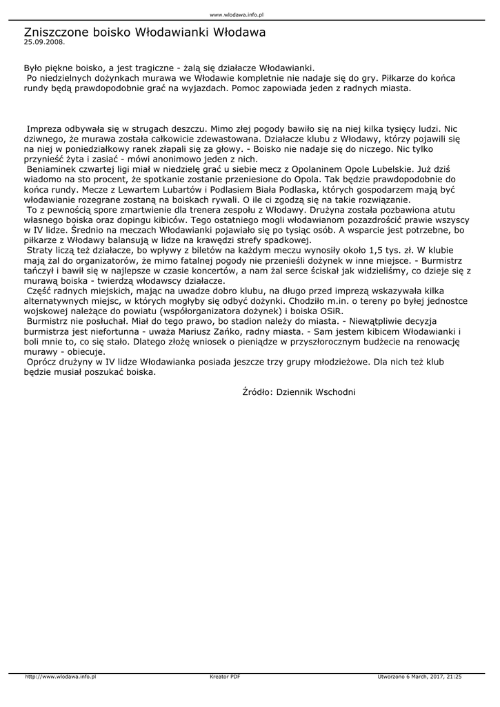 www.wlodawa.info.pl Zniszczone boisko Włodawianki Włodawa 25.09.2008. Było piękne boisko, a jest tragiczne - żalą się działacze Włodawianki. Po niedzielnych dożynkach murawa we Włodawie kompletnie nie nadaje się do gry. Piłkarze do końca rundy będą prawdopodobnie grać na wyjazdach. Pomoc zapowiada jeden z radnych miasta. Impreza odbywała się w strugach deszczu. Mimo złej pogody bawiło się na niej kilka tysięcy ludzi. Nic dziwnego, że murawa została całkowicie zdewastowana. Działacze klubu z Włodawy, którzy pojawili się na niej w poniedziałkowy ranek złapali się za głowy. - Boisko nie nadaje się do niczego. Nic tylko przynieść żyta i zasiać - mówi anonimowo jeden z nich. Beniaminek czwartej ligi miał w niedzielę grać u siebie mecz z Opolaninem Opole Lubelskie. Już dziś wiadomo na sto procent, że spotkanie zostanie przeniesione do Opola. Tak będzie prawdopodobnie do końca rundy. Mecze z Lewartem Lubartów i Podlasiem Biała Podlaska, których gospodarzem mają być włodawianie rozegrane zostaną na boiskach rywali. O ile ci zgodzą się na takie rozwiązanie. To z pewnością spore zmartwienie dla trenera zespołu z Włodawy. Drużyna została pozbawiona atutu własnego boiska oraz dopingu kibiców. Tego ostatniego mogli włodawianom pozazdrościć prawie wszyscy w IV lidze. Średnio na meczach Włodawianki pojawiało się po tysiąc osób. A wsparcie jest potrzebne, bo piłkarze z Włodawy balansują w lidze na krawędzi strefy spadkowej. Straty liczą też działacze, bo wpływy z biletów na każdym meczu wynosiły około 1,5 tys. zł. W klubie mają żal do organizatorów, że mimo fatalnej pogody nie przenieśli dożynek w inne miejsce. - Burmistrz tańczył i bawił się w najlepsze w czasie koncertów, a nam żal serce ściskał jak widzieliśmy, co dzieje się z murawą boiska - twierdzą włodawscy działacze. Część radnych miejskich, mając na uwadze dobro klubu, na długo przed imprezą wskazywała kilka alternatywnych miejsc, w których mogłyby się odbyć dożynki. Chodziło m.in. o tereny po byłej jednostce wojskowej należące do powiatu (współorganizatora dożynek) i boiska OSiR. Burmistrz nie posłuchał. Miał do tego prawo, bo stadion należy do miasta. - Niewątpliwie decyzja burmistrza jest niefortunna - uważa Mariusz Zańko, radny miasta. - Sam jestem kibicem Włodawianki i boli mnie to, co się stało. Dlatego złożę wniosek o pieniądze w przyszłorocznym budżecie na renowację murawy - obiecuje. Oprócz drużyny w IV lidze Włodawianka posiada jeszcze trzy grupy młodzieżowe. Dla nich też klub będzie musiał poszukać boiska. Źródło: Dziennik Wschodni http://www.wlodawa.info.pl Kreator PDF Utworzono 6 March, 2017, 21:25