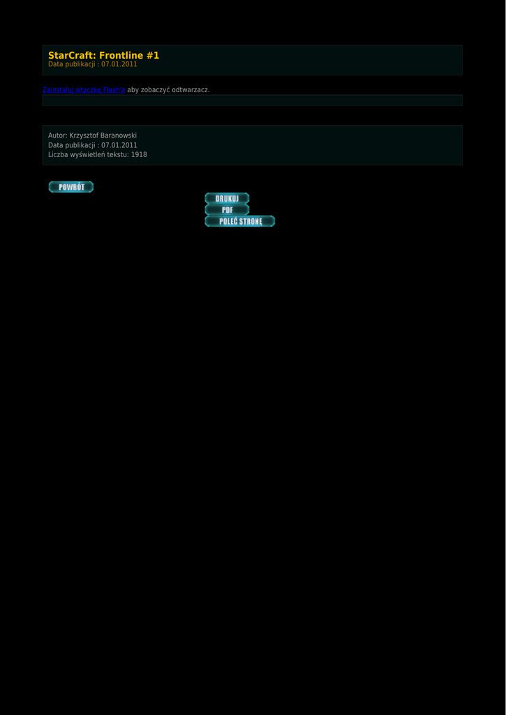 StarCraft: Frontline #1 Data publikacji : 07.01.2011 Zainstaluj wtyczkę Flash'a aby zobaczyć odtwarzacz. Autor: Krzysztof Baranowski Data publikacji : 07.01.2011 Liczba wyświetleń tekstu: 1918