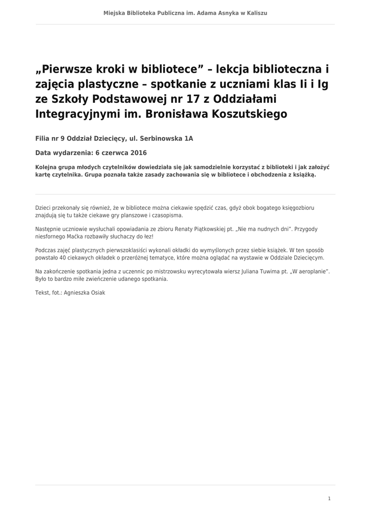 Miejska Biblioteka Publiczna im. Adama Asnyka w Kaliszu „Pierwsze kroki w bibliotece” – lekcja biblioteczna i zajęcia plastyczne – spotkanie z uczniami klas Ii i Ig ze Szkoły Podstawowej nr 17 z Oddziałami Integracyjnymi im. Bronisława Koszutskiego Filia nr 9 Oddział Dziecięcy, ul. Serbinowska 1A Data wydarzenia: 6 czerwca 2016 Kolejna grupa młodych czytelników dowiedziała się jak samodzielnie korzystać z biblioteki i jak założyć kartę czytelnika. Grupa poznała także zasady zachowania się w bibliotece i obchodzenia z książką. Dzieci przekonały się również, że w bibliotece można ciekawie spędzić czas, gdyż obok bogatego księgozbioru znajdują się tu także ciekawe gry planszowe i czasopisma. Następnie uczniowie wysłuchali opowiadania ze zbioru Renaty Piątkowskiej pt. „Nie ma nudnych dni”. Przygody niesfornego Maćka rozbawiły słuchaczy do łez! Podczas zajęć plastycznych pierwszoklasiści wykonali okładki do wymyślonych przez siebie książek. W ten sposób powstało 40 ciekawych okładek o przeróżnej tematyce, które można oglądać na wystawie w Oddziale Dziecięcym. Na zakończenie spotkania jedna z uczennic po mistrzowsku wyrecytowała wiersz Juliana Tuwima pt. „W aeroplanie”. Było to bardzo miłe zwieńczenie udanego spotkania. Tekst, fot.: Agnieszka Osiak 1