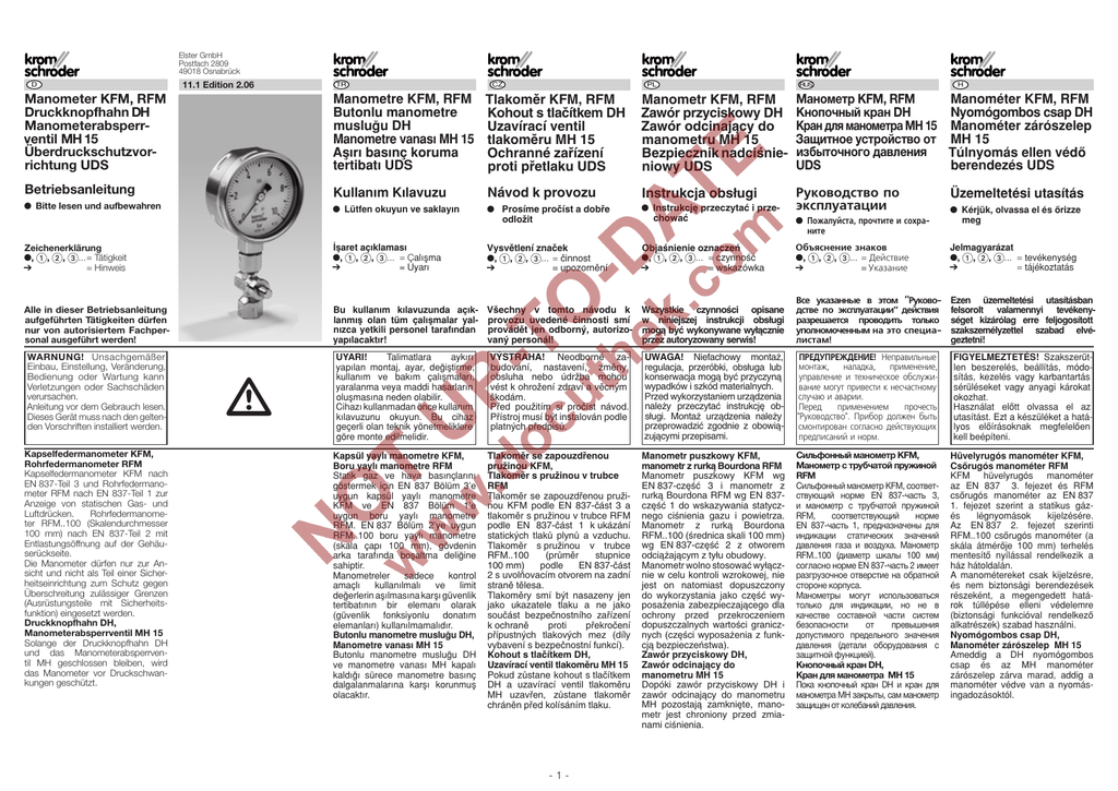 TR TR Elster GmbH Postfach 2809 49018 Osnabrück D Manometer KFM, RFM GB Druckknopfhahn DH F Manometerabsperr ventil MH 15 NL Überdruckschutzvor I richtung UDS E 11.1 Edition 2.06 TR TR Manometre KFM, RFM CZ Butonlu manometre PL musluπu DH Manometre vanas∂ MH 15 RUS Aµ∂r∂ bas∂nç koruma H tertibat∂ UDS SK Betriebsanleitung Kullan∂m K∂lavuzu Bitte lesen und aufbewahren Lütfen okuyun ve saklay∂n CZ TR CZ PL CZ PL RUS RUS H PL Tlakomûr KFM, RFM PL Kohout s tlaãítkem DH RUS Uzavírací ventil H tlakomûru MH 15 Ochranné zafiízení SK proti pfietlaku UDS Návod k provozu CZ Manometr KFM, RFM RUS Zawór przyciskowy DH H Zawór odcinajàcy do SK manometru MH 15 Bezpiecznik nadciÊnie niowy UDS Манометр KFM, RFM Manométer KFM, RFM SK H Кнопочный кран DH Nyomógombos csap DH SK Кран для манометра MH 15 Manométer zárószelep Защитное устройство от MH 15 избыточного давления Túlnyomás ellen védœ UDS berendezés UDS Instrukcja obs∏ugi Prosíme proãíst a dobfie odloÏit Instrukcj´ przeczytaç i prze chowaç Vysvûtlení znaãek , , , ... = ãinnost = upozornûní ObjaÊnienie oznaczeƒ , , , ... = czynnoÊç = wskazówka Zeichenerklärung , , , ...= Tätigkeit = Hinweis ∑µaret aç∂klamas∂ , , , ... = Çal∂µma = Uyar∂ Alle in dieser Betriebsanleitung aufgeführten Tätigkeiten dürfen nur von autorisiertem Fachper sonal ausgeführt werden! Bu kullan∂m k∂lavuzunda aç∂k V‰echny v tomto návodu k Wszystkie czynnoÊci opisane lanm∂µ olan tüm çal∂µmalar yal provozu uvedené ãinnosti smí w niniejszej instrukcji obs∏ugi n∂zca yetkili personel taraf∂ndan provádût jen odborn˘, autorizo mogà byç wykonywane wy∏àcznie van˘ personál! yap∂lacakt∂r! przez autoryzowany serwis! , Üzemeltetési utasítás Kérjük, olvassa el és œrizze meg , , , ... = = Jelmagyarázat , , , ... = tevékenység = tájékoztatás “ ” ! Ezen üzemeltetési utasításban felsorolt valamennyi tevékeny séget kizárólag erre feljogosított szakszemélyzettel szabad elvé geztetni! WARNUNG! Unsachgemäßer Einbau, Einstellung, Veränderung, Bedienung oder Wartung kann Verletzungen oder Sachschäden verursachen. Anleitung vor dem Gebrauch lesen. Dieses Gerät muss nach den gelten den Vorschriften installiert werden. UYARI! Talimatlara ayk∂r∂ yap∂lan montaj, ayar, deπiµtirme, kullan∂m ve bak∂m çal∂µmalar∂, yaralanma veya maddi hasarlar∂n oluµmas∂na neden olabilir. Cihaz∂ kullanmadan önce kullan∂m k∂lavuzunu okuyun. Bu cihaz geçerli olan teknik yönetmeliklere göre monte edilmelidir. V¯STRAHA! Neodborné za budování, nastavení, zmûny, obsluha nebo údrÏba mohou vést k ohroÏení zdraví a vûcn˘m ‰kodám. Pfied pouÏitím si proãíst návod. Pfiístroj musí b˘t instalován podle platn˘ch pfiedpisÛ. UWAGA! Niefachowy monta˝, regulacja, przeróbki, obs∏uga lub konserwacja mogà byç przyczynà wypadków i szkód materialnych. Przed wykorzystaniem urzàdzenia nale˝y przeczytaç instrukcj´ obs∏ugi. Monta˝ urzàdzenia nale˝y przeprowadziç zgodnie z obowià zujàcymi przepisami. ! , , , . "". . FIGYELMEZTETÉS! Szakszeræt len beszerelés, beállítás, módo sítás, kezelés vagy karbantartás sérüléseket vagy anyagi károkat okozhat. Használat elœtt olvassa el az utasítást. Ezt a készüléket a hatályos elœírásoknak megfelelœen kell beépíteni. Kapselfedermanometer KFM, Rohrfedermanometer RFM KFM nach EN 837-Teil 3 und Rohrfedermanometer RFM nach EN 837-Teil 1 zur Anzeige von statischen Gas- und Luftdrücken. Rohrfedermanometer RFM..100 (Skalendurchmesser 100 mm) nach EN 837-Teil 2 mit Entlastungsöffnung auf der Gehäuserückseite. Die Manometer dürfen nur zur Ansicht und nicht als Teil einer Sicherheitseinrichtung zum Schutz gegen Überschreitung zulässiger Grenzen (Ausrüstungsteile mit Sicherheitsfunktion) eingesetzt werden. Druckknopfhahn DH, Manometerabsperrventil MH 15 Solange der Druckknopfhahn DH und das Manometerabsperrventil MH geschlossen bleiben, wird das Manometer vor Druckschwankungen geschützt. Kapsül yayl∂ manometre KFM, Boru yayl∂ manometre RFM Statik gaz ve hava bas∂nçlar∂n∂ göstermek için EN 837 Bölüm 3’e uygun kapsül yayl∂ manometre KFM ve EN 837 Bölüm 1’e uygun boru yayl∂ manometre RFM. EN 837 Bölüm 2’ye uygun RFM..100 boru yayl∂ manometre (skala çap∂ 100 mm), gövdenin arka taraf∂nda boµaltma deliπine sahiptir. Manometreler sadece kontrol amaçl∂ kullan∂lmal∂ ve limit deπerlerin aµ∂lmas∂na karµ∂ güvenlik tertibat∂n∂n bir eleman∂ olarak (güvenlik fonksiyonlu donat∂m elemanlar∂) kullan∂lmamal∂d∂r. Butonlu manometre musluπu DH, Manometre vanas∂ MH 15 Butonlu manometre musluπu DH ve manometre vanas∂ MH kapal∂ kald∂π∂ sürece manometre bas∂nç dalgalanmalar∂na karµ∂ korunmuµ olacakt∂r. Tlakomûr se zapouzdfienou pruÏinou KFM, Tlakomûr s pruÏinou v trubce RFM Tlakomûr se zapouzdfienou pruÏi nou KFM podle EN 837-ãást 3 a tlakomûr s pruÏinou v trubce RFM podle EN 837-ãást 1 k ukázání statick˘ch tlakÛ plynÛ a vzduchu. Tlakomûr s pruÏinou v trubce RFM..100 (prÛmûr stupnice 100 mm) podle EN 837-ãást 2 s uvolÀovacím otvorem na zadní stranû tûlesa. Tlakomûry smí b˘t nasazeny jen jako ukazatele tlaku a ne jako souãást bezpeãnostního zafiízení k ochranû proti pfiekroãení pfiípustn˘ch tlakov˘ch mez (díly vybavení s bezpeãnostní funkcí). Kohout s tlaãítkem DH, Uzavírací ventil tlakomûru MH 15 Pokud zÛstane kohout s tlaãítkem DH a uzavírací ventil tlakomûru MH uzavfien, zÛstane tlakomûr chránûn pfied kolísáním tlaku. Manometr puszkowy KFM, manometr z rurkà Bourdona RFM Manometr puszkowy KFM wg EN 837-cz´Êç 3 i manometr z rurkà Bourdona RFM wg EN 837cz´Êç 1 do wskazywania statycz nego ciÊnienia gazu i powietrza. Manometr z rurkà Bour