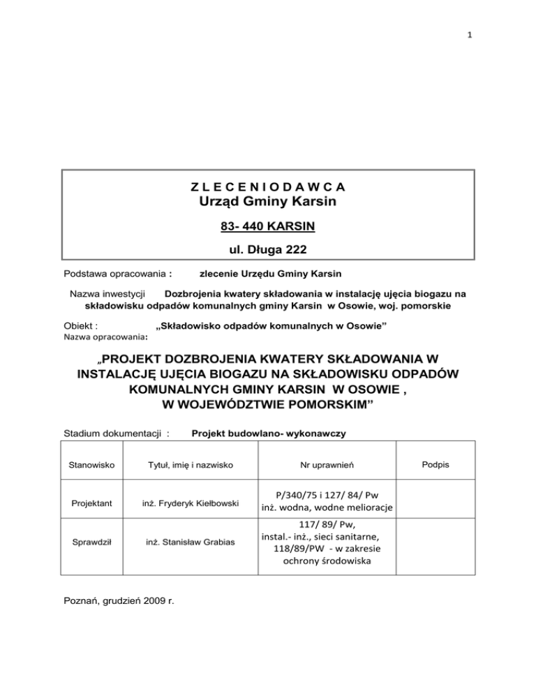 1 ZLECENIODAWCA Urząd Gminy Karsin 83- 440 KARSIN ul. Długa 222 Podstawa opracowania : zlecenie Urzędu Gminy Karsin Nazwa inwestycji Dozbrojenia kwatery składowania w instalację ujęcia biogazu na składowisku odpadów komunalnych gminy Karsin w Osowie, woj. pomorskie Obiekt : „Składowisko odpadów komunalnych w Osowie” Nazwa opracowania: „PROJEKT DOZBROJENIA KWATERY SKŁADOWANIA W INSTALACJĘ UJĘCIA BIOGAZU NA SKŁADOWISKU ODPADÓW KOMUNALNYCH GMINY KARSIN W OSOWIE , W WOJEWÓDZTWIE POMORSKIM” Stadium dokumentacji : Projekt budowlano- wykonawczy Stanowisko Tytuł, imię i nazwisko Nr uprawnień Projektant inż. Fryderyk Kiełbowski P/340/75 i 127/ 84/ Pw inż. wodna, wodne melioracje Sprawdził inż. Stanisław Grabias Poznań, grudzień 2009 r. 117/ 89/ Pw, instal.- inż., sieci sanitarne, 118/89/PW - w zakresie ochrony środowiska Podpis 2 OŚWIADCZENIE PROJEKTANTA I SPRAWDZAJĄCEGO Urząd Gminy Karsin Zamawiający 83- 440 KARSIN Ul. Długa 222 Przedmiot umowy: „PROJEKT DOZBROJENIA KWATERY SKŁADOWANIA W INSTALACJĘ UJĘCIA BIOGAZU NA SKŁADOWISKU ODPADÓW KOMUNALNYCH GMINY KARSIN W OSOWIE , W WOJEWÓDZTWIE POMORSKIM” Stadium dokumentacji PROJEKT BUDOWLANO- WYKONAWCZY PROJEKTANT: Oświadczam, że zgodnie z art. 20, ust. 4 Ustawy z dnia 7 lipca 1994 r. Prawo Budowlane ( Tekst jednolity: DZ. U. z 2006 r. Nr 156, poz. 1118, z późniejszymi zmianami), opracowana dokumentacja projektowa jest kompletna, została wykonana zgodnie z obowiązującymi przepisami oraz zasadami wiedzy technicznej , a nadto w stanie kompletnym z punktu widzenia celu, któremu dokumentacja ma służyć. inż. Fryderyk Kiełbowski upr. Nr 340/ 75 – inż. wodna upr. Nr 127/ 84/ Pw – melioracje wodne …………………………………………………………………… SPRAWDZAJĄCY: podpis Projektanta Oświadczam, że zgodnie z art. 20, ust. 4 Ustawy z dnia 7 lipca 1994 r. Prawo Budowlane ( Tekst jednolity: DZ. U. z 2006 r. Nr 156, poz. 1118, z późniejszymi zmianami), opracowana dokumentacja projektowa jest kompletna, została wykonana zgodnie z obowiązującymi przepisami oraz zasadami wiedzy technicznej , a nadto w stanie kompletnym z punktu widzenia celu, któremu dokumentacja ma służyć. inż. Stanisław Grabias upr. Nr 190/ 77 – konstrukcje budowlane upr. Nr 536/73/P –inżynieria wodna …………………………………………………………………… podpis Sprawdzającego 3 SPIS TREŚCI 1.0 PODSTAWOWE INFORMACJE CHARAKTERYZUJĄCE INWESTYCJĘ………………………… 4 1.1 1.2 1.3 1.4 1.5 1.6 1.7 2.0 ROZWIĄZANIA PROJEKTOWE…………………………………………………………………………………8 2.1 2.2 2.3 3.0 Podstawa opracowania………………………………………….……………………………………….5 Lokalizacja składowiska…………………………………………………………………………………..5 Wykorzystane materiały i prace studialne…………………………………………………… .5 Istniejący stan zagospodarowania terenu……………………………………………………….6 Warunki hydrogeologiczne występujące w rejonie lokalizacji składowiska……..7 Sąsiedztwo obszarów podlegających ochronie……………………………………………….8 Podstawowe dane charakteryzujące warunki klimatyczno- meteorologiczne..8 Przyjęte założenia i uzasadnienie przyjętych rozwiązań projektowych…………..8 Rozwiązania projektowe……………………………………………………………………………….12 Wbudowanie studni ujęcia gazów wysypiskowych w złoże odpad. kwatery…13 WYTYCZNE DO REKULTYWACJI KOŃCOWEJ EKSPLOATOWANEJ KWATERY………….17 4 OPIS TECHNICZNY DOZBROJENIA KWATERY SKŁADOWANIA W INSTALACJĘ UJĘCIA BIOGAZU NA SKŁADOWISKU ODPADÓW KOMUNALNYCH GMINY KARSIN W OSOWIE W WOJEWÓDZTWIE POMORSKIM . 1.0 PODSTAWOWE INFORMACJE CHARAKTERYZUJĄCE INWESTYCJĘ. Jednostka miary 3. Ilość jednostek miary 4. ha 2,535 ha m3 1,05 ≈ 50 000 Objętość złożonych odpadów komunalnych w okresie VI.1995 – X. 2009 Średnia objętość składowanych w roku odpadów m3 23 430 m3 ≈ 1 700 1.5 Przewidywana maksymalna chłonność istniejącej kwatery składowania do wykorzystania m3 13 300 1.6 Przewidywany okres eksploatacji istniejącej kwatery przy składowaniu średnim objętości w roku V ≈ 1 700 m3 /rok odpadów lat ≈ 7,8 m3 527 m3 764 m2 955 studz. 3 Lp. Wyszczególnienie 1. 2. Cz.I Charakterystyka ogólna 1.0 1.1 1.2 1.3 1.4 Powierzchnia terenu przeznaczona pod składowisko Powierzchnia składowania odpadów uszczelniona folią PEHD o grubości 1,5 mm Projektowana chłonność składowiska Cz. II Projektowany zakres robót budowlanomontażowych 2.0 Usunięcie z koron obwałowań kwatery złożonych odpadów komunalnych 2.1 Zamknięcie powierzchni skarp uformowanej hałdy odpadów 0,80 m warstwą gruntów mineralnych słabo spoistych- piasków gliniastych (Pg), glin piaszczystych (Gp) lub ich mieszaniną (Pg //Gp) 2.2 Obsiew skarp mieszanką traw na 10 cm warstwie humusu 2.3 Wykonanie warsztatowe obudów kroczących studzienek ujęcia biogazu z biofiltrami z rur stalowych Ф 813/11 o długości 2,50 m i wbudowanie ich w złoże odpadów 5 1.1 PODSTAWA OPRACOWANIA. Podstawę opracowania stanowi zlecenie Urzędu Gminy Karsin którego siedziba znajduje się pod następującym adresem : 83 – 440 Karsin , ulica Długa 222 , woj. pomorskie. 1.2 LOKALIZACJA SKŁADOWISKA Gminne składowisko komunalne zlokalizowane jest w południowo – zachodniej części gminy Karsin w odległości około 1,0 km na zachód od zabudowań wsi Osowo , przy drodze gruntowej łączącej wieś Osowo z miejscowością Broda. Składowisko zlokalizowane jest na terenie lokalnego wyrobiska po żwirowego na działkach oznaczonych numerami ewidencyjnymi 274 i 275 – działki te stanowią własność Gminy Karsin. Składowisko o powierzchni F = 2,53
