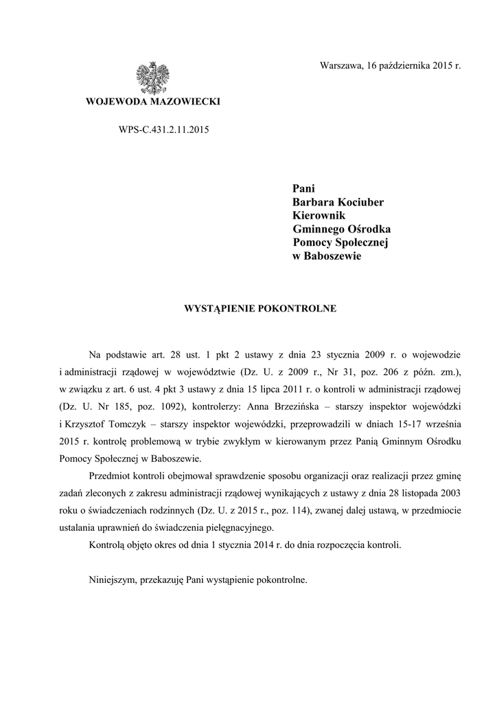 Warszawa, 16 października 2015 r. WOJEWODA MAZOWIECKI WPS-C.431.2.11.2015 Pani Barbara Kociuber Kierownik Gminnego Ośrodka Pomocy Społecznej w Baboszewie WYSTĄPIENIE POKONTROLNE Na podstawie art. 28 ust. 1 pkt 2 ustawy z dnia 23 stycznia 2009 r. o wojewodzie i administracji rządowej w województwie (Dz. U. z 2009 r., Nr 31, poz. 206 z późn. zm.), w związku z art. 6 ust. 4 pkt 3 ustawy z dnia 15 lipca 2011 r. o kontroli w administracji rządowej (Dz. U. Nr 185, poz. 1092), kontrolerzy: Anna Brzezińska – starszy inspektor wojewódzki i Krzysztof Tomczyk – starszy inspektor wojewódzki, przeprowadzili w dniach 15-17 września 2015 r. kontrolę problemową w trybie zwykłym w kierowanym przez Panią Gminnym Ośrodku Pomocy Społecznej w Baboszewie. Przedmiot kontroli obejmował sprawdzenie sposobu organizacji oraz realizacji przez gminę zadań zleconych z zakresu administracji rządowej wynikających z ustawy z dnia 28 listopada 2003 roku o świadczeniach rodzinnych (Dz. U. z 2015 r., poz. 114), zwanej dalej ustawą, w przedmiocie ustalania uprawnień do świadczenia pielęgnacyjnego. Kontrolą objęto okres od dnia 1 stycznia 2014 r. do dnia rozpoczęcia kontroli. Niniejszym, przekazuję Pani wystąpienie pokontrolne. W trakcie kontroli ustalono, że zadania z zakresu ustawy Ośrodek realizuje na podstawie § 1 ust. 4 Statutu Gminnego Ośrodka Pomocy Społecznej w Baboszewie, wprowadzonego Uchwałą Nr XXV/210/2014 Rady Gminy Baboszewo z dnia 21 lutego 2014 roku. Na podstawie Statutu (§ 7) Zarządzeniem Nr 10/2014 z dnia 20 listopada 2014 roku wprowadziła Pani Regulamin organizacyjny Ośrodka. Dokument ten w § 2 ust. 2 lit. d wyodrębnia stanowisko ds. świadczeń rodzinnych i alimentacyjnych. Natomiast realizację kontrolowanych zadań szczegółowo opisano w § 5 ust. 4 Regulaminu. Jednostka kontrolowana nie zatrudnia głównego księgowego, a sprawy gospodarki finansowej reguluje § 26 ust. 4 Statutu, z którego wynika, że obsługę finansowo - księgową sprawuje Urząd Gminy w Baboszewie. W kwestii tej zawarto porozumienie w dniu 02 czerwca 2009 roku pomiędzy GOPS, reprezentowanym przez Panią, a Wójtem Gminy. Rozwiązanie to narusza jednak przepisy art. 54 ust. 1 ustawy z dnia 27 sierpnia 2009 roku o finansach publicznych (Dz. U. z 2013 r., poz. 885). Z dniem 1 stycznia 2013 roku kwestię ewidencjonowania, rejestrowania, znakowania oraz przechowywania dokumentacji reguluje nowa instrukcja kancelaryjna, jednolity rzeczowy wykaz akt oraz instrukcja w sprawie organizacji i zakresu działania składnicy akt. Powyższe wprowadzono Pani Zarządzeniem Nr 1/2012 z dnia 10 września 2012 roku, wydanym w porozumieniu z Dyrektorem Archiwum Miasta Stołecznego Warszawy, działającego z upoważnienia Naczelnego Dyrektora Archiwów Państwowych. Kontrolowane sprawy posiadają kategoryzację B10 oraz symbol klasyfikacyjny 5122. Teczki aktowe oznaczono zgodnie z uregulowaniami instrukcji kancelaryjnej, a każda sprawa znajduje się w oddzielnej teczce akt. Do spraw prowadzone są metryki, które w pełni odzwierciedlają ich przebieg. Ponadto na stanowisku merytorycznym prowadzona jest ewidencja świadczeń rodzinnych i świadczeń pielęgnacyjnych. Za okres objęty kontrolą Wojewoda Mazowiecki pozytywnie ocenił działania Gminnego Ośrodka Pomocy Społecznej w Baboszewie podjęte w zakresie sposobu organizacji zadania oraz w przedmiocie ustalania uprawnień do świadczenia pielęgnacyjnego. 1. Organizacja realizacji zadania. Jednoosobowe stanowisko pracy do spraw świadczeń rodzinnych wyodrębniono w strukturze organizacyjnej Ośrodka z dniem 26 listopada 2007 roku. Powyższe zgodne jest z przepisami art. 20 ust. 4 ustawy z dnia 28 listopada 2003 roku o świadczeniach rodzinnych. Ustawowe zadania realizuje Pani na podstawie upoważnienia Wójta Gminy do prowadzenia postępowań w sprawach świadczeń rodzinnych oraz do wydawania decyzji administracyjnych w tych sprawach, udzielonego dnia 11 grudnia 2014 roku. Pracownik merytoryczny, realizujący bezpośrednio kontrolowane zadania - Pani Anna Zdunowska (starszy referent ds. świadczeń rodzinnych i funduszu alimentacyjnego), posiada także upoważnienie Wójta Gminy z dnia jak wyżej, do prowadzenia postępowań w sprawach świadczeń rodzinnych oraz do wydawania w tych sprawach decyzji administracyjnych. Pani A. Zdunowska zatrudniona została od dnia 15 lutego 2008 roku na czas nieokreślony w pełnym wymiarze czasu pracy. Posiada aktualny zakres czynności, w którym szczegółowo określono realizację kontrolowanych zadań. 2. Ustalanie uprawnień do świadczenia pielęgnacyjnego. W trakcie kontroli analizie poddano losowo wybrane akta 20 spraw (69% całości spraw) z okresu podlegającego kontroli, zakończonych wydaniem decyzji administracyjnych. W 18 przypadkach wnioski o przyznanie świadczenia pielęgnacyjnego były kompletne, zawierając w swojej treści wszystkie niezbędne elementy. Do wniosków, opatrzonych pieczęcią z datą wpływu i podpisem osoby przyjmującej, wnioskodawcy dołączali wszelkie wymagane prawem zaświadczenia, oświadczenia i inne dokumenty konieczne do ustalenia prawa do świadczenia pielęgnacyjnego. Natomiast w dwóch sprawach, a mianowicie: GOPS.5122.3.8.2013 i GOPS.5122.3.3.2013, wnioskodawcy nie dołączyli do wniosku zaświadczenia albo oświadczenia, o którym mowa w § 3 pkt 4 rozporządzenia wykonawczego do ustawy (załącznik nr 12). Brak ten uzupełniono w czasie trwania kontroli, tj. w dniu 16 września 2015 roku – wnioskodawcy złożyli oświadczenia, o których mowa wyżej. Prawo do świadczenia pielęgnacyjnego ustalano na czas określony, oznaczony w orzeczeniu o niepełnosprawności lub na czas nieoznaczony, jeżeli wynikało to z orzeczenia o niepełnosprawności. Początek i koniec wypłaty świadczeń ustalono w sposób zgodny z przepisami. W analizowanych sprawach świadczenie pielęgnacyjne przyznano i wypłacono 20 osobom, tj. rodzicom którzy nie podjęli lub zrezygn
