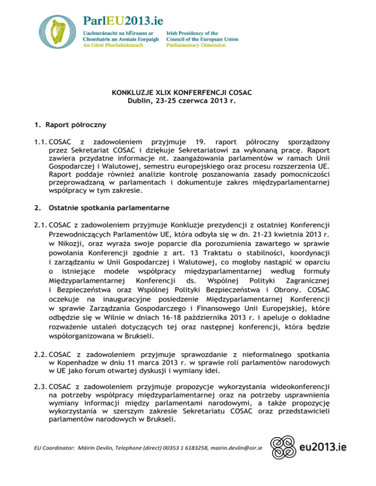 KONKLUZJE XLIX KONFERFENCJI COSAC Dublin, 23-25 czerwca 2013 r. 1. Raport półroczny 1.1. COSAC z zadowoleniem przyjmuje 19. raport półroczny sporządzony przez Sekretariat COSAC i dziękuje Sekretariatowi za wykonaną pracę. Raport zawiera przydatne informacje nt. zaangażowania parlamentów w ramach Unii Gospodarczej i Walutowej, semestru europejskiego oraz procesu rozszerzenia UE. Raport poddaje również analizie kontrolę poszanowania zasady pomocniczości przeprowadzaną w parlamentach i dokumentuje zakres międzyparlamentarnej współpracy w tym zakresie. 2. Ostatnie spotkania parlamentarne 2.1. COSAC z zadowoleniem przyjmuje Konkluzje prezydencji z ostatniej Konferencji Przewodniczących Parlamentów UE, która odbyła się w dn. 21-23 kwietnia 2013 r. w Nikozji, oraz wyraża swoje poparcie dla porozumienia zawartego w sprawie powołania Konferencji zgodnie z art. 13 Traktatu o stabilności, koordynacji i zarządzaniu w Unii Gospodarczej i Walutowej, co mogłoby nastąpić w oparciu o istniejące modele współpracy międzyparlamentarnej według formuły Międzyparlamentarnej Konferencji ds. Wspólnej Polityki Zagranicznej i Bezpieczeństwa oraz Wspólnej Polityki Bezpieczeństwa i Obrony. COSAC oczekuje na inauguracyjne posiedzenie Międzyparlamentarnej Konferencji w sprawie Zarządzania Gospodarczego i Finansowego Unii Europejskiej, które odbędzie się w Wilnie w dniach 16-18 października 2013 r. i apeluje o dokładne rozważenie ustaleń dotyczących tej oraz następnej konferencji, która będzie współorganizowana w Brukseli. 2.2. COSAC z zadowoleniem przyjmuje sprawozdanie z nieformalnego spotkania w Kopenhadze w dniu 11 marca 2013 r. w sprawie roli parlamentów narodowych w UE jako forum otwartej dyskusji i wymiany idei. 2.3. COSAC z zadowoleniem przyjmuje propozycje wykorzystania wideokonferencji na potrzeby współpracy międzyparlamentarnej oraz na potrzeby usprawnienia wymiany informacji między parlamentami narodowymi, a także propozycję wykorzystania w szerszym zakresie Sekretariatu COSAC oraz przedstawicieli parlamentów narodowych w Brukseli. EU Coordinator: Máirín Devlin, Telephone (direct) 00353 1 6183258, [email protected] 2.4. COSAC odnotowuje ważną rolę parlamentów narodowych w krajowych procesach decyzyjnych w sprawach UE. Wiele państw wypracowało metody i procedury dotyczące włączenia spraw UE do codziennego funkcjonowania i pracy parlamentów narodowych. Te doświadczenia i dobre praktyki mogą stanowić inspirację dla innych w zakresie usprawniania kontroli spraw UE i wzmacniania odpowiedzialności również na poziomie narodowym 3. Rzeczywista Unia Gospodarcza i Walutowa 3.1. COSAC odnotowuje, że w większości parlamentów toczy się aktywna debata na temat najważniejszych dokumentów UGW i większość parlamentów w taki lub inny sposób monitoruje spotkania i/lub konkluzje z posiedzeń Rady Europejskiej. COSAC uważa, że należy zrobić więcej dla rozwoju debaty międzyparlamentarnej dotyczącej tych kwestii oraz szerzej, na temat fundamentalnych zagadnień demokracji w UE. COSAC wzywa przyszłe prezydencje do opracowania najlepszej metody wspierania takiej debaty, szczególnie w kontekście nowej konferencji na podstawie art. 13 Traktatu o stabilności, koordynacji i zarządzaniu w Unii Gospodarczej i Walutowej. 3.2. COSAC zachęca parlamenty do większego wykorzystania istniejących narzędzi oraz do opracowywania nowych mechanizmów na poziomie narodowym i europejskim, tak aby zapewnić demokratyczną legitymizację UGW, a w szczególności, aby zapewnić, że demokratyczna legitymizacja i odpowiedzialność pozostają na poziomie, na którym są podejmowane i wdrażane decyzje. 3.3. COSAC zachęca Parlament Europejski oraz parlamenty narodowe sprawujące prezydencję w Radzie UE w pierwszej połowie roku do przeanalizowania konstruktywnych komentarzy zawartych w 19. raporcie półrocznym w związku z organizacją „Europejskiego tygodnia parlamentarnego”. 4. Wymiana informacji między parlamentami w sprawie kontroli poszanowania zasady pomocniczości 4.1. COSAC z zadowoleniem przyjmuje ciągły rozwój procedur i praktyk związanych z kontrolą poszanowania zasady pomocniczości. Należy w szczególności podkreślić wzrost wymiany informacji pomiędzy administracjami poszczególnych parlamentów, większą współpracę pomiędzy przedstawicielami parlamentów narodowych w Brukseli oraz stałą wysoką frekwencję na konferencjach międzyparlamentarnych. 4.2. COSAC z zadowoleniem przyjmuje istotny wzrost wymiany informacji pomiędzy parlamentami i izbami na temat kontroli poszanowania zasady pomocniczości, z zastosowaniem różnych metod i sieci wymiany informacji, w szczególności bazy EU Coordinator: Máirín Devlin, Telephone (direct) 00353 1 6183258, [email protected] danych IPEX oraz przedstawicieli parlamentów narodowych w Brukseli. COSAC wyraża zadowolenie z powodu skutecznej intensyfikacji międzyparlamentarnej wymiany informacji od momentu wejścia w życie Traktatu z Lizbony, która w wielu wypadach przekłada się na konkretne wyniki w zakresie kontroli poszanowania zasady pomocniczości. COSAC przypomina parlamentom narodowym o znaczeniu skutecznego przeprowadzania kontroli poszanowania zasady pomocniczości i zachęca do współpracy w celu osiągnięcia, gdy jest to właściwe, progów przez parlamenty narodowe. 4.3. W kontekście tej zwiększonej wymiany informacji, COSAC odnotowuje możliwość wprowadzenia dalszych usprawnień, takich jak: wymiana informacji pomiędzy parlamentami na jeszcze wcześniejszych etapach kontroli; poprawa zawartości strony internetowej IPEX, tak aby pokazywać istotne przyczyny złamania zasady pomocniczości oraz – w odniesieniu do parlamentów - zapewnić dokładną informację we właściwym czasie, a także publikowanie dokładniejszych streszczeń lub tłumaczeń istotnych dokumentów w języku angielskim i/lub francuskim; zwiększanie wymiany informacji międz