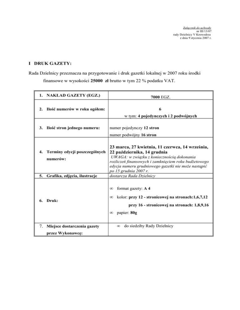 Załącznik do uchwały nr III/13/07 rady Dzielnicy V Krowodrza z dnia 9 stycznia 2007 r. I DRUK GAZETY: Rada Dzielnicy przeznacza na przygotowanie i druk gazetki lokalnej w 2007 roku środki finansowe w wysokości 25000 zł brutto w tym 22 % podatku VAT. 1. NAKŁAD GAZETY (EGZ.) 7000 EGZ. 2. Ilość numerów w roku ogółem: 6 w tym: 4 pojedynczych i 2 podwójnych 3. Ilość stron jednego numeru: numer pojedynczy 12 stron numer podwójny 16 stron 23 marca, 27 kwietnia, 11 czerwca, 14 września, 4. Terminy edycji poszczególnych 22 października, 14 grudnia numerów: 5. Grafika, zdjęcia, ilustracje 6. Druk: UWAGA: w związku z koniecznością dokonania rozliczeń finansowych i zamknięciem roku budżetowego edycja numeru grudniowego gazetki nie może nastąpić po 15 grudnia 2007 r. dostarcza Rada Dzielnicy • format gazety: A 4 • kolor: przy 12 - stronicowej na stronach:1,6,7,12 przy 16 - stronicowej na stronach: 1,8,9,16 • 7. Miejsce dostarczenia gazety przez Wykonawcę: papier: 80g • do siedziby Rady Dzielnicy II DRUKI DODATKOWE NUMERU SPECJALNEGO GAZETY, KALENDARZA ITP. NUMER SPECJALNY 1. NAKŁAD: 2. Ilość numerów : 3. Ilość stron: 4. Termin edycji: 5. Grafika, zdjęcia, ilustracje 6. 7. Druk: Miejsce dostarczenia przez Wykonawcę: 7000 EGZ. 2 16 23 marca, 14 grudnia – dostarcza Rada Dzielnicy • • • format: A4 kolor: 16 stronicowa na stronach: 1,8,9,16 papier: 80 g • do siedziby Rady Dzielnicy KALENDARZ 1. NAKŁAD: 2. Termin edycji: 3. Grafika: 4. Druk: ............................ EGZ • • • 5. Papier: 6. Miejsce dostarczenia kalendarza przez • Wykonawcę (niepotrzebne skreślić): • zapewnia Rada Dzielnicy format: ............................................................ kolor: .............................................................. Dwustronny / jednostronny do siedziby Rady Dzielnicy do kolportera DODATKOWE CZYNNOŚCI ZWIĄZANE BEZPOŚREDNIO Z PRZEDMIOTEM ZAMÓWIENIA: Np.: umieszczenie kalendarza wewnątrz numeru grudniowego, zszycie numeru 1 zszywką itp. ZSZYCIE NUMERU JEDNĄ ZSZYWKĄ!!! AKCEPTUJĘ Kraków, dn. 9 stycznia 2007 r. ....................................................................... Przewodniczący Rady i Zarządu Dzielnicy