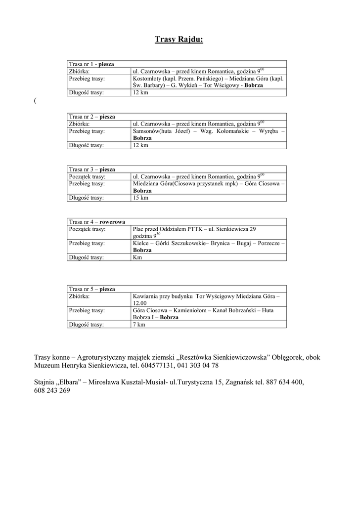 Trasy Rajdu: Trasa nr 1 - piesza Zbiórka: Przebieg trasy: Długość trasy: ul. Czarnowska – przed kinem Romantica, godzina 900 Kostomłoty (kapl. Przem. Pańskiego) – Miedziana Góra (kapl. Św. Barbary) – G. Wykień – Tor Wścigowy - Bobrza 12 km ( Trasa nr 2 – piesza Zbiórka: Przebieg trasy: Długość trasy: Trasa nr 3 – piesza Początek trasy: Przebieg trasy: Długość trasy: Trasa nr 4 – rowerowa Początek trasy: Przebieg trasy: Długość trasy: Trasa nr 5 – piesza Zbiórka: Przebieg trasy: Długość trasy: ul. Czarnowska – przed kinem Romantica, godzina 900 Samsonów(huta Józef) – Wzg. Kołomańskie – Wyręba – Bobrza 12 km ul. Czarnowska – przed kinem Romantica, godzina 900 Miedziana Góra(Ciosowa przystanek mpk) – Góra Ciosowa – Bobrza 15 km Plac przed Oddziałem PTTK – ul. Sienkiewicza 29 godzina 930 Kielce – Górki Szczukowskie– Brynica – Bugaj – Porzecze – Bobrza Km Kawiarnia przy budynku Tor Wyścigowy Miedziana Góra – 12.00 Góra Ciosowa – Kamieniołom – Kanał Bobrzański – Huta Bobrza I – Bobrza 7 km Trasy konne – Agroturystyczny majątek ziemski „Resztówka Sienkiewiczowska” Oblęgorek, obok Muzeum Henryka Sienkiewicza, tel. 604577131, 041 303 04 78 Stajnia „Elbara” – Mirosława Kusztal-Musiał- ul.Turystyczna 15, Zagnańsk tel. 887 634 400, 608 243 269