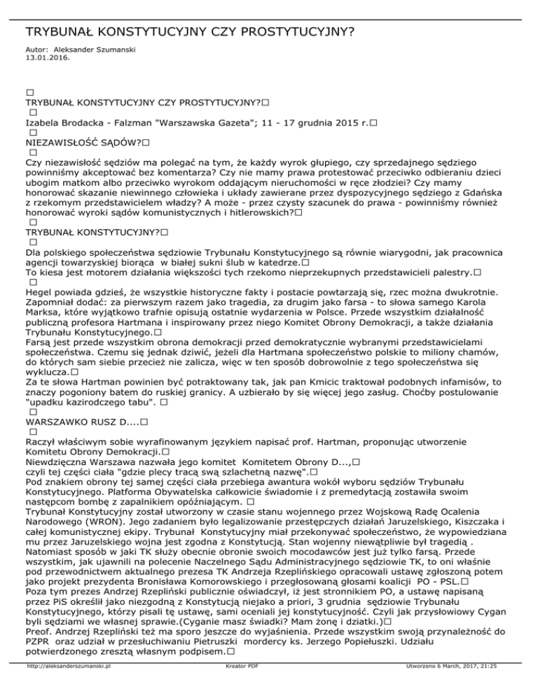 TRYBUNAŁ KONSTYTUCYJNY CZY PROSTYTUCYJNY? Autor: Aleksander Szumanski 13.01.2016. TRYBUNAŁ KONSTYTUCYJNY CZY PROSTYTUCYJNY? Izabela Brodacka - Falzman "Warszawska Gazeta"; 11 - 17 grudnia 2015 r. NIEZAWISŁOŚĆ SĄDÓW? Czy niezawisłość sędziów ma polegać na tym, że każdy wyrok głupiego, czy sprzedajnego sędziego powinniśmy akceptować bez komentarza? Czy nie mamy prawa protestować przeciwko odbieraniu dzieci ubogim matkom albo przeciwko wyrokom oddającym nieruchomości w ręce złodziei? Czy mamy honorować skazanie niewinnego człowieka i układy zawierane przez dyspozycyjnego sędziego z Gdańska z rzekomym przedstawicielem władzy? A może - przez czysty szacunek do prawa - powinniśmy również honorować wyroki sądów komunistycznych i hitlerowskich? TRYBUNAŁ KONSTYTUCYJNY? Dla polskiego społeczeństwa sędziowie Trybunału Konstytucyjnego są równie wiarygodni, jak pracownica agencji towarzyskiej biorąca w białej sukni ślub w katedrze. To kiesa jest motorem działania większości tych rzekomo nieprzekupnych przedstawicieli palestry. Hegel powiada gdzieś, że wszystkie historyczne fakty i postacie powtarzają się, rzec można dwukrotnie. Zapomniał dodać: za pierwszym razem jako tragedia, za drugim jako farsa - to słowa samego Karola Marksa, które wyjątkowo trafnie opisują ostatnie wydarzenia w Polsce. Przede wszystkim działalność publiczną profesora Hartmana i inspirowany przez niego Komitet Obrony Demokracji, a także działania Trybunału Konstytucyjnego. Farsą jest przede wszystkim obrona demokracji przed demokratycznie wybranymi przedstawicielami społeczeństwa. Czemu się jednak dziwić, jeżeli dla Hartmana społeczeństwo polskie to miliony chamów, do których sam siebie przecież nie zalicza, więc w ten sposób dobrowolnie z tego społeczeństwa się wyklucza. Za te słowa Hartman powinien być potraktowany tak, jak pan Kmicic traktował podobnych infamisów, to znaczy pogoniony batem do ruskiej granicy. A uzbierało by się więcej jego zasług. Choćby postulowanie "upadku kazirodczego tabu". WARSZAWKO RUSZ D.... Raczył właściwym sobie wyrafinowanym językiem napisać prof. Hartman, proponując utworzenie Komitetu Obrony Demokracji. Niewdzięczna Warszawa nazwała jego komitet Komitetem Obrony D..., czyli tej części ciała "gdzie plecy tracą swą szlachetną nazwę". Pod znakiem obrony tej samej części ciała przebiega awantura wokół wyboru sędziów Trybunału Konstytucyjnego. Platforma Obywatelska całkowicie świadomie i z premedytacją zostawiła swoim następcom bombę z zapalnikiem opóźniającym. Trybunał Konstytucyjny został utworzony w czasie stanu wojennego przez Wojskową Radę Ocalenia Narodowego (WRON). Jego zadaniem było legalizowanie przestępczych działań Jaruzelskiego, Kiszczaka i całej komunistycznej ekipy. Trybunał Konstytucyjny miał przekonywać społeczeństwo, że wypowiedziana mu przez Jaruzelskiego wojna jest zgodna z Konstytucją. Stan wojenny niewątpliwie był tragedią . Natomiast sposób w jaki TK służy obecnie obronie swoich mocodawców jest już tylko farsą. Przede wszystkim, jak ujawnili na polecenie Naczelnego Sądu Administracyjnego sędziowie TK, to oni właśnie pod przewodnictwem aktualnego prezesa TK Andrzeja Rzeplińskiego opracowali ustawę zgłoszoną potem jako projekt prezydenta Bronisława Komorowskiego i przegłosowaną głosami koalicji PO - PSL. Poza tym prezes Andrzej Rzepliński publicznie oświadczył, iż jest stronnikiem PO, a ustawę napisaną przez PiS określił jako niezgodną z Konstytucją niejako a priori, 3 grudnia sędziowie Trybunału Konstytucyjnego, którzy pisali tę ustawę, sami oceniali jej konstytucyjność. Czyli jak przysłowiowy Cygan byli sędziami we własnej sprawie.(Cyganie masz świadki? Mam żonę i dziatki.) Preof. Andrzej Rzepliński też ma sporo jeszcze do wyjaśnienia. Przede wszystkim swoją przynależność do PZPR oraz udział w przesłuchiwaniu Pietruszki mordercy ks. Jerzego Popiełuszki. Udziału potwierdzonego zresztą własnym podpisem. http://aleksanderszumanski.pl Kreator PDF Utworzono 6 March, 2017, 21:25 Profesor Andrzej Rzepliński wyszedł z sali sejmowej w proteście przeciwko ułaskawieniu Mariusza Kamińskiego. Czy nie widzi jak śmieszne są gesty Rejtana w wykonaniu przedstawicieli środowiska całkowicie skompromitowanego falandyzacją prawa, czyli naginaniem go do własnych interesów? Czy nie rozumie, że dla społeczeństwa sędziowie TK są równie wiarygodni, jak pracownica agencji towarzyskiej biorąca w białej sukni ślub w katedrze? Czy nie wie, że niezawodna publiczność warszawska nazywa Trybunał Konstytucyjny, Trybunałem Prostytucyjnym? Niejeden z nas, wychowany na paradygmacie niezawisłości sędziowskiej i trójpodziału władzy ma problemy z właściwą oceną wydarzeń. Czy niezawisłość sędziów ma jednak polegać na tym, że każdy wyrok głupiego, czy sprzedajnego sędziego powinniśmy akceptować bez komentarza? Nasz wieszcz Adam Mickiewicz nie miał kłopotów z właściwą diagnozą. To kiesa jest motorem działania większości tych rzekomo niezawisłych i rzekomo nieprzekupnych przedstawicieli palestry. Środowisko, które nie pozbyło się dyspozycyjnych sędziów ze stanu wojennego skazujących kiedyś opozycjonistów na wysokie wyroki, a teraz uwalniających gangsterów, czy też służących władzy i grupom interesów nie może liczyć na szacunek społeczeństwa. Śmieszność jest dominantą ostatniego gnicia PO, formacji która zdystansowała wszystkie inne nie tylko liczbą afer i zadłużeniem kraju, lecz przede wszyskim bezczelnością. Prezydent Komorowski ośmieszał się nie tylko brakami w ortografii i dobrym wychowaniu. Śmieszne i żałosne są w jego wydaniu nawet afery. Szabrowanie Pałacu Prezydenckiego i willi w Klarysewie to farsa. Trudno sobie wyobrazić prezydenta i jego urzędników wynoszących ukradkiem - jak odprawiona służąca ekspres do kawy czy f