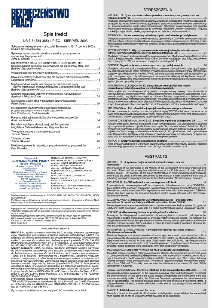 STRESZCZENIA BEZPIECZEÑSTWO PRACY 7-8/2003 Spis treci NR 7-8 (384-385) LIPIEC SIERPIEÑ 2003 Substancje niebezpieczne ostro¿nie! Seminarium, 16-17 czerwca 2003 r. Barbara Szczepankowska ................................................................................. 1 System przeciwdzia³ania powa¿nym awariom przemys³owym nowe regulacje prawne (1) Jerzy S. Michalik ................................................................................................ 5 OBRADOWA£A RADA OCHRONY PRACY PRZY SEJMIE RP Restrukturyzacja górnictwa nie przyczynia siê do poprawy stanu bhp Barbara Szczepankowska ................................................................................. 8 Wrêczono nagrody im. Haliny Krahelskiej ....................................................... 13 Serwis internetowy z dziedziny bhp dla polskich mikroprzedsiêbiorstw Ma³gorzata Suchecka ...................................................................................... 14 Miêdzynarodowe ród³a informacji o bezpieczeñstwie pracy witryna internetowa Miêdzynarodowego Centrum Informacji CIS Barbara Szczepanowska ................................................................................. 21 Centrum Tematyczne Dobrych Praktyk Krajów Kandyduj¹cych Agnieszka M³odzka-Stybel .............................................................................. 24 Sygnalizacja akustyczna w pojazdach uprzywilejowanych Pawe³ Górski ................................................................................................... 26 Metoda badañ skutecznoci akustycznej nauszników przeciwha³asowych w warunkach rzeczywistych Ewa Kotarbiñska, Emil Koz³owski ................................................................... 31 Potrzeba edukacji specjalistów bhp w ocenie pracodawców Anna Jakubowska ........................................................................................... 34 Biopaliwa w polityce ekologicznej Unii Europejskiej Magdalena Galwas-Zakrzewska, Zbigniew Makles ........................................ 40 Tworzywa sztuczne a zagro¿enie po¿arowe Tomasz Sawicki ............................................................................................... 43 2-Metylonaftalen Jolanta Skowroñ .............................................................................................. 46 Niektóre uprawnienia i obowi¹zki pracodawców oraz pracowników Ewa Zduñska ................................................................................................... 47 Miesiêcznik BEZPIECZEÑSTWO PRACY Nauka i Praktyka ukazuje siê od 1971 roku Wydawca: Centralny Instytut Ochrony Pracy Pañstwowy Instytut Badawczy Adres wydawcy i redakcji: 00-701 Warszawa ul. Czerniakowska 16 tel.: 623-36-75; fax: 623-36-93 http://www.ciop.pl/bp e-mail: [email protected] REDAGUJE ZESPÓ£ I KOMITET: doc. dr in¿. DANUTA AUGUSTYÑSKA mgr in¿. JÓZEF GIERASIMIUK dr hab. MARIA KONARSKA doc. dr HALINA PUCHALSKA mgr BARBARA SZCZEPANKOWSKA (red. nacz.) dr in¿. WIKTOR M. ZAWIESKA (przew. Komit.) URSZULA MANICKA, EL¯BIETA MAUER (red. tech.) Ok³adka: I str. fot. Alfred Brzozowski, II str. fot. Zbigniew Szarmach Wydawnictwo jest indeksowane w: CISDOC, HSELINE, NIOSHTIC, OSH-ROM, INDEX COPERNICUS Publikacje s¹ punktowane w ramach parametrycznej oceny jednostek w Zespole Nauk Medycznych P-05 Komitetu Badañ Naukowych Rêkopisów nie zamówionych redakcja nie zwraca. Zastrzega siê równie¿ prawo skracania materia³ów przeznaczonych do publikacji oraz dokonywania poprawek redakcyjnych. Artyku³y s¹ recenzowane. Redakcja przyjmuje p³atne og³oszenia, reklamy i wk³adki, za których treæ nie odpowiada. Sk³ad, przygotowalnia, druk i oprawa EFEKT 03-802 Warszawa, ul. Lubelska 30/32 Ark. wyd. 13, ark. druk. 4, format A4. Nak³ad 2600. Cena 1 egz. 20 z³ WARUNKI PRENUMERATY RUCH S.A.: wp³aty na okresy kwartalne do 5. ka¿dego miesi¹ca poprzedzaj¹cego rozpoczêcia prenumeraty przyjmuj¹ jednostki kolporta¿owe RUCH S.A. w³aciwe dla miejsca zamieszkania lub siedziby prenumeratora. Informacji o warunkach prenumeraty ze zleceniem dostawy za granicê udziela RUCH S.A. Oddzia³ Krajowej Dystrybucji Prasy, 01-248 Warszawa, ul. Jana Kazimierza 31/33, tel. 532-87-31, 532-88-16, 532-88-19, 532-88-20, infolinia 0-800-1200-29. Urzêdy pocztowe: wp³aty na okresy kwartalne, pó³roczne i roczne przyjmuj¹: do 30 listopada na prenumeratê od 1 stycznia nastêpnego roku i odpowiednio: do koñca lutego prenumerata od 1 kwietnia, do 31 maja prenumerata od 1 lipca, do 31 sierpnia prenumerata od 1 padziernika. Wp³aty od mieszkañców wsi i ma³ych miast, a od osób niepe³nosprawnych tak¿e w du¿ych miastach przyjmuj¹ równie¿ listonosze. Zamówienia mo¿na sk³adaæ tak¿e pod adresem www.poczta.lublin.pl/gazety lub faksem (0-prefix-81) 53-28-615. Przedp³atê na abonowane tytu³y, w wysokoci wynikaj¹cej ze z³o¿onego zamowienia, prenumeratorzy powinni przekazaæ przelewem w ci¹gu dwóch dni roboczych na konto: ppup Poczta Polska, DOP Lublin, Urz¹d Przewozu Poczty w Lublinie, ul. Pocztowa 1, 20-900 Lublin, Bank Pocztowy S.A. w Bydgoszczy CRS 1320019990792-17004-10304-0-0 Prenumeratê mo¿na te¿ zamawiaæ w takich firmach kolporta¿owych, jak: KOLPORTER 01207 Warszawa, ul. Karolkowa 28, tel. 631-48-89, lub 02-699 Warszawa, ul. K³obudzka 23a, tel. 847-00-72 oraz GARMOND PRESS S.A. 01-106 Warszawa, ul. Nakielska 3, tel. 836-69-21. Egzemplarze archiwalne mo¿na nabywaæ lub zamawiaæ w redakcji. 48 MICHALIK J. S.: System przeciwdzia³ania powa¿nym awariom przemys³owym nowe regulacje prawne (1) ................................................................................................................. 5 W artykule przedstawiono i omówiono postanowienia dwóch rozporz¹dzeñ ministra rodowiska dotycz¹cych: 1) zakresu informacji odnosz¹cych siê do zagro¿eñ powa¿nymi awariami przemys³owymi i sposobu podawania ich do publicznej wiadomoci, 2) kryteriów powa¿nej awarii oraz sposobu wykonywania obowi¹z