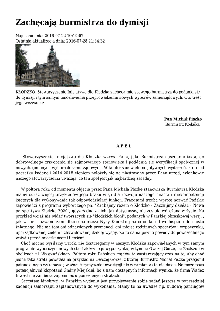 Zachęcają burmistrza do dymisji Napisano dnia: 2016-07-22 10:19:07 Ostatnia aktualizacja dnia: 2016-07-28 21:34:32 KŁODZKO. Stowarzyszenie Inicjatywa dla Kłodzka zachęca miejscowego burmistrza do podania się do dymisji i tym samym umożliwienia przeprowadzenia nowych wyborów samorządowych. Oto treść jego wezwania: Pan Michał Piszko Burmistrz Kodzłka APEL Stowarzyszenie Inicjatywa dla Kłodzka wzywa Pana, jako Burmistrza naszego miasta, do dobrowolnego zrzeczenia się zajmowanego stanowiska i poddania się weryfikacji społecznej w nowych, gminnych wyborach samorządowych. W kontekście wielu negatywnych wydarzeń, które od początku kadencji 2014-2018 cieniem położyły się na piastowany przez Pana urząd, członkowie naszego stowarzyszenia uważają, że ten apel jest jak najbardziej zasadny. W półtora roku od momentu objęcia przez Pana Michała Piszkę stanowiska Burmistrza Kłodzka mamy coraz więcej przykładów jego braku wizji dla rozwoju naszego miasta i niekompetencji istotnych dla wykonywania tak odpowiedzialnej funkcji. Frazesami trzeba wprost nazwać Pańskie zapowiedzi z programu wyborczego pn. "Zadbajmy razem o Kłodzko - Zacznijmy działać - Nowa perspektywa Kłodzko 2020", gdyż żadna z nich, jak dotychczas, nie została wdrożona w życie. Na przykład wciąż nie widać tworzących się "kłodzkich błoni", podanych w Pańskiej obrazkowej wersji , jak w niej nazwano zaniedbane nabrzeża Nysy Kłodzkiej na odcinku od wodospadu do mostu żelaznego. Nie ma tam ani odnawianych promenad, ani miejsc rodzinnych spacerów i wypoczynku, uporządkowanej zieleni i zlikwidowanej dzikiej wyspy. Za to są na pewno powody do powszechnego wstydu przed mieszkańcami i gośćmi. Choć mocno wysilamy wzrok, nie dostrzegamy w naszym Kłodzku zapowiadanych w tym samym programie wyborczym nowych stref aktywnego wypoczynku, w tym na Owczej Górze, na Zaciszu i w okolicach ul. Wyspiańskiego. Półtora roku Pańskich rządów to wystarczający czas na to, aby choć jedna taka strefa powstała na przykład na Owczej Górze, z której Burmistrz Michał Piszko przegonił potencjalnego wykonawcę ważnej turystycznie inwestycji nic w zamian za to nie dając. No może poza potencjalnymi kłopotami Gminy Miejskiej, bo z nam dostępnych informacji wynika, że firma Wadex Inwest nie zamierza zapomnieć o poniesionych stratach. Szczytem hipokryzji w Pańskim wydaniu jest przypisywanie sobie zadań jeszcze w poprzedniej kadencji samorządu zaplanowanych do wykonania. Mamy tu na uwadze np. budowę parkingów samochodowych przy ul. Spółdzielczej i ul. Przyjaciół Dzieci czy budowę zachodniej obwodnicy Kłodzka, co do której uzgodnienia czynione były nie z aktualnym Burmistrzem Kłodzka. Poza tym inicjatywa wprowadzenia ruchu dwukierunkowego na odcinku ul. Słowackiego nie jest Pańskim pomysłem. Panie Burmistrzu Piszko, Od wielu miesięcy Kłodzko jest pośmiewiskiem w skali całego kraju oraz zagranicy za sprawą osób przez Pana mianowanych albo wskazanych na odpowiedzialne stanowiska urzędnicze w mieście. Konferencja prasowa z 13 czerwca 2016 r. zorganizowana na krytej pływalni przez bardzo Panu bliskiego Dyrektora Janusza Skrobota zakończyła się skandalem, co m.in. wyeksponowały media. Mimo to przywrócił Pan tę osobę do pracy w Urzędzie Miejskim i przymyka oczy na jej dalsze poczynania narażające na szwank dobre imię miasta. Do tej pory nie wyciągnął Pan konsekwencji wobec Prezesa spółki ZAMG za jego bierną postawę w toku tej konferencji wobec J. Skrobota. Nie odpowiedział Pan na pismo w tej sprawie wystosowane do Burmistrza przez nasze stowarzyszenie. Nie słyszymy o karach dyscyplinarnych w stosunku do osób funkcyjnych, odpowiedzialnych za dopuszczenie do fatalnej sytuacji technicznej i sanitarnej na krytym basenie. Nie ma Pana reakcji na upublicznienie przez urzędnika miejskiego danych dwóch spółek, które stanowią tajemnicę handlową. Nie ma też wielu innych oczekiwanych reakcji właściwych dla autentycznego gospodarza miasta, który jednoczy, a nie dzieli. Wobec powyższego, chcąc przerwać to fatum dla naszego miasta, Stowarzyszenie Inicjatywa dla Kłodzka apeluje do Pana Michała Piszki, jako Burmistrza Kłodzka, o poddanie się społecznej weryfikacji w drodze zrezygnowania z zajmowanego stanowiska i ewentualnego zmierzenia się z kontrkandydatami w nowo rozpisanych wyborach. W imieniu Zarządu Prezes Stowarzyszenia Inicjatywa dla Kłodzka (-) Henryk Urbanowski DO WIADOMOŚCI: 1. Poseł Anna Zalewska 2. Poseł Monika Wielichowska 3. Poseł Wojciech Murdzek 4. Poseł Michał Dworczyk 5. Senator Aleksander Szwed 6. Wojewoda Dolnośląski Paweł Hreniak 7. Radni Rady Miejskiej w Kłodzku 8. Media