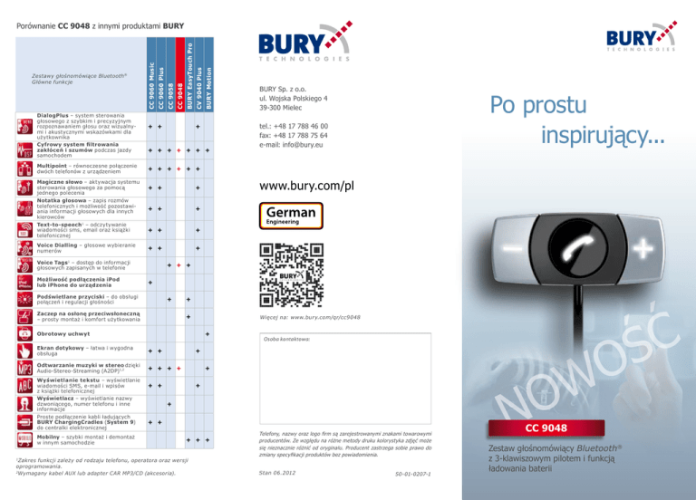 DialogPlus – system sterowania głosowego z szybkim i precyzyjnym rozpoznawaniem głosu oraz wizualnymi i akustycznymi wskazówkami dla użytkownika Cyfrowy system filtrowania zakłóceń i szumów podczas jazdy samochodem + + + + + + + + + + Multipoint – równoczesne połączenie dwóch telefonów z urządzeniem + + + + + + Magiczne słowo – aktywacja systemu sterowania głosowego za pomocą jednego polecenia + + + Notatka głosowa – zapis rozmów telefonicznych i możliwość pozostawiania informacji głosowych dla innych kierowców + + + Text-to-speech1 – odczytywanie wiadomości sms, email oraz książki telefonicznej + + + Voice Dialling – głosowe wybieranie numerów + + + Voice Tags1 – dostęp do informacji głosowych zapisanych w telefonie Możliwość podłączenia iPod lub iPhone do urządzenia + tel.: +48 17 788 46 00 fax: +48 17 788 75 64 e-mail: [email protected] www.bury.com/pl + + Więcej na: www.bury.com/qr/cc9048 + Obrotowy uchwyt Ekran dotykowy – łatwa i wygodna obsługa + + Odtwarzanie muzyki w stereo dzięki Audio-Stereo-Streaming (A2DP)1,2 + + + + Osoba kontaktowa: + + + + + + + + + + + Zakres funkcji zależy od rodzaju telefonu, operatora oraz wersji oprogramowania. 2 Wymagany kabel AUX lub adapter CAR MP3/CD (akcesoria). 1 Po prostu inspirujący... + Zaczep na osłonę przeciwsłoneczną – prosty montaż i komfort użytkowania Mobilny – szybki montaż i demontaż w innym samochodzie BURY Sp. z o.o. ul. Wojska Polskiego 4 39-300 Mielec + + + Podświetlane przyciski – do obsługi połączeń i regulacji głośności Wyświetlanie tekstu – wyświetlanie wiadomości SMS, e-mail i wpisów z książki telefonicznej Wyświetlacz – wyświetlanie nazwy dzwoniącego, numer telefonu i inne informacje Proste podłączenie kabli ładujących BURY ChargingCradles (System 9) do centralki elektronicznej BURY Motion CV 9040 Plus BURY EasyTouch Pro CC 9048 CC 9058 CC 9060 Plus Zestawy głośnomówiące Bluetooth® Główne funkcje CC 9060 Music Porównanie CC 9048 z innymi produktami BURY Telefony, nazwy oraz logo firm są zarejestrowanymi znakami towarowymi producentów. Ze względu na różne metody druku kolorystyka zdjęć może się nieznacznie różnić od oryginału. Producent zastrzega sobie prawo do zmiany specyfikacji produktów bez powiadomienia. Stan 06.2012 50-01-0207-1 CC 9048 Zestaw głośnomówiący Bluetooth® z 3-klawiszowym pilotem i funkcją ładowania baterii CC 9048 Zestaw głośnomówiący Bluetooth® z 3-klawiszowym pilotem i funkcją ładowania baterii Zalety: W detalach: Pilot z 3 podświetlanymi przyciskami – dyskretnie wbudowane i wygodne w użyciu Muzyka bez granic – dzięki bezpośredniemu transferowi muzyki1 i zintegrowanemu wzmacniaczowi cyfrowemu o mocy 30 W Informacje dla użytkownika – informacje o statusie do wyboru w 4 różnych językach (niemiecki, angielski, francuski, hiszpański) Doskonała jakość dźwięku dzięki wykorzystaniu samochodowego systemu audio i funkcji filtrowania zakłóceń i szumów Voice-Tags2 – dostęp do funkcji wybierania głosowego w telefonie Automatyczne wyciszanie radia podczas rozmów telefonicznych Multipoint – równoczesne połączenie dwóch telefonów z urządzeniem Możliwość aktualizacji – poprzez opcjonalny kabel USB i pakiet oprogramowania Funkcja ładowania baterii telefonu komórkowego – gwarantuje nieograniczony czas rozmowy w pojeździe The scope of the functions may vary according to mobile phone, 1 przez A2DP lub kabel AUX-In version. network provider and software 2 Zakres funkcji zależy od rodzaju telefonu, operatora oraz wersji oprogramowania. 1 Elegancki montaż: przewód można poprowadzić dołem, górą lub z tyłu. Pojemność pamięci – maks. 8 telefonów Kabel ładujący w zestawie – do telefonów komórkowych z wejściem Mikro-USB Kabel AUX-In w zestawie – do przenoszenia plików muzycznych z telefonu komórkowego W zestawie: 1. Centralka elektroniczna 2. Podświetlany pilot 3. Mikrofon 4. Wiązka kablowa ISO 5. Przedłużacz 6. Kabel AUX- In 7. Kabel do ładowania Micro-USB 8. Skrócona instrukcja obsługi Po prostu inspirujący…