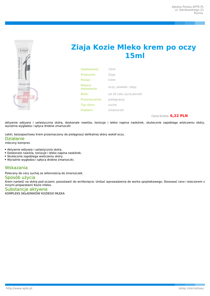 Apteka Polska APTE.PL ul. Derdowskiego 21 Rumia Ziaja Kozie Mleko krem po oczy 15ml Opakowanie: 15ml Producent: Ziaja Postać: krem Miejsce stosowania: oczy, powieki, rzęsy Wiek: od 20 roku życia,dorośli Przeznaczenie: pielęgnacja Typ skóry: sucha Problem: zmarszczki Cena brutto: 6,22 PLN aktywnie odżywia i uelastycznia skórę, doskonale nawilża, tonizuje i lekko napina naskórek, skutecznie zapobiega wiotczeniu skóry, wyraźnie wygładza i spłyca drobne zmarszczki Lekki, bezzapachowy krem przeznaczony do pielęgnacji delikatnej skóry wokół oczu. Działanie mleczny kompres Aktywnie odżywia i uelastycznia skórę. Doskonale nawilża, tonizuje i lekko napina naskórek. Skutecznie zapobiega wiotczeniu skóry. Wyraźnie wygładza i spłyca drobne zmarszczki. Wskazania Polecany do cery suchej ze skłonnością do zmarszczek. Sposób użycia Krem nanieść na skórę pod oczami, pozostawić do wchłonięcia. Unikać wprowadzenia do worka spojówkowego. Stosować rano i wieczorem z innymi preparatami Kozie mleko. Substancje aktywne KOMPLEKS SKŁADNIKÓW KOZIEGO MLEKA http://www.apte.pl sklep internetowy