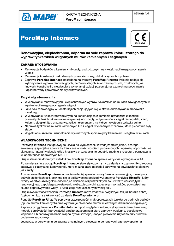 KARTA TECHNICZNA PoroMap Intonaco strona 1/4 PoroMap Intonaco EN 998-1 Renowacyjna, ciepłochronna, odporna na sole zaprawa koloru szarego do wypraw tynkarskich wilgotnych murów kamiennych i ceglanych ZAKRES STOSOWANIA Renowacja budynków z kamienia lub cegły, uszkodzonych na skutek kapilarnego podciągania wilgoci. Renowacja konstrukcji uszkodzonych przez siarczany, chlorki czy azotan potasu. Zaprawa PoroMap Intonaco nakładana na warstwę PoroMap Rinzaffo świetnie nadaje się wykonywania wypraw renowacyjnych, zarówno starych ścian zewnętrznych, działowych, jak i nowych konstrukcji o niewłaściwie wykonanej izolacji poziomej, narażonych na podciąganie kapilarne wody i powstawanie wykwitów solnych. Przykłady stosowania Wykonywanie renowacyjnych i ciepłochronnych wypraw tynkarskich na murach zawilgoconych w wyniku kapilarnego podciągania wilgoci. Jako tynk renowacyjny w konstrukcjach znajdujących się w strefie oddziaływania środowiska morskiego. Wykonywanie tynków renowacyjnych na konstrukcjach z kamienia (zwłaszcza z kamieni porowatych, takich jak naturalne wapienie) lub z cegły, w tym murów z cegieł niedopałek, ścian, kolumn, sklepień itp., oraz na wszystkich elementach, na których występują wykwity solne. Naprawa tynków na murach kamiennych lub z cegieł, wykonanych z zapraw, które pierwotnie były słabe. Wypełnianie szczelin i uzupełnianie wykruszonych spoin między kamieniami i cegłami w murach. WŁAŚCIWOŚCI TECHNICZNE PoroMap Intonaco jest gotową do użycia po wymieszaniu z wodą zaprawą koloru szarego, zawierającą specjalne spoiwa hydrauliczne o właściwościach pucolanowych i wysokiej odporności na siarczany, naturalny piasek lekkie kruszywa oraz specjalne dodatki, zgodnie z recepturą opracowaną w laboratoriach badawczych MAPEI. Dzięki starannie dobranym składnikom PoroMap Intonaco spełnia wszystkie wymagania WTA. Po wymieszaniu z wodą, PoroMap Intonaco staje się odporną na działanie siarczanów, tiksotropową zaprawą o plastycznej konsystencji, którą można łatwo nakładać zarówno na powierzchnie pionowe jak i sufity. Aby zaprawa PoroMap Intonaco mogła najlepiej spełniać swoją funkcję renowacyjną, nawet przy dużych stężeniach soli, powinno się ją aplikować na podkład wykonany z PoroMap Rinzaffo, który tworzy warstwę szczególnie odporną na działanie rozpuszczalnych soli i wraz z warstwą tynku renowacyjnego zapobiega powstawaniu niebezpiecznych i szpecących wykwitów, powstałych na skutek odparowywania wody i krystalizacji rozpuszczonych w niej soli. Dzięki swoim właściwościom PoroMap Rinzaffo może znacznie zwiększyć i tak już bardzo dobrą fizyko-chemiczną efektywność działania PoroMap Intonaco. Ponadto PoroMap Rinzaffo poprawia przyczepności makroporowatych tynków do trudnych podłoży (np. do murów kamiennych) oraz wyrównuje chłonność murów mieszanych (kamienno-ceglanych). Zaprawy przygotowane z PoroMap Intonaco pod względem koloru, wytrzymałości mechanicznej, modułu sprężystości i porowatości bardzo przypominają stare zaprawy wapienne, pucolanowowapienne lub zaprawy na bazie wapna hydraulicznego, których pierwotnie używano przy budowie budynków zabytkowych. Jednakże, w porównaniu do zapraw oryginalnych, stosowane do renowacji zaprawy oparte na KARTA TECHNICZNA PoroMap Intonaco strona 2/4 PoroMap Intonaco są bardzo trwałe dzięki odporności na działanie różnych agresywnych czynników ze środowiska, takich jak: deszcz (także kwaśne deszcze), cykle zamrażania i rozmrażania, mikropęknięcia będące skutkiem skurczu plastycznego, reakcje alkalia-kruszywo, agresywne działanie siarczanów często występujących w murach, w tym także pochodzących z gruntu. ZALECENIA Warstwa zaprawy PoroMap Intonaco powinna być zawsze nakładana na warstwę zaprawy PoroMap Rinzaffo (o grubości co najmniej 5 mm). Warstwa zaprawy PoroMap Intonaco powinna mieć grubość co najmniej 2 cm. Nie należy stosować PoroMap Intonaco jako warstwy do napraw zniszczonych konstrukcji betonowych (stosować zaprawy Planitop lub Mapegrout). Do PoroMap Intonaco nie dodawać żadnych dodatków, cementu ani innych spoiw (wapna lub gipsu). Powierzchni wykonanej z PoroMap Intonaco nie należy wykańczać farbami, które mogłyby utrudnić odparowywanie wilgoci (stosować farby i tynki cienkowarstwowe z linii Silexcolor lub Silancolor, farby na bazie wapna lub preparat Antipluviol S). Nie aplikować PoroMap Intonaco w temperaturze niższej niż +5°C. WYTYCZNE STOSOWANIA Przygotowanie podłoża Przed przygotowaniem zaprawy bardzo ważną rzeczą jest prawidłowe przygotowanie powierzchni muru, który ma być poddany renowacji. Jeśli występuje podciąganej wilgoci, należy usunąć całą warstwę tynku na wysokość co najmniej 50 cm powyżej granicy zawilgoconej powierzchni, przy czym co najmniej na wysokość dwukrotnie większą od grubości muru. Po usunięciu luźno związanych części oraz substancji działających antyadhezyjnie (pyłu, smarów itp.) powierzchnię należy umyć wodą, aby usunąć znajdujące się na murze wykwity i osady rozpuszczalnych soli. W razie potrzeby, czynność powtórzyć kilkakrotnie, aby całkowicie rozpuścić występujące na powierzchni muru osady. Po umyciu należy odczekać, aż pozostała na powierzchni woda odparuje. Przygotowanie zaprawy PoroMap Intonaco można przygotować w normalnej betoniarce. Po wlaniu do niej minimalnej wymaganej ilości wody (około 3,8 litra na każdy worek suchej zaprawy) należy, ciągle mieszając wsypać zawartość przygotowanych, uprzednio otwartych worków PoroMap Intonaco. Mieszać przez 3 minuty, usuwając ze ścian urządzenia resztki nie wymieszanego proszku i sprawdzając czy mieszanka jest jednorodna. Jeśli zachodzi potrzeba, do mieszanki można dodać więcej wody, tak aby całkowita ilość nie przekraczała 4 -4,4 litrów na worek zaprawy, łącznie z tą wlaną na początku. Całość należy mieszać prz