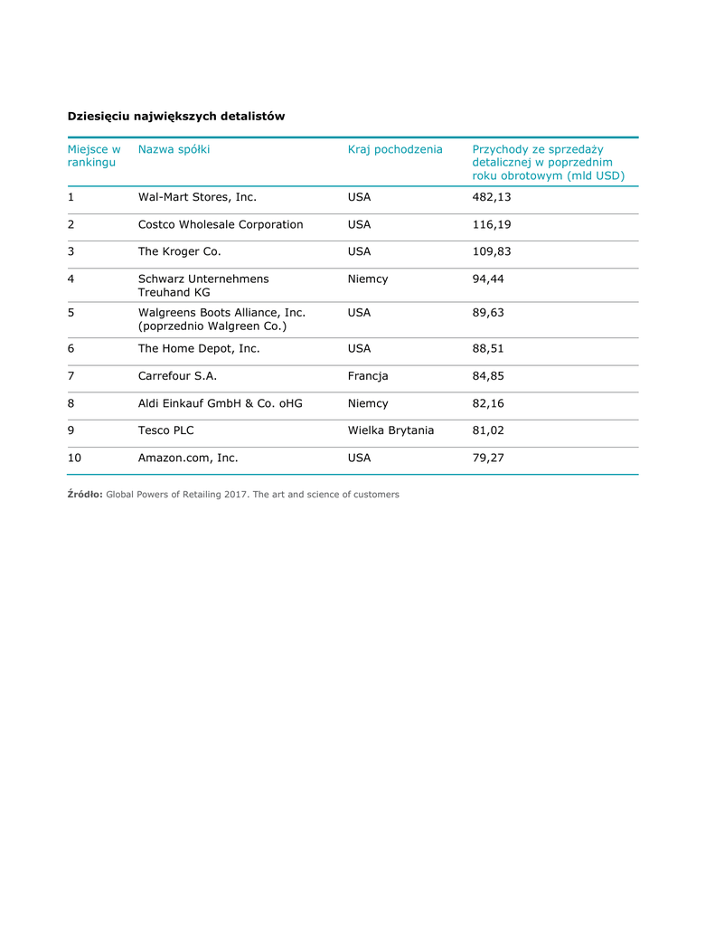 Dziesięciu największych detalistów Miejsce w rankingu Nazwa spółki Kraj pochodzenia Przychody ze sprzedaży detalicznej w poprzednim roku obrotowym (mld USD) 1 Wal-Mart Stores, Inc. USA 482,13 2 Costco Wholesale Corporation USA 116,19 3 The Kroger Co. USA 109,83 4 Schwarz Unternehmens Treuhand KG Niemcy 94,44 5 Walgreens Boots Alliance, Inc. (poprzednio Walgreen Co.) USA 89,63 6 The Home Depot, Inc. USA 88,51 7 Carrefour S.A. Francja 84,85 8 Aldi Einkauf GmbH & Co. oHG Niemcy 82,16 9 Tesco PLC Wielka Brytania 81,02 10 Amazon.com, Inc. USA 79,27 Źródło: Global Powers of Retailing 2017. The art and science of customers