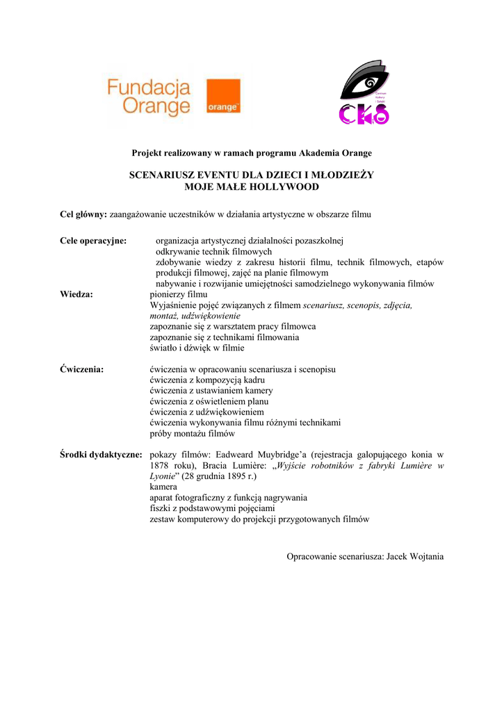 Projekt realizowany w ramach programu Akademia Orange SCENARIUSZ EVENTU DLA DZIECI I MŁODZIEŻY MOJE MAŁE HOLLYWOOD Cel główny: zaangażowanie uczestników w działania artystyczne w obszarze filmu Cele operacyjne: Wiedza: Ćwiczenia: organizacja artystycznej działalności pozaszkolnej odkrywanie technik filmowych zdobywanie wiedzy z zakresu historii filmu, technik filmowych, etapów produkcji filmowej, zajęć na planie filmowym nabywanie i rozwijanie umiejętności samodzielnego wykonywania filmów pionierzy filmu Wyjaśnienie pojęć związanych z filmem scenariusz, scenopis, zdjęcia, montaż, udźwiękowienie zapoznanie się z warsztatem pracy filmowca zapoznanie się z technikami filmowania światło i dźwięk w filmie ćwiczenia w opracowaniu scenariusza i scenopisu ćwiczenia z kompozycją kadru ćwiczenia z ustawianiem kamery ćwiczenia z oświetleniem planu ćwiczenia z udźwiękowieniem ćwiczenia wykonywania filmu różnymi technikami próby montażu filmów Środki dydaktyczne: pokazy filmów: Eadweard Muybridge’a (rejestracja galopującego konia w 1878 roku), Bracia Lumière: „Wyjście robotników z fabryki Lumière w Lyonie” (28 grudnia 1895 r.) kamera aparat fotograficzny z funkcją nagrywania fiszki z podstawowymi pojęciami zestaw komputerowy do projekcji przygotowanych filmów Opracowanie scenariusza: Jacek Wojtania PROJEKT REALIZOWANY W RAMACH PROJEKTU AKADEMIA ORANGE WE WSPÓŁPRACY Z: Studio Vioce Design Grażyna Nita, PHU „Kubi” Marek Kubiś oraz Regionalnym Portalem Informacyjnym Materiał jest dostępny na licencji Creative Commons Uznanie autorstwa 3.0 Polska (http://creativecommons.org/licenses/by/3.0/pl/)
