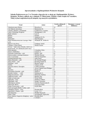 Sprawozdanie z Ogólnopolskich Wyborów Książek Szkoła Podstawowa nr 3 w Toruniu włączyła się w akcję pt. Ogólnopolskie Wybory Książek. Wybory odbyły się w dniach 27-30stycznia. Udział w nich wzięło 427 uczniów. Niżej wykaz najciekawszych książek wg naszych czytelników. Tytuł Akademia pana Kleksa Ala Makota zakochana Anaruk, chłopiec z Grenlandii Ania z Zielonego Wzgórza Bajki robotów Baśnie Baśnie Baśniobór Biuro Detektywistyczne Lassego i Mai seria Bracia Lwie Serce Chłopcy z Placu Broni Disney – bajki różne (Dambo, Któl Lew, Kopciuszek, 101 dalmatyńczyków itp.) Dom tajemnic Dzieci z Bullerbyn Dziennik cwaniaczka - cykl Dziewczynka z szóstego księżyca Gra w wyzwania Gwiazd naszych wina Hania Humorek - cykl Harry Potter – cykl Hertland - seria Hobbit Igrzyska śmierci. Kosogłos Jaśki Karolcia Koszmarny Karolek - cykl Kroniki Archeo – cykl. Magiczne drzewo – cykl Magiczny kotek - cykl Maja na tropie jaja Martynka - seria Mikołajek -cykl Mikołajowe sekrety Minecraft. Bitwa Misja: Przetrwanie. - cykl Nowe przygody Bolka i Lolka -cykl Olimpijscy herosi – seria Opowieści z Narnii - cykl Pan Kuleczka Patka i Pepe Percy Jakson i bogowie olimpijscy –seria Pinokio Liczba oddanych głosów 16 3 6 10 3 3 8 7 24 Dostępne w naszej bibliotece + Lindgren Astrid Monar Ferenc 3 9 6 + + + Columbus Chris Lingren A. Kinney. Jeff Witcher Moony Wilson Jacqueline John Green Mc Donald Megan Rowling Joanne K. Brooke Lauren Tolkien J.R.R. Collins Suzanne Arrou-Vignod Jean-Philippe Kruger M. Simon F. Stelmaszyk A Maleszka Andrzej Bentley Sue Witek Rafał Delahaye Gilbert Sempe, Goscinny Żmurko-Daszkowska D. Cheverton Mark Grylls Bear 3 17 61 11 3 3 13 29 4 20 4 3 8 10 13 25 3 4 14 33 5 3 3 5 3 23 5 3 8 8 Autor Brzechwa J. Budzyńska M Centkiewicz, Czesław Montgomery L.M. Lem S. Grimm Andersen H. Ch. Mull Brandon Widmark M., Willis H. Riordan Rick Lewis C.S. . Widłak Wojciech Szczepańska Agnieszka Riordan Rick Collodi C. + + + + + + + + + + + + + + + + + + + + + + + + + + Pippi Pończoszanka Plastusiowy pamiętnik Pompon - cykl Przygody Tomka – seria Puc, Bursztyn i goście Robinson Krusoe Tajemniczy ogród Tytus, Romek i Atomek (cykl) W pustyni i w puszczy W śnieżną noc Wiersze Wiersze Więzień labiryntu - cykl Wilczy brat Władca Pierścieni Wojna cukierkowa Zaczarowana zagroda Zaopiekuj się mną - seria Zezia i Giler Zezia, Giler i Oczak Zniszcz ten dziennik Zosia z ulicy Kociej Zostań, jeśli kochasz Zwiadowcy – cykl Zwierzaki świata Lindgren Astrid Kownacka M. Olech Joanna Szklarski A. Grabowski J. Defoe D. Burnett F.H. Chmielewski H.J. Sienkiewicz H. John Green Tuwim J. Brzechwa J. Dashner James Paver M. Tolkien J. R.R. Mull B. Centkiewiczowa A. Webb Holly Chylińska A. Chylińska A. Tyszka Agnieszka Forman Gaule Flanagan J. Wojciechowska Martyna 8 8 3 4 5 4 7 5 5 5 4 7 5 3 4 4 18 33 4 4 8 5 5 3 4 + + + + + + + + + + + + + + + + +