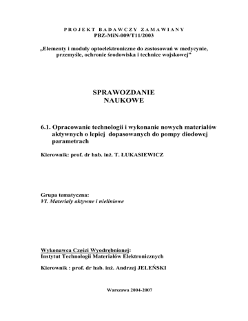 PROJEKT BADAWCZY ZAMAWIANY PBZ-MiN-009/T11/2003 „Elementy i moduły optoelektroniczne do zastosowań w medycynie, przemyśle, ochronie środowiska i technice wojskowej” SPRAWOZDANIE NAUKOWE 6.1. Opracowanie technologii i wykonanie nowych materiałów aktywnych o lepiej dopasowanych do pompy diodowej parametrach Kierownik: prof. dr hab. inż. T. ŁUKASIEWICZ Grupa tematyczna: VI. Materiały aktywne i nieliniowe Wykonawca Części Wyodrębnionej: Instytut Technologii Materiałów Elektronicznych Kierownik : prof. dr hab. inż. Andrzej JELEŃSKI Warszawa 2004-2007 Instytut Technologii Materiałów Elektronicznych SPRAWOZDANIE KOŃCOWE z REALIZACJI PROJEKTU ZAMAWIANEGO PBZ-MiN-009/T11/2003 ZADANIE nr 6.1 pt. „Opracowanie technologii i wykonanie nowych modułów aktywnych o lepiej dopasowanych do pompy diodowej parametrach” Kierownik wyodrębnionej części projektu Prof. dr hab. inż. Andrzej Jeleński Kierownik zadania Prof. dr hab. inż. Tadeusz Łukasiewicz Zespół autorów : Prof. A. Pajączkowska, dr D. Pawlak, dr R. Diduszko, dr inż. A. Bajor, mgr inż. W. Szyrski, mgr M. Świrkowicz, inż. J. Kisielewski, mgr inż. B. Kaczmarek, mgr inż. W. Giersz, dr A. Kłos, mgr W. Hofman, mgr H. Sakowska, mgr inż. M. Gała, mgr inż. K.Kołodziejak Warszawa, październik 2007 1 1. Wprowadzenie Celem zadania było opracowanie na drodze doświadczalnej warunków krystalizacji, zapewniających otrzymanie dobrej jakości kryształów: ortowanadianu itrowego, domieszkowanych jonami neodymu Nd:YVO 4 (YVO), oksyboranu gadolinowo wapniowego, domieszkowanych jonami neodymu Nd:GdCa 4 O(BO 3 ) 3 i domieszkowanych jonami iterbu Yb:GdCa 4 O(BO 3 ) 3 (GdCOB); wytworzenie próbek tych kryształów oraz wykonanie badań potwierdzających ich przydatność dla techniki laserowej. Kryształy YVO są bardzo atrakcyjnym materiałem laserowym. W porównaniu do szeroko stosowanych kryształów Nd:YAG kryształy ortowanadianu itrowego charakteryzują się bardzo szerokim pasmem absorpcji wynoszącym ponad 15nm (w YAG ok. 2,5nm), zdecydowanie większymi przekrojami czynnymi na absorpcję i emisję oraz co jest ważne możliwością wprowadzenia do kryształu większej ilości domieszki Nd. bez obniżania jakości strukturalnej kryształu i wystąpienia zjawiska wygaszania stężeniowego. W przypadku YAG poziom domieszkowania zwykle nie przekracza 1 %at. Kryształy YVO są wymieniane jako szczególnie przydatne do budowy mikrolaserów. Oksyboran gadolinowo wapniowy GdCOB jest przedstawicielem bardzo licznej grupy boranów, które są lub mogą być wykorzystane w technice laserowe. Dwuosiowe kryształy GdCOB o strukturze jednoskośnej są dobrym materiałem nieliniowym, stosowanym do powielania częstości a domieszkowane jonami z grupy lantanu stają się aktywnym materiałem laserowym. Możliwe jest wprowadzenie do kryształów GdCOB znacznych ilości domieszki Nd (powyżej 10 % at.) a w przypadku Yb nawet do 15 % at. bez ujemnych efektów ubocznych jakie mogą się wiązać z wysokim poziomem domieszkowania. Własności laserowe GdCOB są porównywalne z własnościami kryształów YAG. Kryształy GdCOB łączą więc własności laserowe i nieliniowe co w praktyce oznacza możliwość samopowielania częstości generowanej wiązki laserowej Tak nakreślone zadanie zostało zrealizowane Zadanie zostało umownie podzielone na trzy etapy. W sprawozdaniu z etapu 1 [1], sporządzonym w 2005r., opisano wstępne wyniki prac technologicznych i badawczych nad otrzymaniem kryształów YVO 4 :Nd oraz GdCOB, domieszkowanego neodymem i/lub iterbem. W sprawozdaniu z etapu 2 [2], sporządzonym w 2006r., przedstawiono wyniki w postaci otrzymanych kryształów, a także wstępne badania ich jednorodności optycznej oraz badania spektroskopowe. W sprawozdaniu z etapu 3 [3] przedstawiono wyniki w postaci nowych kryształów, o poszerzonym zakresie zawartości domieszek; badań spektroskopowych w celu wytypowania optymalnych próbek dla badań aplikacyjnych i badań jednorodności optycznej. Kryształy charakteryzowały się dobrą jednorodnością strukturalno-optyczną, wykazaną przy pomocy badań konoskopowych, polaryskopowych, polarymetrycznych i rentgenograficznych, wykonanych w ITME oraz badań spektroskopowych i laserowych, wykonanych w IOE WAT. Zebrany materiał doświadczalny jest bardzo obszerny. W niniejszym sprawozdaniu podano zestawienie wszystkich badań, zilustrowane pojedynczymi, najbardziej charakterystycznymi przykładami, w postaci zdjęć i wykresów. 2. Opis prac 2 2.1 Kryształy YVO 4 Badania warunków krystalizacji ortowanadianu itrowego YVO metodą Czochralskiego prowadzono na aparaturze Oxypuller 20-04 firmy Cyberstar (Francja) z ogrzewaniem indukcyjnym. Uwzględniając temperaturę topienia ortowanadianu itrowgo, wynoszącą ponad 18100C i współczynnik przewodzenia ciepła równy 5,2 Wm-1 0C, zaprojektowano i zbudowano cieplny układu wzrostu, wyznaczający pewną ograniczoną przestrzeń dla tygla i powstającego kryształu, w której kształtowane są warunki cieplne, odpowiednie dla krystalizowanego materiału. Wymiary geometryczne układu, rodzaj zastosowanych materiałów izolacyjnych, sposób ich ułożenia, ustawienie tygla względem cewki indukcyjnej współkształtują cieplne warunki wzrostu, wyznaczając gradienty temperatury w strefie wzrostu (radialny i osiowy) i odpowiedni rozkład temperatury w przestrzeni nad tyglem. Wprowadzając, na podstawie uzyskiwanych wyników prób krystalizacji odpowiednie poprawki, dochodzi się do wyznaczenia właściwych warunków wzrostu obejmujących gradienty temperatury, szybkości wzrostu i szybkości obrotów Jako materiały wyjściowy do krystalizacji stosowano tlenki itru, wanadu i neodymu o czystości 4,5N. Mieszaninę tlenków o składzie stechiometrycznym po zmieszaniu wygrzewano w piecu oporowym w temperaturze 12000C w ciągu 12 godzin w celu przeprowadzenia syntezy i uzyskaniu związku YVO 4 z założoną ilością domieszki neodymu. Materia