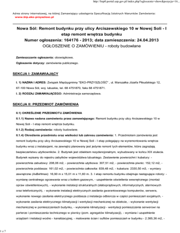 1z7 http://bzp0.portal.uzp.gov.pl/index.php?ogloszenie=show&pozycja=16... Adres strony internetowej, na której Zamawiający udostępnia Specyfikację Istotnych Warunków Zamówienia: www.bip.eko-przyszlosc.pl Nowa Sól: Remont budynku przy ulicy Arciszewskiego 10 w Nowej Soli - I etap remont wnętrza budynku Numer ogłoszenia: 164176 - 2013; data zamieszczenia: 24.04.2013 OGŁOSZENIE O ZAMÓWIENIU - roboty budowlane Zamieszczanie ogłoszenia: obowiązkowe. Ogłoszenie dotyczy: zamówienia publicznego. SEKCJA I: ZAMAWIAJĄCY I. 1) NAZWA I ADRES: Związek Międzygminny "EKO-PRZYSZŁOŚĆ" , ul. Marszałka Józefa Piłsudskiego 12, 67-100 Nowa Sól, woj. lubuskie, tel. 68 4751870, faks 68 4751871. I. 2) RODZAJ ZAMAWIAJĄCEGO: Administracja samorządowa. SEKCJA II: PRZEDMIOT ZAMÓWIENIA II.1) OKREŚLENIE PRZEDMIOTU ZAMÓWIENIA II.1.1) Nazwa nadana zamówieniu przez zamawiającego: Remont budynku przy ulicy Arciszewskiego 10 w Nowej Soli - I etap remont wnętrza budynku. II.1.2) Rodzaj zamówienia: roboty budowlane. II.1.4) Określenie przedmiotu oraz wielkości lub zakresu zamówienia: 1. Przedmiotem zamówienia jest remont budynku przy ulicy Arciszewskiego 10 w Nowej Soli - I etap polegający na wyremontowaniu wnętrza budynku wraz z instalacjami, na zewnątrz planowany jest jedynie remont tych elementów, które zagrażają bezpieczeństwu użytkowników. 2. Budynek jest obiektem rezydencjonalnym, wybudowany w końcu XIX stulecia. Budynek wpisany do rejestru zabytków województwa lubuskiego. Zestawienie powierzchni i kubatury: powierzchnia zabudowy: 208,06 m2, - powierzchnia użytkowa: 307,51 m2, - powierzchnia piwnic: 152,12 m2, powierzchnia poddasza: 161,02 m2, - powierzchnia całkowita: 839,48 m2, - kubatura: 2330,50 m3, - wymiary zewnętrzne (AxBxHmax): 16,90 m x 15,01 m x 11,60 m. 3. I etap remontu budynku obejmuje następujące roboty: wymianę centralnego ogrzewania wraz z kotłem gazowym, - uzupełnienie oświetlenia wewnętrznego (montaż opraw oświetleniowych), - wykonanie instalacji strukturalnych (słaboprądowych, informatycznych, alarmowych oraz telefonicznych), - wykonanie instalacji elektrycznych zasilania gwarantowanego komputerów, serwera, wykonanie nowego zasilania elektrycznego poddasza z instalacja odbiorcza w części pomieszczeń socjalnych, wykonanie zasilania elektrycznego klimatyzacji i wentylacji mechanicznej na obiekcie, - wykonanie wentylacji mechanicznej w pomieszczeniach budynku, - wykonanie klimatyzacji - wentylacji pomieszczenia serwerowi na parterze i pomieszczenia technicznego w piwnicy (pom. agregatów klimatyzacji), - wymiana i uzupełnienie urządzeń i instalacji wodno - kanalizacyjnej, - malowanie ścian i sufitów pomieszczeń w budynku - 2.365,36 m2, - 2z7 http://bzp0.portal.uzp.gov.pl/index.php?ogloszenie=show&pozycja=16... malowanie drzwi zewnętrznych i wewnętrznych pierwotnych oraz malowanie okien i uzupełnienie oszklenia, wymianę okładzin podłogowych oraz remont pierwotnych podłóg drewnianych białych nadających sie do użytku, wymianę i uzupełnienie skrzydeł drzwiowych wewnętrznych wtórnych, - uszczelnienie tarasu nad wejściem do budynku - 9,36 m2, - uzupełnienie tynków zewnętrznych przy wejściu do budynku i tymczasowe pomalowanie ich w istniejącej kolorystyce - 109,84 m2, - wyłożenie kostka granitową (wzór istniejącej kostki na chodniku) dojścia do budynku - 13,50 m2. II.1.6) Wspólny Słownik Zamówień (CPV): 45.26.26.90-4, 45.30.00.00-0, 45.40.00.00-1. II.1.7) Czy dopuszcza się złożenie oferty częściowej: nie. II.1.8) Czy dopuszcza się złożenie oferty wariantowej: nie. II.2) CZAS TRWANIA ZAMÓWIENIA LUB TERMIN WYKONANIA: Okres w miesiącach: 3. SEKCJA III: INFORMACJE O CHARAKTERZE PRAWNYM, EKONOMICZNYM, FINANSOWYM I TECHNICZNYM III.1) WADIUM Informacja na temat wadium: Wykonawca jest zobowiązany do wniesienia wadium w wysokości 10.000 złotych (słownie: dziesięć tysięcy złotych) III.2) ZALICZKI III.3) WARUNKI UDZIAŁU W POSTĘPOWANIU ORAZ OPIS SPOSOBU DOKONYWANIA OCENY SPEŁNIANIA TYCH WARUNKÓW III. 3.1) Uprawnienia do wykonywania określonej działalności lub czynności, jeżeli przepisy prawa nakładają obowiązek ich posiadania Opis sposobu dokonywania oceny spełniania tego warunku Zamawiający odstępuje od opisu sposobu dokonywania oceny spełniania warunków w tym zakresie. Zamawiający dokona oceny spełniania warunków udziału w postępowaniu w tym zakresie na podstawie oświadczenia o spełnianiu warunków udziału w postępowaniu III.3.2) Wiedza i doświadczenie Opis sposobu dokonywania oceny spełniania tego warunku Zamawiający uzna warunek za spełniony, jeżeli wykonawca wykaże, że w okresie ostatnich 5 lat przed upływem terminu składania ofert, a jeżeli okres prowadzenia działalności jest krótszy, to w tym okresie, wykonał co najmniej dwie roboty budowlane o podobnej wartości i zakresie oraz załączy dowody określające, czy roboty te zostały wykonane w sposób należyty oraz wskazujące, czy zostały wykonane zgodnie z zasadami sztuki budowlanej i prawidłowo ukończone. Przez robotę budowlaną o podobnej wartości i zakresie należy rozumieć robotę budowlaną o wartości minimum 500.000 zł brutto, której zakres obejmował wykonanie w budynku co najmniej instalacji centralnego ogrzewania, instalacji elektrycznej oraz wewnętrznych robót wykończeniowych w tym robót tynkarskich i malarskich. Do przeliczenia wartości występujących w innych walutach niż PLN Zamawiający jako kurs przeliczeniowy 3z7 http://bzp0.portal.uzp.gov.pl/index.php?ogloszenie=show&pozycja=16... przyjmie średni kurs Narodowego Banku Polskiego (NBP), z dnia zamieszczenia ogłoszenia o zamówieniu w Biuletynie Zamówień Publicznych III.3.3) Potencjał techniczny Opis sposobu dokonywania oceny spełniania tego warunku Zamawiający odstępuje od opisu sposobu dokonywania oceny spełniania warunków w tym zakresie. Zamawiający dokona oceny spełniania warunków udziału w postępowani