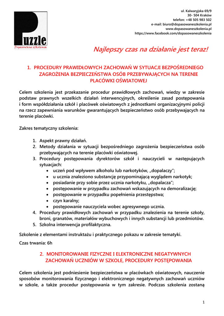 ul. Kalwaryjska 69/9 30- 504 Kraków telefon: +48 505 983 502 e-mail: [email protected] www.dopasowaneszkolenia.pl https://www.facebook.com/dopasowaneszkolenia Najlepszy czas na działanie jest teraz! 1. PROCEDURY PRAWIDŁOWYCH ZACHOWAŃ W SYTUACJI BEZPOŚREDNIEGO ZAGROŻENIA BEZPIECZEŃSTWA OSÓB PRZEBYWAJĄCYCH NA TERENIE PLACÓWKI OŚWIATOWEJ Celem szkolenia jest przekazanie procedur prawidłowych zachowań, wiedzy w zakresie podstaw prawnych wszelkich działań interwencyjnych, określenie zasad postępowania i form współdziałania szkół i placówek oświatowych z jednostkami organizacyjnymi policji na rzecz zapewniania warunków gwarantujących bezpieczeństwo osób przebywających na terenie placówki. Zakres tematyczny szkolenia: 1. Aspekt prawny działań. 2. Metody działania w sytuacji bezpośredniego zagrożenia bezpieczeństwa osób przebywających na terenie placówki oświatowej. 3. Procedury postępowania dyrektorów szkół i nauczycieli w następujących sytuacjach: uczeń pod wpływem alkoholu lub narkotyków, „dopalaczy”; u ucznia znaleziono substancję przypominającą wyglądem narkotyk; posiadanie przy sobie przez ucznia narkotyku, „dopalacza”; postępowanie w przypadku zachowań wskazujących na demoralizację; postępowanie w przypadku popełnienia przestępstwa; czyn karalny; postępowanie nauczyciela wobec agresywnego ucznia. 4. Procedury prawidłowych zachowań w przypadku znalezienia na terenie szkoły, broni, granatów, materiałów wybuchowych i innych substancji lub przedmiotów. 5. Szkolna interwencja profilaktyczna. Szkolenie z elementami instruktażu i praktycznego pokazu w zakresie tematyki. Czas trwania: 6h 2. MONITOROWANIE FIZYCZNE I ELEKTRONICZNE NEGATYWNYCH ZACHOWAŃ UCZNIÓW W SZKOLE, PROCEDURY POSTĘPOWANIA Celem szkolenia jest podniesienie bezpieczeństwa w placówkach oświatowych, nauczenie sposobów monitorowania fizycznego i elektronicznego negatywnych zachowań uczniów w szkole, a także procedur postępowania w tym zakresie. Podczas szkolenia zostaną 1 zaprezentowane praktyczne metody działań w sytuacjach zagrożenia zgodnie z zasadą ,,Zróbmy wszystko, aby życie w szkole toczyło się bezpiecznie i spokojnie”. Zakres tematyczny szkolenia: 1. Zasady trójkąta bezpieczeństwa w szkole. 2. Specyfika zagrożeń w szkole: mienie szkoły, niszczenie, uszkadzanie, podpalenia; charakterystyka osób; charakterystyka czynów (alkohol); włamania, kradzieże, wyłudzenia, przemoc fizyczna; narkotyki i inne środki; bójki i pobicia; fałszywe alarmy. 3. Monitorowanie fizyczne negatywnych zachowań uczniów w szkole. 4. Monitorowanie elektroniczne negatywnych zachowań uczniów w szkole. 5. Akty prawne, a prawa dziecka, przy zastosowaniu monitoringu TV. 6. Cele stosowania monitoringu CCTV w szkołach. 7. Zasady tworzenia i modernizacji monitoringu CCTV w szkole. 8. Organizacja monitoringu fizycznego i elektronicznego w szkole. 9. Monitorowanie fizyczne i elektroniczne negatywnych zachowań uczniów w szkole procedury postępowania. Czas trwania: 2 dni x 6h 3. NARKOTYKI I INNE ŚRODKI PSYCHOAKTYWNE POPULARNE WŚRÓD MŁODZIEŻY – DIAGNOZA I PRZECIWDZIAŁANIE UZALEŻNIENIOM Uczestnicy szkolenia uzyskają wiedzę na temat substancji psychoaktywnych (narkotyków i tzw. narkotyków domowych), po które mogą sięgać uczniowie. Zdobędą praktyczne umiejętności rozpoznawania symptomów zażywania przez ucznia określonego środka psychoaktywnego oraz trybu postępowania z uczniem: eksperymentującym oraz uzależnionym. Zakres tematyczny szkolenia: 1. Badanie środowiska szkolnego pod kątem występowania w nim narkotyków (badania ankietowe, obserwacja, rozmowy indywidualne itd.). 2. Procedura postępowania szkoły w razie przypuszczenia istnienia lub ujawnienia na jej terenie dilerów narkotykowych. 3. Rozpoznania w zachowaniu ucznia symptomów zażycia przez niego określonego środka psychoaktywnego oraz trybu postępowania z uczniem: eksperymentującym oraz uzależnionym. 4. Rozmowa z uczniem eksperymentującym z substancjami psychoaktywnymi oraz uczniem od nich uzależnionym. 5. Prawne i pedagogiczne możliwości oddziaływania na ucznia uzależnionego. Czas trwania: 4h 2 4. SPRAWCA I OFIARA PRZEMOCY W ŚRODOWISKU SZKOLNYM – ROZPOZNANIE, WSPARCIE I PRZECIWDZIAŁANIE ZJAWISKU PRZEMOCY Uczestnicy szkolenia zdobędą umiejętności diagnozy środowiska szkolnego pod kątem występowania w nim zjawiska przemocy wśród uczniów, zapoznają się z metodami przeciwdziałania eskalacji tego zjawiska, neutralizowania sprawcy przemocy, ochrony ofiary przemocy oraz kreowania środowiska szkolnego wolnego od przemocy. Zakres tematyczny szkolenia: 1. 2. 3. 4. Procedura postępowania w razie ujawnienia na jej terenie występowania przemocy. Procedury pozwalające na przeciwdziałania eskalacji tego zjawiska. Rozmowa z uczniem będącym ofiarą, sprawcą, świadkiem przemocy. Tworzenie atmosfery szkolnej wolnej od przemocy – metody postępowania. Czas trwania: 4h 5. ALKOHOLIZM W RODZINIE A FUNKCJONOWANIE DZIECKA WSPÓŁUZALEŻNIONEGO W SZKOLE Uczestnicy szkolenia uzyskają wiedzę na temat choroby alkoholowej i współuzależnienia pozostałych członków rodziny. Nabędą praktycznych umiejętności w rozpoznaniu określonych ról, w których funkcjonują dzieci z rodzin alkoholowych. Zdobędą wiedzę, jak owe role wpływają na funkcjonowanie dziecka w szkole oraz jak można pomóc dziecku współuzależnionemu. Zakres tematyczny szkolenia: 1. Uzależnienie i współuzależnienie – diagnoza, symptomy. 2. Pomoc rodzinie i osobie uzależnionej. 3. Pomoc dziecku współuzależnionemu w zależności od roli, w której funkcjonuje. Czas trwania: 4h 6. PROCEDURA NIEBIESKIEJ KARTY Uczestnicy szkolenia zapoznają się z procedurą postępowania w razie ujawnienia na terenie szkoły przesłanek występowania przemocy domowej w rodzinie ucznia (dziecko: ofiara, sprawca, świadek). Zdobędą praktyczne umiejętności rozpoznania symptomów wy