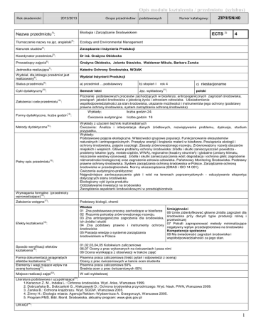 Opis modułu kształcenia / przedmiotu (sylabus) Rok akademicki: 2012/2013 Grupa przedmiotów: podstawowych Numer katalogowy: Ekologia i Zarządzanie Środowiskiem Nazwa przedmiotu1): 3) Tłumaczenie nazwy na jęz. angielski : 4) Kierunek studiów : ZIP/I/SN/40 ECTS 2) 4 Ecology and Environmental Management Zarządzanie i Inżynieria Produkcji 5) Koordynator przedmiotu : Dr inż. Grażyna Obidoska 6) Prowadzący zajęcia : Grażyna Obidoska, Jolanta Stawicka, Waldemar Mikuła, Barbara Żarska 7) Jednostka realizująca : Katedra Ochrony Środowiska, WOiAK Wydział, dla którego przedmiot jest 8) realizowany : Wydział Inżynierii Produkcji 9) Status przedmiotu : a) przedmiot …podstawowy 10) Cykl dydaktyczny : Semestr letni b) stopień I rok 4 11) Jęz. wykładowy : c) niestacjonarne polski Poznanie podstawowych procesów zachodzących w biosferze; antropogenicznych zagrożeń środowiska, powiązań jakości środowiska z jakością życia i zdrowiem człowieka. Uświadomienie współodpowiedzialności za stan środowiska, ukazanie możliwości i instrumentów jego ochrony (podstawy prawne ochrony środowiska, system zarządzania ochroną środowiska) Wykłady; liczba godzin 24; 12) Założenia i cele przedmiotu : 13) Formy dydaktyczne, liczba godzin : Ćwiczenia audytoryjne liczba godzin 16 Wykłady z użyciem technik multimedialnych Ćwiczenia: Analiza i interpretacja danych źródłowych, rozwiązywanie problemu, dyskusja, studium przypadku, Wykłady: Podstawowe pojęcia ekologiczne. Właściwości grupowe populacji. Funkcjonowanie ekosystemów naturalnych i antropogenicznych. Przepływ energii i krążenie materii w biosferze. Powiązania ekologii i ochrony środowiska, pojęcie sozologii. Zasady zrównoważonego rozwoju. Zrównoważony rozwój obszarów miejskich i wiejskich. Główne problemy ochrony środowiska: źródła i skutki zanieczyszczeń powietrza problemy lokalne (pyły, metale ciężkie, WWA), regionalne (kwaśny strumień) i globalne (zmiany klimatu, niszczenie warstwy ozonowej); źródła i skutki zanieczyszczenia wód; degradacja i ochrona gleb; zagrożenie różnorodności biologicznej oraz zagrożenie zdrowia człowieka. Państwowy Monitoring Środowiska. Podstawy prawne ochrony środowiska. System zarządzania ochroną środowiska w Polsce. Zarządzanie ochroną środowiska w przedsiębiorstwie. Normy ekozarządzania (EMAS i ISO 14 001). Ćwiczenia audytoryjno-praktyczne: Najgroźniejsze zanieczyszczenia gleb i wód na terenach poprzemysłowych - odczytywanie ekspertyz dotyczących stanu środowiska Ekologiczny cykl życia produktu Oddziaływanie inwestycji na środowisko Zarządzanie aspektami środowiskowymi w przedsiębiorstwie 14) Metody dydaktyczne : 15) Pełny opis przedmiotu : Wymagania formalne (przedmioty 16) wprowadzające) : 17) Założenia wstępne : Podstawy biologii, chemii Wiedza 01 Zna podstawowe procesy zachodzące w biosferze 02 Rozumie potrzebę zrównoważonego rozwoju. 03 Zna antropogeniczne zagrożenia dla środowiska, ich źródła i skutki 04 Zna podstawy prawne i instrumenty ochrony środowiska 05 Posiada wiedzę o systemie zarządzania środowiskiem w Polsce 18) Efekty kształcenia : Umiejętności 06 Umie zidentyfikować główne źródła zagrożeń dla środowiska przy danym typie produkcji rolnej i przetwórczej 07 Potrafi zaproponować metody minimalizujące negatywny wpływ przedsiębiorstwa na środowisko Kompetencje społeczne 08 Ma świadomość zagrożeń środowiska i współodpowiedzialności za jego stan. Sposób weryfikacji efektów 19) kształcenia : 01,02,03,04,05 Kolokwium zaliczeniowe 06,07 Oceny z prac wykonanych na ćwiczeniach i poza nimi 08 Ocena wynikająca z obserwacji w trakcie zajęć Forma dokumentacji osiągniętych 20) efektów kształcenia : Elementy i wagi mające wpływ na 21) ocenę końcową : Pisemna praca zaliczeniowa (treść pytań i odpowiedzi z oceną) Oceny z prac ćwiczeniowych w karcie ocen studenta Pisemna praca zaliczeniowa 50% Średnia ocen z prac ćwiczeniowych 50% 22) Miejsce realizacji zajęć : W sali wykładowej 23) Literatura podstawowa i uzupełniająca : 1.Karaczun Z. M., Indeka L.: Ochrona środowiska. Wyd. Aries, Warszawa 1999. 2. Dobrzańska B., Dobrzański G., Kiełczewski D.: Ochrona środowiska przyrodniczego. Wyd. Nauk. PWN, Warszawa 2009. 3. Żarska B.: Ochrona krajobrazu. Wyd. SGGW, Warszawa 2005. 4. Zimny H.: Ekologia miasta. Agencja Reklam.-Wydawnicza A. Grzegorczyk, Warszawa 2005. 5. Program PMŚ. Bibl. Monit. Środowiska, aktualny program: www.gios.gov.pl 24) UWAGI : 1 25) Wskaźniki ilościowe charakteryzujące moduł/przedmiot : Szacunkowa sumaryczna liczba godzin pracy studenta (kontaktowych i pracy własnej) niezbędna dla osiągnięcia zakładanych efektów kształcenia18) - na tej podstawie należy wypełnić pole ECTS2: Łączna liczba punktów ECTS, którą student uzyskuje na zajęciach wymagających bezpośredniego udziału nauczycieli akademickich: Łączna liczba punktów ECTS, którą student uzyskuje w ramach zajęć o charakterze praktycznym, takich jak zajęcia laboratoryjne, projektowe, itp.: Tabela zgodności kierunkowych efektów kształcenia efektami przedmiotu Zna podstawowe procesy zachodzące w biosferze K_W06 02 Rozumie potrzebę zrównoważonego rozwoju. K_W06, K_W12 03 Zna antropogeniczne zagrożenia dla środowiska, ich źródła i skutki K_W06 04 Zna podstawy prawne i instrumenty ochrony środowiska K_W06, K_W09 05 Posiada wiedzę o systemie zarządzania środowiskiem w Polsce K_W06, K_W09 06 Umie zidentyfikować główne źródła zagrożeń dla środowiska przy danym typie produkcji rolnej i przetwórczej Potrafi zaproponować metody minimalizujące negatywny wpływ przedsiębiorstwa na środowisko Ma świadomość zagrożeń środowiska i współodpowiedzialności za jego stan K_U16 08 2,0 ECTS 1,8 ECTS 26) Nr /symbol efektu 01 07 105 h Wymienione w wierszu efekty kształcenia: Odniesienie do efektów dla programu kształcenia na kierunku K_