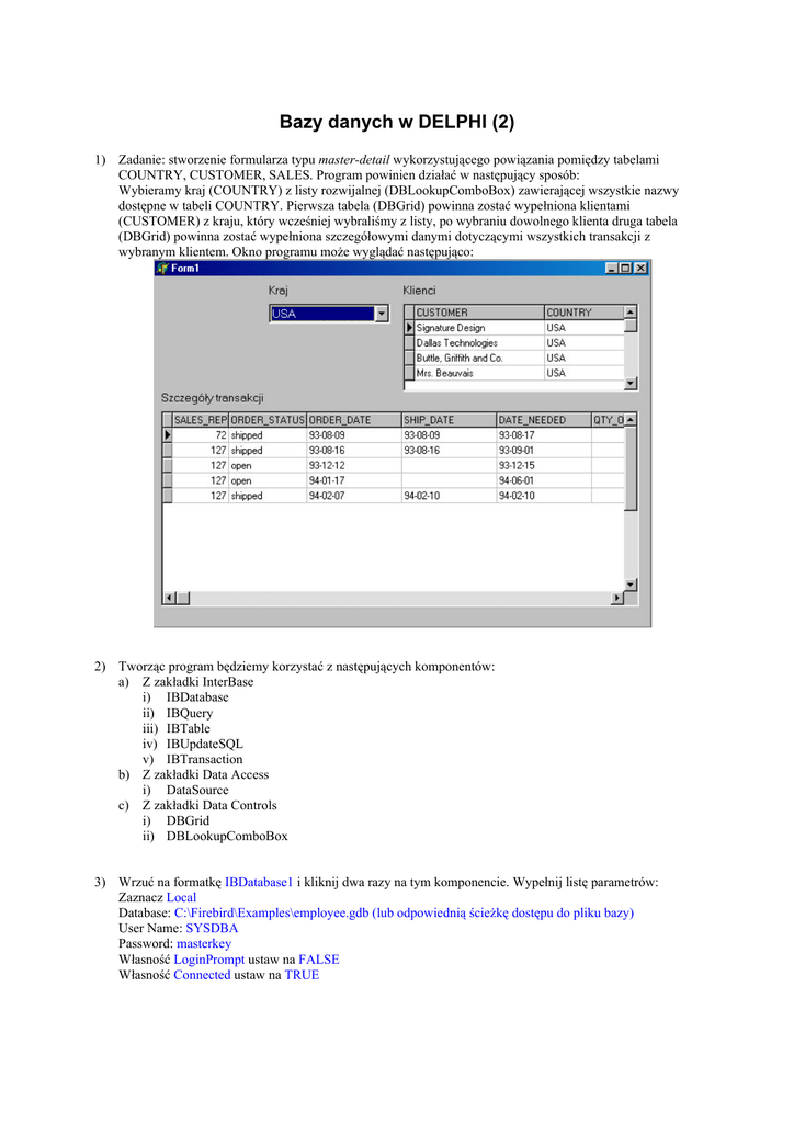 Bazy danych w DELPHI (2) 1) Zadanie: stworzenie formularza typu master-detail wykorzystującego powiązania pomiędzy tabelami COUNTRY, CUSTOMER, SALES. Program powinien działać w następujący sposób: Wybieramy kraj (COUNTRY) z listy rozwijalnej (DBLookupComboBox) zawierającej wszystkie nazwy dostępne w tabeli COUNTRY. Pierwsza tabela (DBGrid) powinna zostać wypełniona klientami (CUSTOMER) z kraju, który wcześniej wybraliśmy z listy, po wybraniu dowolnego klienta druga tabela (DBGrid) powinna zostać wypełniona szczegółowymi danymi dotyczącymi wszystkich transakcji z wybranym klientem. Okno programu może wyglądać następująco: 2) Tworząc program będziemy korzystać z następujących komponentów: a) Z zakładki InterBase i) IBDatabase ii) IBQuery iii) IBTable iv) IBUpdateSQL v) IBTransaction b) Z zakładki Data Access i) DataSource c) Z zakładki Data Controls i) DBGrid ii) DBLookupComboBox 3) Wrzuć na formatkę IBDatabase1 i kliknij dwa razy na tym komponencie. Wypełnij listę parametrów: Zaznacz Local Database: C:\Firebird\Examples\employee.gdb (lub odpowiednią ścieżkę dostępu do pliku bazy) User Name: SYSDBA Password: masterkey Własność LoginPrompt ustaw na FALSE Własność Connected ustaw na TRUE 4) Wrzuć na formatkę IBTransaction1 Dla własności DefaultDatabase wybierz IBDatabase1 Dla własności DefaultTransaction komponentu IBDatabase1 wybierz IBTransaction1 5) Wrzuć na formatkę IBQuery1 Dla własności Database wybierz IBDatabase1 Dla własności SQL: select COUNTRY from COUNTRY order by COUNTRY Ustaw własność Active na TRUE 6) Wrzuć na formatkę DataSource1 Dla własności DataSet wybierz IBQuery1 7) Wrzuć na formatkę DBLookupComboBox1 Dla własności ListSource wybierz DataSource1 Dla własności KeyField wybierz COUNTRY 8) Wrzuć na formatkę IBUpdateSQL1 9) Wrzuć na formatkę IBQuery2 Dla własności Database wybierz IBDatabase1 Dla własności SQL: select CUSTOMER, COUNTRY, CUST_NO from CUSTOMER WHERE COUNTRY=:kraj Dla własności UpdateObject wybierz IBUpdateSQL1 Ustaw własność Active na TRUE 10) Wrzuć na formatkę DataSource2 Dla własności DataSet wybierz IBQuery2 11) Ustaw własności IBUpdateSQL1 DeleteSQL: delete from CUSTOMER where CUST_NO = :OLD_CUST_NO InsertSQL: insert into CUSTOMER (CUSTOMER, COUNTRY) values (:CUSTOMER, :kraj) ModifySQL: update CUSTOMER set CUSTOMER = :CUSTOMER where CUST_NO = :OLD_CUST_NO RefreshSQL: 12) Wrzuć na formatkę DBGrid1 Dla własności DataSource wybierz DataSource2 wybierz kolumny które mają się wyświetlać CUSTOMER, COUNTRY i kolumnę która będzie ukryta CUST_NO Kliknij na wielokropek przy własności Columns, (lub dwukrotnie kliknij na komponent DBGrid1) następnie wybierz wszystkie kolumny przyciskiem Add All Files (ewentualnie usuń te , których nie potrzebujesz). Następnie ustaw własności pozostałych kolumn, klikając na nazwę kolumny. Dla kolumny CUST_NO ustaw własność Visible na false, dla pozostałych kolumn na true. 13) Dla DBLookupComboBox1 i zdarzenia OnClick niech wykonuje się: IBQuery2.Close; IBQuery2.Params[0].AsString:=DBLookupComboBox1.Text; IBQuery2.Open; 14) Sprawdź, czy ustawiłeś własność Active dla IBDatabase1, IBTransaction1, IBQuery1, IBQuery2 na true. 15) Uruchom program i sprawdź jak działa. Po zamknięciu programu: 16) Wrzuć na formatkę IBTable1 Dla własności Database wybierz IBDatabase1 Dla własności MasterSource wybierz DataSource2 Dla własności TableName wybierz SALES Klikając na wielokropku własności MasterFields zdefiniuj zależność CUST_NO=CUST_NO. Ustaw własność Active na TRUE 17) Wrzuć na formatkę DataSource3 Dla własności Data wybierz IBTable1 18) Wrzuć na formatkę DBGrid2 Dla własności DataSource wybierz DataSource3 wybierz kolumny które mają się wyświetlać Kliknij na wielokropek przy własności Columns, (lub dwukrotnie kliknij na komponent DBGrid1) następnie wybierz wszystkie kolumny przyciskiem Add All Files (ewentualnie usuń te , których nie potrzebujesz). Następnie ustaw własności pozostałych kolumn, klikając na nazwę kolumny. i zaznacz kolumny które będą ukryte np.: CUST_NO 19) W wyniku powyższych działań powinniśmy otrzymać okno projektu przypominające to na rysunku: