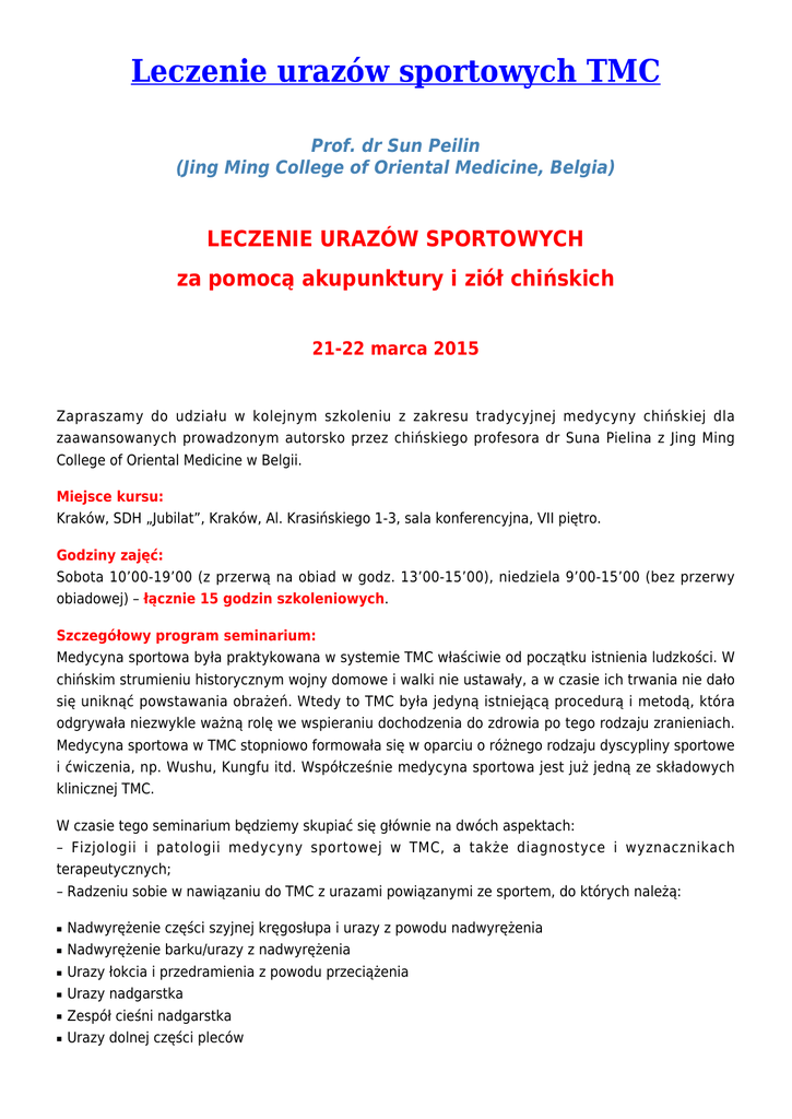 Leczenie urazów sportowych TMC Prof. dr Sun Peilin (Jing Ming College of Oriental Medicine, Belgia) LECZENIE URAZÓW SPORTOWYCH za pomocą akupunktury i ziół chińskich 21-22 marca 2015 Zapraszamy do udziału w kolejnym szkoleniu z zakresu tradycyjnej medycyny chińskiej dla zaawansowanych prowadzonym autorsko przez chińskiego profesora dr Suna Pielina z Jing Ming College of Oriental Medicine w Belgii. Miejsce kursu: Kraków, SDH „Jubilat”, Kraków, Al. Krasińskiego 1-3, sala konferencyjna, VII piętro. Godziny zajęć: Sobota 10’00-19’00 (z przerwą na obiad w godz. 13’00-15’00), niedziela 9’00-15’00 (bez przerwy obiadowej) – łącznie 15 godzin szkoleniowych. Szczegółowy program seminarium: Medycyna sportowa była praktykowana w systemie TMC właściwie od początku istnienia ludzkości. W chińskim strumieniu historycznym wojny domowe i walki nie ustawały, a w czasie ich trwania nie dało się uniknąć powstawania obrażeń. Wtedy to TMC była jedyną istniejącą procedurą i metodą, która odgrywała niezwykle ważną rolę we wspieraniu dochodzenia do zdrowia po tego rodzaju zranieniach. Medycyna sportowa w TMC stopniowo formowała się w oparciu o różnego rodzaju dyscypliny sportowe i ćwiczenia, np. Wushu, Kungfu itd. Współcześnie medycyna sportowa jest już jedną ze składowych klinicznej TMC. W czasie tego seminarium będziemy skupiać się głównie na dwóch aspektach: – Fizjologii i patologii medycyny sportowej w TMC, a także diagnostyce i wyznacznikach terapeutycznych; – Radzeniu sobie w nawiązaniu do TMC z urazami powiązanymi ze sportem, do których należą: ■ ■ ■ ■ ■ ■ Nadwyrężenie części szyjnej kręgosłupa i urazy z powodu nadwyrężenia Nadwyrężenie barku/urazy z nadwyrężenia Urazy łokcia i przedramienia z powodu przeciążenia Urazy nadgarstka Zespół cieśni nadgarstka Urazy dolnej części pleców ■ ■ ■ ■ ■ ■ ■ ■ ■ Zespół pourazowy biodra Urazy mięśni udowych Urazy łydki Urazy kolana Szyny golenia Zerwanie ścięgna Achillesa Skręcenie kostki Ostroga piętowa Dystrofia pourazowa Cena podstawowa: 750 zł – wpłata do dnia 6 lutego 2015 Cena zniżkowa: 690 zł – warunek: wpłata nie później niż do dnia 9 stycznia 2015 Ilość miejsc ograniczona, udział wg kolejności wpłat. Na życzenie wystawiamy rachunki (dla osób prywatnych lub firm). Uczestnicy seminarium otrzymają materiały szkoleniowe w języku polskim. Numer konta bankowego: Instytut Medycyny Chińskiej, 31-161 Kraków, ul. Szlak 14/12 Alior Bank, rachunek nr: 65 2490 0005 0000 4500 6348 0470 Prosimy o podanie tytułu wpłaty w treści: URAZY SPORTOWE Wykłady odbywają się w języku angielskim i tłumaczone są na język polski przez tłumacza dobrze znającego terminologię medycyny chińskiej i zachodniej. UWAGA: W dniu 20 marca 2015 r. (piątek) w godzinach 15:00-19:00 w Centrum Medycyny Chińskiej w Krakowie, ul. Warszawska 1 odbędzie się superwizja (konsultacje kliniczne) prowadzona przez prof. dr Suna Peilina. W superwizji mogą brać udział praktykujący medycynę chińską lekarze i terapeuci TMC. Pierwszeństwo mają lekarze i terapeuci zgłaszający swoich pacjentów. Koszt udziału w superwizji: pacjent 200 zł, lekarz/terapeuta TMC 100 zł. Prosimy o wcześniejsze przesłanie zgłoszeń – liczba uczestników i pacjentów ograniczona. Zgłoszenia: recepcja Centrum Medycyny Chińskiej: tel. 884-988-887 lub Marek Kalmus, tel. 502-090-301. Prof. dr Sun Peilin jest profesorem TCM na Guangxi University of Traditional Chinese Medicine oraz Jiangxi College of Traditional Chinese Medicine – obie uczelnie w Chinach, oraz Jing Ming College of Oriental Medicine, w Belgii. W Gandawie prowadzi własną klinikę oraz wykłada w renomowanych szkołach TCM w wielu krajach oraz zapraszany jest jako prelegent na międzynarodowe kongresy TMC. Od początku 2012 roku jest również głównym chińskim wykładowcą w naszym Instytucie Medycyny Chińskiej i Profilaktyki Zdrowia. Prowadzi także superwizje kliniczne w Centrum Medycyny Chińskiej w Krakowie. Prof. dr Sun Peilin jest autorem znanych książek: autorskich prac: „The Treatment of Pain with Chinese Herbs and Acupuncture” (jest również wydanie w języku niemieckim) i „Sports Medicine in TCM”, oraz “Management of Post-Operative Pain with Acupuncture” (razem z: Giovanni Maciocia) i “Bi Syndromes” (razem z: L. Vangermeersh). UWAGA: 1. W przypadku zgłoszenia przez uczestnika organizatorowi rezygnacji do dnia 6 lutego 2015 r. cała kwota wpisowego zostanie zwrócona na rachunek bankowy, z którego została wysłana, lub na rachunek bankowy podany w przypadku rezygnacji. Po tym terminie kwota wpisowego nie będzie zwracana i przechodzi na koszty organizacji kursu; możliwe jest jedynie przeniesienie tej kwoty na inną osobę wcześniej nie zgłoszoną (zmiana uczestnika kursu). 2. W przypadku zbyt małej ilości uczestników zgłoszonych do dnia 6 lutego 2015 kurs może zostać odwołany. W takim przypadku osoby, które wpłaciły wpisowe otrzymają całą kwotę przelewem na konto bankowe i zostaną o tym poinformowane przez organizatora mailem lub telefonicznie. Informacja o ewentualnym anulowaniu kursu podana zostanie także na stronie internetowej www.medycyna-chinska.com najpóźniej do dnia 13 lutego 2015 roku (brak informacji o anulowaniu kursu w terminie po 13 lutego 2015 oznacza, że kurs odbędzie się). Kontakt i dodatkowe informacje: Bożena Miczulska-Kalmus, kom. 503-150-462 Marek Kalmus, kom. 502-090-301 tel./fax 12 633-81-60 email: [email protected] informacje o kursach: www.medycyna-chinska.com Wyślij zgłoszenie lub zapytanie Imię* Nazwisko* Adres email* Nr telefonu* Temat Treść wiadomości WYŚLIJ