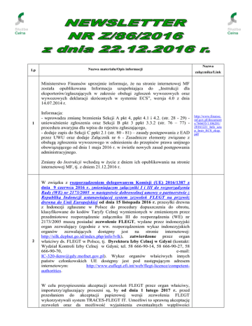Lp Nazwa materiału/Opis informacji Nazwa załącznika/Link Ministerstwo Finansów uprzejmie informuje, że na stronie internetowej MF została opublikowana Informacja uzupełniająca do „Instrukcji dla eksporterów/zgłaszających w zakresie obsługi zgłoszeń wywozowych oraz wywozowych deklaracji skróconych w systemie ECS”, wersja 4.0 z dnia 14.07.2014 r. 1 Informacja: - wprowadza zmianę brzmienia Sekcji A pkt 4, ppkt 4.1 i 4.2. (str. 28 - 29) unieważnienie zgłoszenia oraz Sekcji B pkt 3 ppkt 3.3.2 (str. 76 – 77) procedura awaryjna dla wpisu do rejestru zgłaszającego, - dodaje zapis do Sekcji C ppkt 2.1 (str. 80 - 81) – zasady postępowania z EAD przez UWU oraz dodaje Załącznik nr 6 - Zasadnicze elementy związane z obsługą zgłoszenia wywozowego w odniesieniu do przepisów prawa unijnego obowiązującego od dnia 1 maja 2016 r. w świetle nowych zasad postępowania administracyjnego. Zmiany do Instrukcji wchodzą w życie z dniem ich opublikowania na stronie internetowej MF, tj. z dniem 21.12.2016 r. 2 W związku z rozporządzeniem delegowanym Komisji (UE) 2016/1387 z dnia 9 czerwca 2016 r. zmieniającym załączniki I i III do rozporządzenia Rady (WE) nr 2173/2005 w następstwie dobrowolnej umowy o partnerstwie z Republiką Indonezji ustanawiającej system zezwoleń FLEGT na przywóz drewna do Unii Europejskiej od dnia 15 listopada 2016 r. przesyłki drewna z Indonezji zgłaszane w Polsce do procedury dopuszczenia do obrotu, klasyfikowane do kodów Taryfy Celnej wymienionych w zmienionym przez przedmiotowe rozporządzenie załączniku III do rozporządzenia (WE) nr 2173/2005 muszą posiadać zezwolenie FLEGT, wydane przez indonezyjski organ zezwalający (zgodnie z ww. rozporządzeniem wykaz indonezyjskich organów zezwalających dostępny jest na stronie internetowej: http://silk.dephut.go.id/index.php/info/lvlk), zatwierdzone przez organ właściwy ds. FLEGT w Polsce, tj. Dyrektora Izby Celnej w Gdyni (kontakt: Wydział Kontroli Izby Celnej w Gdyni; tel. 58 666-90-14, 58 666-90-27, 58 666-90-70, e-mail: [email protected]). Wykaz organów właściwych innych państw członkowskich UE dostępny jest pod następującym adresem internetowym: http://www.euflegt.efi.int/web/flegt-licence/competentauthorities. W celu przyspieszenia akceptacji zezwoleń FLEGT przez organ właściwy, importerzy/zgłaszający proszeni są, by od dnia 1 lutego 2017 r. przed przesłaniem do akceptacji papierowej wersji zezwolenia FLEGT wykorzystywali system TRACES-FLEGT IT. Umożliwi to sprawną akceptację zezwoleń oraz da możliwość wyjaśnienia ewentualnych wątpliwości http://www.finanse. mf.gov.pl/document s/766655/1106201/ 20161221_Info_uzu p_Instr_ECS_eksp. pdf dotyczących danych zawartych w zezwoleniu. Zgodnie z Dobrowolną Umową o Partnerstwie pomiędzy Unią Europejską i Republiką Indonezji dotycząca egzekwowania prawa, zarządzania i handlu w dziedzinie leśnictwa oraz handlu produktami z drewna wprowadzanymi na terytorium Unii Europejskiej (Dz. Urz. UE L 150 z 20.5.2014), indonezyjski organ zezwalający ma 21 kalendarzowych na udzielnie dodatkowych informacji w przypadku wątpliwości unijnego organu właściwego. Ponadto przyspieszy to proces informowania oddziału celnego, w którym dokonywana będzie odprawa celna przesyłki, o uznaniu zezwolenia. System FLEGT IT dostępny jest pod adresem internetowym: https://webgate.ec.europa.eu/tracesnt/ . Korzystanie z systemu warunkowane jest: posiadaniem „EU Login” (wcześniej numer ECAS), który może zostać utworzony za pośrednictwem strony https://webgate.ec.europa.eu/cas oraz przyznaniem roli „importer” przez administratorów systemu, która umożliwia: o tworzenie nowych zezwoleń (na podstawie informacji zawartych w zezwoleniu FLEGT wydanym przez organ zezwalający państwa partnerskiego), UWAGA: Po przedłożeniu w systemie zezwolenia w formie elektronicznej do akceptacji organu właściwego, nie ma możliwości jego modyfikacji w przypadku późniejszego stwierdzenia ew. błędu. Korekta wymaga kontaktu z organem właściwym. o elektroniczne przedkładanie ich do akceptacji organu właściwego, o wglądu do zezwoleń utworzonych przez siebie lub innych użytkowników tej samej firmy, o otrzymywania powiadomień o statusie zezwolenia UWAGA: Zezwolenie FLEGT przedkładane jest do akceptacji organu właściwego państwa członkowskiego, w którym dokonywane jest zgłoszenie przesyłki do procedury dopuszczenia do obrotu. Należy upewnić się, jakie zasady zatwierdzania zezwoleń zostały przyjęte w danym państwie członkowskim. przesłania do administratorów systemu na adres: [email protected] prośby o przyznanie roli „importera”. Wiadomość ta powinna być przesłana również do wiadomości organu właściwego, tj. na adres: [email protected] Instrukcja uzyskania EU Login oraz rejestracji w systemie FLEGT IT dostępna jest pod adresem: https://webgate.ec.europa.eu/tracesnt/userguide/flegt/index.html?page=landing . Pod linkiem https://webgate.training.ec.europa.eu/tracesnt dostępna jest również wersja treningowa systemu. Rejestracja do wersji treningowej wymaga wysłania prośby o przyznanie roli importera w wersji treningowej systemu jedynie na adres: [email protected] . Dodatkowe informacje dostępne są również na stronie http://www.flegtlicence.org oraz http://www.gdynia.scelna.gov.pl/start. Zespół „Newsletter”