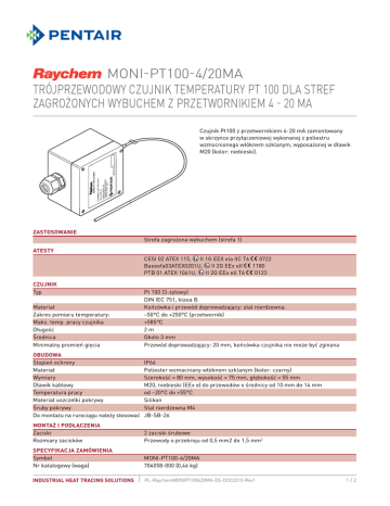 MONI-PT100-4/20MA Trójprzewodowy czujnik temperatury Pt 100 dla stref zagrożonych wybuchem z przetwornikiem 4 - 20 mA Czujnik Pt100 z przetwornikiem 4-20 mA zamontowany w skrzynce przyłączeniowej wykonanej z poliestru wzmocnionego włóknem szklanym, wyposażonej w dławik M20 (kolor: niebieski). Zastosowanie Strefa zagrożona wybuchem (strefa 1) Atesty CESI 02 ATEX 115, II 1G EEX eia IIC T6 0722 II 2G EEx eII 1180 Baseefa03ATEX0201U, II 2G EEx ell T6 0123 PTB 01 ATEX 1061U, Czujnik Typ Materiał Zakres pomiaru temperatury: Maks. temp. pracy czujnika Długość Średnica Minimalny promień gięcia Pt 100 (3-żyłowy) DIN IEC 751, klasa B. Końcówka i przewód doprowadzający: stal nierdzewna. –50°C do +250°C (przetwornik) +585°C 2m Około 3 mm Przewód doprowadzający: 20 mm, końcówka czujnika nie może być zginana Obudowa Stopień ochrony Materiał Wymiary Dławik kablowy Temperatura pracy Materiał uszczelki pokrywy Śruby pokrywy Do montażu na rurociągu należy stosować IP66 Poliester wzmacniany włóknem szklanym (kolor: czarny) Szerokość = 80 mm, wysokość = 75 mm, głębokość = 55 mm M20, niebieski (EEx e) do przewodów o średnicy od 10 mm do 14 mm od –20°C do +55°C Silikon Stal nierdzewna M4 JB-SB-26 Montaż i podłączenia Zaciski Rozmiary zacisków 2 zaciski śrubowe Przewody o przekroju od 0,5 mm2 do 1,5 mm2 Specyfikacja zamówienia Symbol Nr katalogowy (waga) MONI-PT100-4/20MA 704058-000 (0,46 kg) INDUSTRIAL HEAT TRACING SOLUTIONS PL-RaychemMONIPT100420MA-DS-DOC2210-Rev1 1/2 WWW.PENTAIRTHERMAL.PL POLSKA Tel. +48 22 331 29 50 Fax +48 22 331 29 51 [email protected] All Pentair trademarks and logos are owned by Pentair or its global affiliates. Pentair reserves the right to change specifications without prior notice. © 2012-2014 Pentair. INDUSTRIAL HEAT TRACING SOLUTIONS PL-RaychemMONIPT100420MA-DS-DOC2210-Rev1 2/2