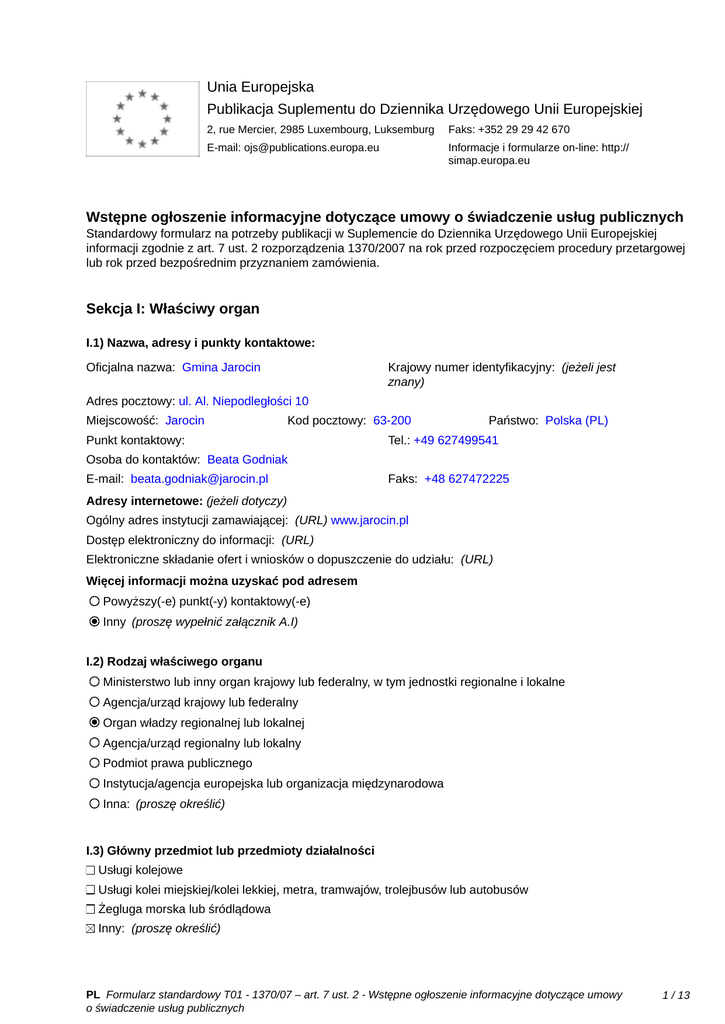 Unia Europejska Publikacja Suplementu do Dziennika Urzędowego Unii Europejskiej 2, rue Mercier, 2985 Luxembourg, Luksemburg Faks: +352 29 29 42 670 E-mail: [email protected] Informacje i formularze on-line: http:// simap.europa.eu Wstępne ogłoszenie informacyjne dotyczące umowy o świadczenie usług publicznych Standardowy formularz na potrzeby publikacji w Suplemencie do Dziennika Urzędowego Unii Europejskiej informacji zgodnie z art. 7 ust. 2 rozporządzenia 1370/2007 na rok przed rozpoczęciem procedury przetargowej lub rok przed bezpośrednim przyznaniem zamówienia. Sekcja I: Właściwy organ I.1) Nazwa, adresy i punkty kontaktowe: Krajowy numer identyfikacyjny: (jeżeli jest znany) _____ Oficjalna nazwa: Gmina Jarocin Adres pocztowy: ul. Al. Niepodległości 10 Miejscowość: Jarocin Kod pocztowy: 63-200 Punkt kontaktowy: _____ Państwo: Polska (PL) Tel.: +49 627499541 Osoba do kontaktów: Beata Godniak E-mail: [email protected] Faks: +48 627472225 Adresy internetowe: (jeżeli dotyczy) Ogólny adres instytucji zamawiającej: (URL) www.jarocin.pl Dostęp elektroniczny do informacji: (URL) _____ Elektroniczne składanie ofert i wniosków o dopuszczenie do udziału: (URL) _____ Więcej informacji można uzyskać pod adresem Powyższy(-e) punkt(-y) kontaktowy(-e) Inny (proszę wypełnić załącznik A.I) I.2) Rodzaj właściwego organu Ministerstwo lub inny organ krajowy lub federalny, w tym jednostki regionalne i lokalne Agencja/urząd krajowy lub federalny Organ władzy regionalnej lub lokalnej Agencja/urząd regionalny lub lokalny Podmiot prawa publicznego Instytucja/agencja europejska lub organizacja międzynarodowa Inna: (proszę określić) I.3) Główny przedmiot lub przedmioty działalności Usługi kolejowe Usługi kolei miejskiej/kolei lekkiej, metra, tramwajów, trolejbusów lub autobusów Żegluga morska lub śródlądowa Inny: (proszę określić) PL Formularz standardowy T01 - 1370/07 – art. 7 ust. 2 - Wstępne ogłoszenie informacyjne dotyczące umowy o świadczenie usług publicznych 1 / 13 Ogólne usługi publiczne I.4) Udzielenie zamówienia w imieniu innych właściwych organów Właściwy organ dokonuje zakupu w imieniu innych właściwych organów: tak nie (jeżeli tak, więcej informacji o tych właściwych organach można podać w załączniku A.II) PL Formularz standardowy T01 - 1370/07 – art. 7 ust. 2 - Wstępne ogłoszenie informacyjne dotyczące umowy o świadczenie usług publicznych 2 / 13 Sekcja II: Przedmiot zamówienia II.1) Opis: II.1.1) Nazwa nadana zamówieniu: Świadczenie usług w zakresie publicznego transportu zbiorowego II.1.2) Rodzaj zamówienia, dziedzina(-y), której(-ych) dotyczą usługi transportu publicznego: Kategoria usług: nr: T-05 (Zob. kategorie usług w załączniku B) Dziedziny, których dotyczą usługi transportu publicznego: Świadczenie usług w zakresie publicznego transportu zbiorowego Kod NUTS: PL41 II.1.3) Krótki opis zamówienia: 1. Podstawa prawna: art. 23 ust. 1 pkt. 1 w związku z art. 19 ust. 1 pkt. 3 ustawy z dnia 16 grudnia 2010 r. o publicznym transporcie zbiorowym (t.j. Dz. U. z 2015 r., poz. 1440 ze zm.). 2. Określenie przewidywanego trybu udzielenia zamówienia: Na podstawie art. 19 ust. 1 pkt 3 ustawy z dnia 16 grudnia 2010 r. o publicznym transporcie zbiorowym (t.j. Dz. U. z 2015 r., poz. 1440 ze zm.) organizator dokona wyboru operatora poprzez bezpośrednie zawarcie umowy o świadczenie usług w zakresie publicznego transportu zbiorowego, 3. Określenie rodzaju transportu oraz linii komunikacyjnej, linii komunikacyjnych lub sieci komunikacyjnej, na których będą wykonywane przewozy a) określenie rodzaj transportu: transport drogowy, przewozy autobusowe b) określenie sieci komunikacyjnej: przewozy autobusowe w publicznym transporcie zbiorowym na sieci komunikacyjnej, dla której Gmina Jarocin jest organizatorem publicznego transportu zbiorowego. 4. Zmiana informacji: Na podstawie art. 23 ust. 5 ustawy z dnia 16 grudnia 2010 r. o publicznym transporcie zbiorowym (t.j. Dz. U. z 2015 r., poz. 1440 ze zm.) zastrzega się możliwość zmiany powyższych informacji. II.1.4) Wspólny Słownik Zamówień (CPV) Główny przedmiot Słownik główny 60112000 Słownik uzupełniający (jeżeli dotyczy) II.1.5) Informacje na temat podwykonawstwa Przewidywane jest zlecenie podwykonawstwa: tak nie (jeżeli tak) Wartość lub część zamówienia, które prawdopodobnie będzie zlecone stronom trzecim: minimalny procent: _____ (%), maksymalny procent: _____ (%) wartości zamówienia albo Nieznana Krótki opis wartości/części zamówienia, które będzie zlecone podwykonawcom: _____ II.2) Ilość i/lub wartość usług Opis: _____ km usług publicznych w zakresie transportu pasażerskiego: _____ PL Formularz standardowy T01 - 1370/07 – art. 7 ust. 2 - Wstępne ogłoszenie informacyjne dotyczące umowy o świadczenie usług publicznych 3 / 13 Szacunkowy koszt bez VAT: (proszę podać wyłącznie dane liczbowe) _____ albo Zakres: między _____ i _____ Waluta: Waluta: II.3) Planowana data rozpoczęcia i czas trwania zamówienia lub termin realizacji Rozpoczęcie: 31/10/2019 (dd/mm/rrrr) Okres w miesiącach: 120 albo w dniach: _____ (od udzielenia zamówienia) PL Formularz standardowy T01 - 1370/07 – art. 7 ust. 2 - Wstępne ogłoszenie informacyjne dotyczące umowy o świadczenie usług publicznych 4 / 13 Sekcja III: Informacje o charakterze prawnym, ekonomicznym, finansowym i technicznym III.1) Warunki dotyczące zamówienia: III.1.1) Parametry kosztów w celu obliczenia rekompensaty: _____ III.1.2) Informacje o wyłącznych prawach: Przyznano wyłączne prawa tak nie (jeżeli tak) Wyszczególnienie przyznanych wyłącznych praw: _____ III.1.3) Podział przychodów ze sprzedaży biletów: Odsetek przydzielony podmiotowi świadczącemu usługi publiczne: _____ (%) (uznaje się, że pozostała część jest przyznawana właściwemu organowi) III.1.4) Standardy socjalne: (przejęcie personelu zgodnie z dyrektywą 
