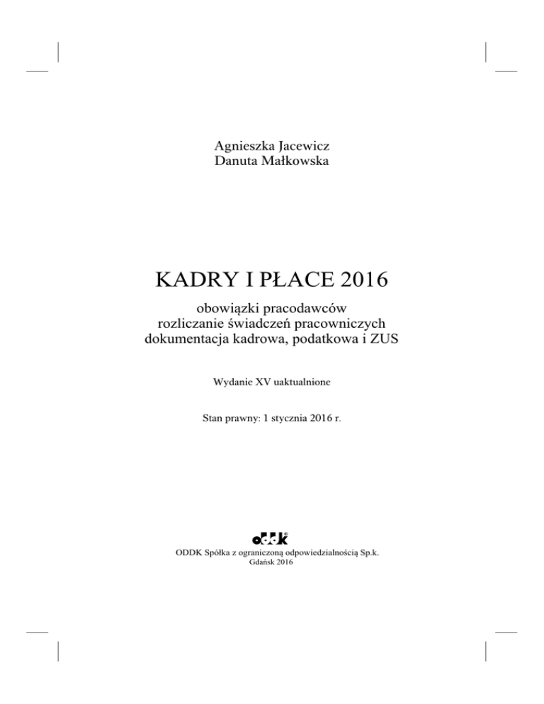 Agnieszka Jacewicz Danuta Małkowska KADRY I P£ACE 2016 obowi¹zki pracodawców rozliczanie œwiadczeñ pracowniczych dokumentacja kadrowa, podatkowa i ZUS Wydanie XV uaktualnione Stan prawny: 1 stycznia 2016 r. ODDK Spó³ka z ograniczon¹ odpowiedzialnoœci¹ Sp.k. Gdañsk 2016 Spis treści Spis treści Spis treści Wykaz skrótów . . . . . . . . . . . . . . . . . . . . . . . . . . . . . . . . . . . . . . . . . . . . . . . . . . . . . . . . . . . . . . 9 Wstęp . . . . . . . . . . . . . . . . . . . . . . . . . . . . . . . . . . . . . . . . . . . . . . . . . . . . . . . . . . . . . . . . . . . . . . 11 Rozdział 1 Nawiązanie stosunku pracy . . . . . . . . . . . . . . . . . . . . . . . . . . . . . . . . . . . . . . . . . . . . . . . . . . 13 1. Charakterystyka i zasady nawiązania stosunku pracy . . . . . . . . . . . . . . . . . . . . . . . . 13 1.1. Istota stosunku pracy. . . . . . . . . . . . . . . . . . . . . . . . . . . . . . . . . . . . . . . . . . . . . . . . 13 1.2. Zanim dojdzie do podpisania umowy o pracę . . . . . . . . . . . . . . . . . . . . . . . . . . 24 1.3. Zawarcie umowy o pracę . . . . . . . . . . . . . . . . . . . . . . . . . . . . . . . . . . . . . . . . . . . . 25 2. Obowiązki pracodawcy wobec nowo zatrudnionych. . . . . . . . . . . . . . . . . . . . . . . . . 27 2.1. Badania profilaktyczne . . . . . . . . . . . . . . . . . . . . . . . . . . . . . . . . . . . . . . . . . . . . . . 28 2.2. Zapoznanie z aktami prawa wewnętrznego . . . . . . . . . . . . . . . . . . . . . . . . . . . . 30 2.3. Prowadzenie akt osobowych . . . . . . . . . . . . . . . . . . . . . . . . . . . . . . . . . . . . . . . . . 34 2.4. Bezpieczeństwo i higiena pracy . . . . . . . . . . . . . . . . . . . . . . . . . . . . . . . . . . . . . . 38 2.5. Ustalenie stażu pracy nowo zatrudnionego pracownika. . . . . . . . . . . . . . . . . . 40 2.6. Obowiązki w zakresie ubezpieczeń społecznych, ubezpieczenia zdrowotnego oraz podatku dochodowego. . . . . . . . . . . . . . . . . . . . . . . . . . . . . . 41 2.7. Obowiązki informacyjne zakładu pracy. . . . . . . . . . . . . . . . . . . . . . . . . . . . . . . . 45 3. Sankcje za naruszenie prawa pracy . . . . . . . . . . . . . . . . . . . . . . . . . . . . . . . . . . . . . . . . 45 3.1. Odpowiedzialność pracodawcy . . . . . . . . . . . . . . . . . . . . . . . . . . . . . . . . . . . . . . . 45 3.2. Odpowiedzialność osoby prowadzącej sprawy kadrowe . . . . . . . . . . . . . . . . . 47 4. Przykład – przyjęcie pracownika do pracy. . . . . . . . . . . . . . . . . . . . . . . . . . . . . . . . . . 49 5. Inne formy angażowania pracowników . . . . . . . . . . . . . . . . . . . . . . . . . . . . . . . . . . . . 64 5.1. Zatrudnianie młodocianych . . . . . . . . . . . . . . . . . . . . . . . . . . . . . . . . . . . . . . . . . . 64 5.2. Praktyka absolwencka . . . . . . . . . . . . . . . . . . . . . . . . . . . . . . . . . . . . . . . . . . . . . . . 69 Rozdział 2 Wynagrodzenie ze stosunku pracy . . . . . . . . . . . . . . . . . . . . . . . . . . . . . . . . . . . . . . . . . . . . 75 1. Wynagrodzenie za pracę i zasady jego ustalania. . . . . . . . . . . . . . . . . . . . . . . . . . . . . 75 1.1. Istota wynagrodzenia i jego elementy składowe . . . . . . . . . . . . . . . . . . . . . . . . 75 1.2. Termin wypłaty wynagrodzenia . . . . . . . . . . . . . . . . . . . . . . . . . . . . . . . . . . . . . . 77 1.3. Ochrona wynagrodzenia za pracę . . . . . . . . . . . . . . . . . . . . . . . . . . . . . . . . . . . . . 78 1.4. Wynagrodzenie minimalne . . . . . . . . . . . . . . . . . . . . . . . . . . . . . . . . . . . . . . . . . . 78 2. Czas pracy i jego ewidencja . . . . . . . . . . . . . . . . . . . . . . . . . . . . . . . . . . . . . . . . . . . . . . 82 2.1. Normy i wymiar czasu pracy . . . . . . . . . . . . . . . . . . . . . . . . . . . . . . . . . . . . . . . . . 82 2.2. Systemy czasu pracy . . . . . . . . . . . . . . . . . . . . . . . . . . . . . . . . . . . . . . . . . . . . . . . . 90 2.3. Ewidencja czasu pracy . . . . . . . . . . . . . . . . . . . . . . . . . . . . . . . . . . . . . . . . . . . . . . 94 3 Spis treści 2.4. Praca w dni świąteczne i w porze nocnej . . . . . . . . . . . . . . . . . . . . . . . . . . . . . . 99 2.5. Czas pracy kadry kierowniczej . . . . . . . . . . . . . . . . . . . . . . . . . . . . . . . . . . . . . . 103 2.6. Odpoczynek i przerwy w pracy . . . . . . . . . . . . . . . . . . . . . . . . . . . . . . . . . . . . . 104 3. Praca w godzinach nadliczbowych . . . . . . . . . . . . . . . . . . . . . . . . . . . . . . . . . . . . . . . 109 3.1. Istota pracy w godzinach nadliczbowych . . . . . . . . . . . . . . . . . . . . . . . . . . . . . 109 3.2. Ustalenie przekroczenia norm czasu pracy. . . . . . . . . . . . . . . . . . . . . . . . . . . . 110 3.3. Rekompensata za pracę w godzinach nadliczbowych . . . . . . . . . . . . . . . . . . 114 Rozdział 3 Rozliczanie i dokumentowanie wynagrodzeń . . . . . . . . . . . . . . . . . . . . . . . . . . . . . . . . . 123 1. Procedura naliczania wynagrodzenia . . . . . . . . . . . . . . . . . . . . . . . . . . . . . . . . . . . . . 123 1.1. Ustalenie przychodu pracownika . . . . . . . . . . . . . . . . . . . . . . . . . . . . . . . . . . . . 123 1.2. Składki na ubezpieczenia społeczne finansowane przez pracownika . . . . . 125 1.3. Składka na ubezpieczenie zdrowotne . . . . . . . . . . . . . . . . . . . . . . . . . . . . . . . . 130 1.4. Zaliczka na podatek dochodowy od osób fizycznych – rozliczenie z urzędem skarbowym . . . . . . . . . . . . . . . . . . . . . . . . . . . . . . . . . 133 1.5. Pozostałe potrącenia obowiązkowe z wynagrodzeń . . . . . . . . . . . . . . . . . . . . 147 1.6. Wynagrodzenie w walucie obcej. . . . . . . . . . . . . . . . . . . . . . . . . . . . . . . . . . . . . 153 2. Składki finansowane przez pracodawcę . . . . . . . . . . . . . . . . . . . . . . . . . . . . . . . . . . . 155 2.1. Składki na ubezpieczenia społeczne (emerytalne, rent