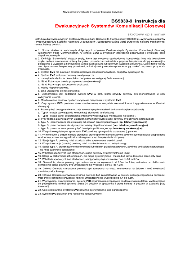 Nowa norma brytyjska dla Systemów Ewakuacji Budynków BS5839-9 instrukcja dla Ewakuacyjnych Systemów Komunikacji Głosowej skrótowy opis normy Instrukcja dla Ewakuacyjnych Systemów Komunikacji Głosowej to 9 część normy BS5839 pt.„Wykrywanie pożarów i Przeciwpożarowe Systemy Alarmowe w budynkach”. Szczególna uwagę warto zwrócić na niektóre fragmenty tej normy. Należą do nich: ▲ 1. Norma dostarcza wytycznych dotyczących używania Ewakuacyjnych Systemów Komunikacji Głosowej [Emergency Voice Communication, w skrócie EVC] w sytuacjach zagrożenia pożarowego i ewakuacji osób niepełnosprawnych. ▲ 2. Definicja ‘Schronienia’ dotyczy strefy, która jest otoczona ognioodporną konstrukcją (inną niż jakakolwiek część będąca zewnętrzną ścianą budynku i posiada bezpośrednie - poprzez bezpieczną drogę ewakuacji – połączenie z wyjściem z kondygnacji, windą ewakuacyjną lub głównym wyjściem z budynku. Dzięki temu tworzy ona tymczasową bezpieczną przestrzeń, w której osoby niepełnosprawne mogą czekać na pomoc przy w ich ewakuacji. ▲ 3. System EVC nie powinien zawierać żadnych części ruchomych np. napędów dyskowych itp. ▲ 4. System EVC jest przeznaczony do użycia przez : a. zarządcę budynku lub kompleksu budynków we wstępnej fazie ewakuacji. b. Straż Pożarną w trakcie przeprowadzanej ewakuacji. c. Straż Pożarną po zakończeniu ewakuacji. d. osoby niepełnosprawne. e. jako urządzenie do nasłuchiwania ▲ 5. Ekonomicznie jest podłączyć system EVC w pętli, której obwody powinny być monitorowane w celu wykrywania usterek. ▲ 6. Monitorowane powinny być też wszystekie połączenia w systemie EVC ▲ 7. Cały system EVC powinien stale monitorowany a wszystkie nieprawidłowości sygnalizowane w Centrali sterującej. ▲ 8. Powinny być dostępne dwa rodzaje zewnetrzęnych urządzeń do komunikacji (stacja/panel) a. Typ A - stacja używająca do komunikacji słuchawki telefonicznej b. Typ B - stacja-panel do połączenia interkomowego (typowo montowana na ścianie). ▲ 9. Typy rodzaje zewnetrzęnych urządzeń komunikacyjnych (stacji) powinny być używane następująco: a. typu A, przeznaczone dla ewakuacji lub działań przeciwpożarowych (np. telefony pożarowe) b. typu B, przeznaczone do użycia przez osoby niepełnosprawne ( np. interkomy ewakuacyjne) c. typu B, przeznaczone powinny być do użycia publicznego ( np. interkomy ewakuacyjne) ▲ 10. Wszystkie regulatory w systemach EVC powinny być wyraźnie oznaczone (opisane). ▲ 11. W miejscach o dużym hałasie otoczenia, stacje (panele) komunikacyjne powinny być dodatkowo zaopatrzone w widoczny, czerwony sygnalizator ostrzegawczy np. lampkę stroboskopową. ▲ 12. Stacje typu A, powinny mieć drzwiczki albo zdejmowany przedni panel. ▲ 13. Wszystkie stacje (panele) powinny mieć możliwość montażu podtynkowego. ▲ 14. Stacje typu A, przeznaczone dla ewakuacji lub działań przeciwpożarowych, powinne być koloru czerwonego lub mieć czerwone oznaczenie. ▲ 15. W halach sportowych i na stadionach, stacje powinny być zamykalne na klucz. ▲ 16. Stacje w platformach schronieniach, nie mogą być zamykane i muszą być łatwo dostępne przez cały czas ▲ 17. W halach sportowych i na stadionach, stacj powinny być rozmieszczone co 30 metrów. ▲ 18. Generalnie, stacje powinny być umieszczone na wysokości od 1.3m do 1.4m, natomiast w platformach schronienia stacje powinny być umieszczone na wysokości od 0.9 do 1.2m. ▲ 19. Główna Centrala sterowania powinna być zamykana na klucz, montowana na ścianie i mieć możliwość montażu podtynkowego. ▲ 20. Główna Centrala sterowania powinna powinna być zainstalowana w miejscu niskiego zagrożenia pożarem i mieć swoje centrum sterowania i kontroli umieszczone na wysokości od 1.4 do 1.5m. ▲ 21. W przypadku awarii zasilania, system EVC powinień mieć zapasowe zasilanie z akumulatora, wystarczające do podtrzymania funkcji systemu przez 24 godziny w spoczynku i przez kolejne 3 godziny w działaniu przy ewakuacji ▲ 22. Całe okablowanie systemu EVC powinno być wykonane jako ognioodporne. ▲ 23. System EVC powinien być regularnie konserwowany.
