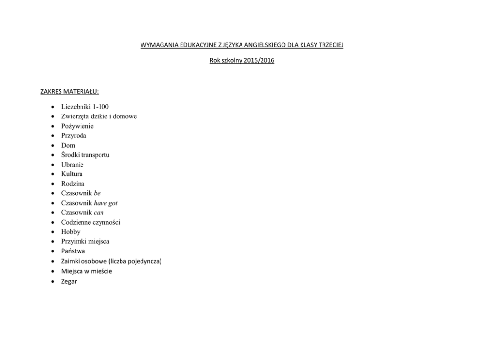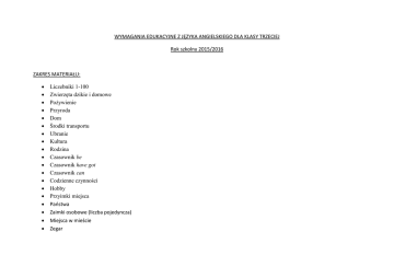 WYMAGANIA EDUKACYJNE Z JĘZYKA ANGIELSKIEGO DLA KLASY TRZECIEJ Rok szkolny 2015/2016 ZAKRES MATERIAŁU: Liczebniki 1-100 Zwierzęta dzikie i domowe Pożywienie Przyroda Dom Środki transportu Ubranie Kultura Rodzina Czasownik be Czasownik have got Czasownik can Codzienne czynności Hobby Przyimki miejsca Państwa Zaimki osobowe (liczba pojedyncza) Miejsca w mieście Zegar Poziom wykraczający (W)- czynności, które należą do treści poznawanych w klasie, ale są samodzielnie pogłębiane, często wykraczają poza treści programowe. Zależą od zainteresowań ucznia Poziom dopełniający (D)- opanowanie pełnego zakresu treści kształcenia, zawierającego elementy trudne do opanowania i wymagające transferu wiedzy Poziom rozszerzający (R)- elementy treści trudniejszych, ale niezbędnych na danym etapie kształcenia Poziom podstawowy (P)- opanowanie treści ważnych i uniwersalnych, stanowiących podstawę percepcji treści na wyższych poziomach Poziom konieczny (K)- zakres wiadomości i umiejętności niezbędnych do funkcjonowania w szkole i w życiu Pamięciowe opanowanie słownictwa Uczeń bezbłędnie wymawia i rozumie słownictwo poznane, a także dodatkowe Uczeń bardzo dobrze wymawia i rozumie poznane słownictwo Uczeń czasami popełnia błędy w wymowie i rozumieniu poznanego słownictwa Uczeń często popełnia błędy w wymowie i rozumieniu poznanego słownictwa Słuchanie Uczeń bezbłędnie rozpoznaje usłyszane słowa i zdania, nie wymaga powtórzeń Uczeń rozpoznaje usłyszane słowa i zdania, sporadycznie prosi o powtórzenie Uczeń rozpoznaje usłyszane słowa i zdania po powtórzeniu Uczeń rozpoznaje usłyszane słowa i zdania po kilkakrotnym powtórzeniu Uczeń popełnia liczne błędy w wymowie i rozumieniu poznanego słownictwa, opanowuje jedynie pojedyncze słowa Uczeń słabo rozpoznaje usłyszane słowa i zdania, wymaga licznych powtórzeń Mówienie Uczeń mówi płynnie i bezbłędnie używając znanych i dodatkowych słów Uczeń czyta płynnie i bezbłędnie znany i nowy tekst ze zrozumieniem Uczeń pisze bezbłędnie trudne i nowe słowa, używa ich w zdaniach Uczeń mówi płynnie i bezbłędnie używając znanych słów Uczeń mówi dość płynnie, popełnia nieliczne błędy używając znanych słów Uczeń czyta płynnie i bezbłędnie znany tekst ze zrozumieniem Uczeń pisze bezbłędnie znane słowa, używa ich w zdaniach Uczeń czyta z nielicznymi błędami, czasem potrzebuje Uczeń pisze z nielicznymi błędami Uczeń mówi pojedynczymi słowami, popełnia błędy, wymaga pomocy Uczeń czyta z błędami, często nie rozumie tekstu Uczeń prowadzi zeszyt przedmiotowy i zeszyt ćwiczeń bardzo starannie i systematycznie Uczeń prowadzi zeszyt przedmiotowy i zeszyt ćwiczeń starannie i systematycznie Uczeń prowadzi zeszyt przedmiotowy i zeszyt ćwiczeń stosunkowo starannie i systematycznie Wymaganie Czytanie Pisanie Prowadzenie zeszytu ćwiczeń i zeszytu przedmiotowego Uczeń popełnia błędy w pisowni znanych słów Uczeń prowadzi zeszyt przedmiotowy i zeszyt ćwiczeń mało starannie i niezbyt systematycznie Uczeń używa niektórych poznanych słów, wymaga pomocy Uczeń słabo czyta, popełnia liczne błędy, bardzo często nie rozumie Uczeń popełnia bardzo liczne błędy, wymaga pomocy n-la Uczeń prowadzi zeszyt przedmiotowy i zeszyt ćwiczeń bardzo niestarannie i Przygotowanie do zajęć i aktywność ucznia Uczeń zawsze przynosi na zajęcia potrzebne materiały, bierze aktywny udział w lekcji; bierze udział w konkursach i odnosi w nich sukcesy Uczeń zawsze przynosi na zajęcia potrzebne materiały, bierze aktywny udział w lekcji Uczeń zazwyczaj jest przygotowany do zajęć, jest mało aktywny Uczeń stosunkowo często jest nieprzygotowany do zajęć niesystematycznie Uczeń bardzo często jest nieprzygotowany do zajęć nie brierze aktywnego udziału w lekcji Poziom poniżej oczekiwań- uczeń nie spełnia wymagań na poziom konieczny, jego braki w wiadomościach i umiejętnościach nie pozwalają na kontynuowanie nauki w wyższej klasie.