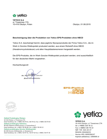 YETICO S.A ul. Towarowa 17A 10-416 Olsztyn, Polen Olsztyn, 01.08.2015 Bescheinigung über die Produktion von Yetico EPS-Produkten ohne HBCD Yetico S.A. bescheinigt hiermit, dass jegliche Styroporprodukte der Firma Yetico S.A., die im Werk in Gorzów Wielkopolski produziert werden, aus einem Rohstoff ohne HBCD (Hexabromcyclododecan) und allen Hauptdiastereomeren hergestellt werden. Die EPS-Produkte, die im Werk Gorzów Wielkopolski produziert werden, sind ausschließlich für den deutschen Markt vorgesehen. Hochachtungsvoll Zakład Produkcyjny Olsztyn: 10-416 Olsztyn, ul Towarowa 17A Dział Handlowy: tel. (+4889) 538 78 51, 538 78 52, Fax: (+4889) 538 78 50 Zakład produkcyjny Galewice: 98-405 Galewice k/Wieruszowa, ul. Przemysłowa 5 Dział Handlowy: tel. (+4862) 783 80 89, Fax: (+4862) 783 80 22 Zakład produkcyjny Gorzów Wielkopolski: 66-400 Gorzów Wielkopolski, ul. Mosiężna 14 Dział Handlowy: tel. (+4895) 720 97 01, 720 97 02 Fax: (+4895) 720 97 30 YETICO S.A. 10-416 Olsztyn, ul. Towarowa 17A tel. (+4889) 538 78 11 Fax: (+4889) 538 78 10 NIP: 739 -010-20-47 REGON: 004446253 Numer KRS: 0000296247 Kapitał zakładowy: 1000000 zł
