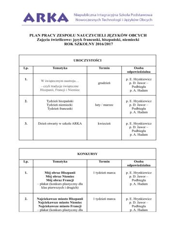 PLAN PRACY ZESPOŁU NAUCZYCIELI JĘZYKÓW OBCYCH Zajęcia świetlicowe: język francuski, hiszpański, niemiecki ROK SZKOLNY 2016/2017 UROCZYSTOŚCI Lp. Tematyka Termin 1. W świątecznym nastroju… grudzień - czyli tradycje świąteczne Hiszpanii, Francji i Niemiec 2. 3. Osoba odpowiedzialna p. E. Hrynkiewicz p. D. Jawor – Podbiegła p. A. Hadam Tydzień hiszpański Tydzień niemiecki Tydzień francuski luty / marzec p. E. Hrynkiewicz p. D. Jawor – Podbiegła p. A. Hadam Dzień otwarty w szkole ARKA kwiecień p. E. Hrynkiewicz p. D. Jawor – Podbiegła p. A. Hadam KONKURSY Lp. Tematyka Termin Osoba odpowiedzialna 1. Mój obraz Hiszpanii Mój obraz Niemiec Mój obraz Francji – plakat (konkurs plastyczny dla klas pierwszych i drugich) 1 tydzień marca p. E. Hrynkiewicz p. D. Jawor – Podbiegła p. A. Hadam 2. Najciekawsze miasto Hiszpanii Najciekawsze miasto Niemiec Najciekawsze miasto Francji – plakat (konkurs plastyczny dla 1 tydzień marca p. E. Hrynkiewicz p. D. Jawor – Podbiegła p. A. Hadam klas trzecich) 3. ,,Mój pierwszy obrazkowy słowniczek z języka hiszpańskiego” ,,Mój pierwszy obrazkowy słowniczek z języka niemieckiego” ,,Mój pierwszy obrazkowy słowniczek z języka francuskiego” - konkurs dla klas pierwszych i drugich maj p. E. Hrynkiewicz p. D. Jawor – Podbiegła p. Hadam 4. Konkurs wiedzy z języka hiszpańskiego. Konkurs wiedzy z języka niemieckiego. - konkurs dla klas trzecich maj p. E. Hrynkiewicz p. D. Jawor – Podbiegła