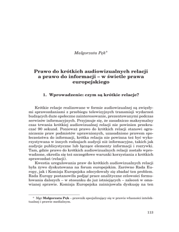 M.Pęk, Prawo do krótkich audiowizualnych relacji a prawo do informacji... Małgorzata Pęk* Prawo do krótkich audiowizualnych relacji a prawo do informacji – w świetle prawa europejskiego 1. Wprowadzenie: czym są krótkie relacje? Krótkie relacje realizowane w formie audiowizualnej są zwięzłymi sprawozdaniami z przebiegu telewizyjnych transmisji wydarzeń budzących duże społeczne zainteresowanie, prezentowanymi podczas serwisów informacyjnych. Przyjmuje się, że zasadniczo maksymalny czas trwania krótkiej audiowizualnej relacji nie powinien przekraczać 90 sekund. Ponieważ prawo do krótkich relacji stanowi ograniczenie praw podmiotów uprawnionych, uzasadnione prawem społeczeństwa do informacji, krótka relacja nie powinna też być wykorzystywana w innych rodzajach audycji niż informacyjne, takich jak audycje publicystyczne lub łączące elementy informacji i rozrywki. Tam, gdzie prawo do krótkich audiowizualnych relacji zostało wprowadzone, określa się też szczegółowe warunki korzystania z krótkich sprawozdań (relacji). Kwestia uregulowania praw do krótkich audiowizualnych relacji była żywo dyskutowana na forum europejskim. Zarówno Rada Europy, jak i Komisja Europejska zdecydowały się zbadać ten problem. Rada Europy postanowiła podjąć prace analityczne celowości formułowania dalszych – w stosunku do już istniejących – zaleceń w omawianej sprawie. Komisja Europejska zainicjowała dyskusję na ten * Mgr Małgorzata Pęk – prawnik specjalizujący się w prawie własności intelektualnej i prawie medialnym. 113 Studia Europejskie, 2/2007 temat w związku z przeprowadzaną rewizją dyrektywy „O telewizji bez granic” w ramach tzw. grupy fokusowej ds. prawa do informacji, a także podczas pisemnych konsultacji społecznych posumowanych podczas konferencji w Liverpoolu we wrześniu 2005 roku. Konsultacje związane z rewizją dyrektywy zaowocowały zamieszczeniem w ogłoszonej 13 grudnia 2005 roku przez KE propozycji nowej dyrektywy zmieniającej dyrektywę „O telewizji bez granic” (projekt dyrektywy o audiowizualnych usługach medialnych). W projekcie tym znalazły się pewne postanowienia z zakresu sposobu realizacji prawa do krótkich audiowizualnych relacji. Dyskusja na temat prawa do krótkich relacji audiowizualnych wpisuje się w dyskurs o podejściu do swobody wypowiedzi i prawa społeczeństwa do informacji w kontekście prawa do ochrony własności i inwestycji. Wolności stanowiące zasady demokratycznego państwa prawa tworzą wzajemnie uzupełniający się system. Sposób ich realizowania może niekiedy prowadzić do pytania o zakres tych często przeciwstawnych praw. Wolność wypowiedzi oraz prawo do informacji mają służyć stworzeniu środkom masowego przekazu warunków do wypełniania roli głównego źródła wiadomości. Dlatego istotne jest zapewnienie pluralizmu źródeł informacji i mechanizmów gwarantujących powszechny, nieskrępowany dostęp społeczeństwa do informacji. Z drugiej strony we wspomnianej debacie często podnoszono argumenty, że wolność mediów powinna być odpowiednio wyważona z prawem własności, w tym z prawem własności intelektualnej. Rozważając kwestię uregulowania prawa do krótkich sprawozdań, należy się odnieść do kwestii dopuszczalności takiego ograniczenia praw autorskich i pokrewnych w świetle międzynarodowych konwencji z zakresu tych praw, a także postanowień prawa wspólnotowego. Trzeba się tu odwołać m.in. do Międzynarodowej konwencji o ochronie wykonawców, producentów fonogramów oraz organizacji nadawczych sporządzonej w Rzymie 26 października 1961 roku (Konwencji Rzymskiej), Aktu Paryskiego Konwencji Berneńskiej o ochronie dzieł literackich i artystycznych sporządzonego w Paryżu Art. 15 ust. 1 lit. b: „Umawiające się Państwo może przewidzieć w przepisach swojego prawa krajowego wyłączenie z ochrony zagwarantowanej przez niniejszą konwencję w zakresie wykorzystania krótkich fragmentów w związku ze sprawozdaniami z bieżących wydarzeń”. 114 M.Pęk, Prawo do krótkich audiowizualnych relacji a prawo do informacji... 24 lipca 1971 roku (Konwencji Berneńskiej), Porozumienia TRIPS, (w tym w kontekście konieczności przeprowadzenia trzystopniowego testu), a także do dyrektyw wspólnotowych, w szczególności uregulowania dopuszczalnych wyjątków i ograniczeń w dyrektywie 2001/29/ WE w sprawie harmonizacji niektórych aspektów praw autorskich i pokrewnych w społeczeństwie informacyjnym. Do dylematów tych nawiązywano podczas debaty w sprawie prawa do krótkich relacji audiowizualnych. Problemy te, a także sposób podejścia na gruncie europejskim do kwestii prawa do krótkich relacji, zostaną przybliżone w dalszej części niniejszego artykułu. Art. 10bis: „1. Ustawodawstwu państw należących do Związku zastrzega się możliwość zezwolenia na odtwarzanie w prasie, radiu lub telewizji albo na publiczne rozpowszechnianie, za pomocą środków przekazu przewodowego, artykułów na aktualne tematy gospodarcze, polityczne lub religijne opublikowanych w dziennikach lub czasopismach bądź mających ten sam charakter, ale nadawanych drogą radiowo-telewizyjną, jeżeli taka reprodukcja, takie nadanie lub transmisje nie są wyraźnie zastrzeżone. Zawsze jednak powinno być wyraźnie wskazane źródło; obowiązek ten powinien być usankcjonowany przez ustawodawstwo państwa, w którym żąda się ochrony. 2. Ustawodawstwu państw należących do Związku zastrzega się również określenie warunków, po których spełnieniu mogą być w sprawozdaniach z aktualnych wydarzeń reprodukowane albo udostępniane publicznie – w stopniu uzasadnionym celami informacyjnymi – za pomocą środków fotograficznych lub filmowych bądź drogą radiowo-telewizyjną lub za pomocą środków przekazu przewodowego dzieła literackiego lub artystycznego oglądane lub słyszane w toku wydarzeń”. Art. 14 ust. 6 Międzynarodowej konwe