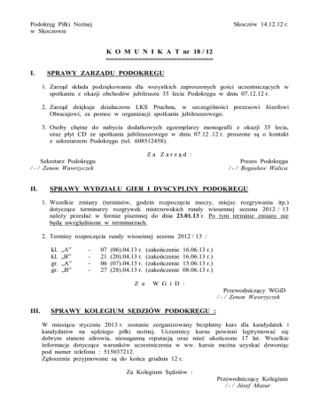 Podokręg Piłki Nożnej w Skoczowie Skoczów 14.12.12 r. K O M U N I K A T nr 18 / 12 =========================== I. SPRAWY ZARZĄDU PODOKRĘGU 1. Zarząd składa podziękowania dla wszystkich zaproszonych gości uczestniczących w spotkaniu z okazji obchodów jubileuszu 35 lecia Podokręgu w dniu 07.12.12 r. 2. Zarząd dziękuje działaczom LKS Pruchna, w szczególności prezesowi Józefowi Obracajowi, za pomoc w organizacji spotkania jubileuszowego. 3. Osoby chętne do nabycia dodatkowych egzemplarzy monografii z okazji 35 lecia, oraz płyt CD ze spotkania jubileuszowego w dniu 07.12 .12 r. proszone są o kontakt z sekretarzem Podokręgu (tel. 608512458). Za Zarząd : Sekretarz Podokręgu / - / Zenon Wawrzyczek II. Prezes Podokręgu / - / Bogusław Walica SPRAWY WYDZIAŁU GIER I DYSCYPLINY PODOKRĘGU 1. Wszelkie zmiany (terminów, godzin rozpoczęcia meczy, miejsc rozgrywania itp.) dotyczące terminarzy rozgrywek mistrzowskich rundy wiosennej sezonu 2012 / 13 należy przesłać w formie pisemnej do dnia 23.01.13 r. Po tym terminie zmiany nie będą uwzględnione w terminarzach. 2. Terminy rozpoczęcia rundy wiosennej sezonu 2012 / 13 : kl. kl. gr. gr. „A” „B” „A” „B” - 07 21 06 27 (06).04.13 r. (20).04.13 r. (07).04.13 r. (28).04.13 r. Z a (zakończenie (zakończenie (zakończenie (zakończenie 16.06.13 r.) 16.06.13 r.) 15.06.13 r.) 08.06.13 r.) W G i D : Przewodniczący WGiD / - / Zenon Wawrzyczek III. SPRAWY KOLEGIUM SĘDZIÓW PODOKRĘGU : W miesiącu styczniu 2013 r. zostanie zorganizowany bezpłatny kurs kandydatów na sędziego piłki nożnej. Uczestnicy kursu powinni dobrym stanem zdrowia, nienaganną reputacją oraz mieć ukończone informacje dotyczące warunków uczestniczenia w ww. kursie można pod numer telefonu : 515037212. Zgłoszenia przyjmowane są do końca grudnia 12 r. dla kandydatek i legitymować się 17 lat. Wszelkie uzyskać dzwoniąc Za Kolegium Sędziów : Przewodniczący Kolegium / - / Józef Mazur