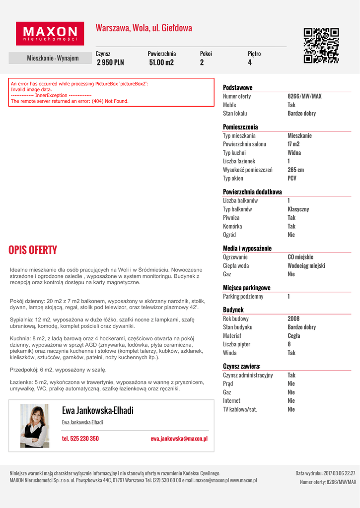 Warszawa, Wola, ul. Giełdowa Mieszkanie - Wynajem Czynsz 2 950 PLN Powierzchnia 51.00 m2 Pokoi Piętro 2 An error has occurred while processing PictureBox 'pictureBox2': Invalid image data. ------------- InnerException ------------The remote server returned an error: (404) Not Found. 4 Podstawowe Numer oferty 8266/MW/MAX Meble Tak Stan lokalu Bardzo dobry Pomieszczenia Typ mieszkania Mieszkanie Powierzchnia salonu 17 m2 Typ kuchni Widna Liczba łazienek 1 Wysokość pomieszczeń 265 cm Typ okien PCV Powierzchnia dodatkowa OPIS OFERTY Liczba balkonów 1 Typ balkonów Klasyczny Piwnica Tak Komórka Tak Ogród Nie Media i wyposażenie Idealne mieszkanie dla osób pracujących na Woli i w Śródmieściu. Nowoczesne strzeżone i ogrodzone osiedle , wyposażone w system monitoringu. Budynek z recepcją oraz kontrolą dostępu na karty magnetyczne. Pokój dzienny: 20 m2 z 7 m2 balkonem, wyposażony w skórzany narożnik, stolik, dywan, lampę stojącą, regał, stolik pod telewizor, oraz telewizor plazmowy 42‘. Sypialnia: 12 m2, wyposażona w duże łóżko, szafki nocne z lampkami, szafę ubraniową, komodę, komplet pościeli oraz dywaniki. Kuchnia: 8 m2, z ladą barową oraz 4 hockerami, częściowo otwarta na pokój dzienny, wyposażona w sprzęt AGD (zmywarka, lodówka, płyta ceramiczna, piekarnik) oraz naczynia kuchenne i stołowe (komplet talerzy, kubków, szklanek, kieliszków, sztućców, garnków, patelni, noży kuchennych itp.). Ogrzewanie CO miejskie Ciepła woda Wodociąg miejski Gaz Nie Miejsca parkingowe Parking podziemny 1 Budynek Rok budowy 2008 Stan budynku Bardzo dobry Materiał Cegła Liczba pięter 8 Winda Tak Czynsz zawiera: Przedpokój: 6 m2, wyposażony w szafę. Łazienka: 5 m2, wykończona w trawertynie, wyposażona w wannę z prysznicem, umywalkę, WC, pralkę automatyczną, szafkę łazienkową oraz ręczniki. Ewa Jankowska-Elhadi Czynsz administracyjny Tak Prąd Nie Gaz Nie Internet Nie TV kablowa/sat. Nie Ewa Jankowska-Elhadi tel. 525 230 350 [email protected] Niniejsze warunki mają charakter wyłącznie informacyjny i nie stanowią oferty w rozumieniu Kodeksu Cywilnego. MAXON Nieruchomości Sp. z o o. ul. Powązkowska 44C, 01-797 Warszawa Tel: (22) 530 60 00 e-mail: [email protected] www.maxon.pl Data wydruku: 2017-03-06 22:27 Numer oferty: 8266/MW/MAX