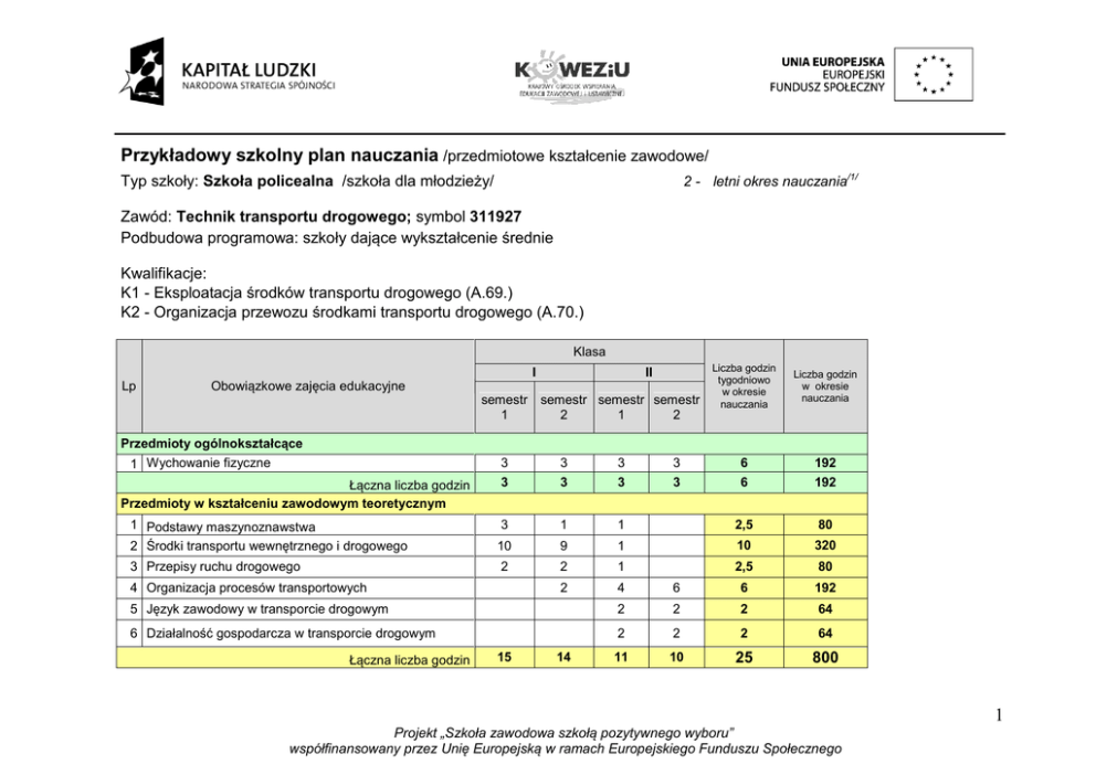 Przykładowy szkolny plan nauczania /przedmiotowe kształcenie zawodowe/ Typ szkoły: Szkoła policealna /szkoła dla młodzieży/ 2 - letni okres nauczania/1/ Zawód: Technik transportu drogowego; symbol 311927 Podbudowa programowa: szkoły dające wykształcenie średnie Kwalifikacje: K1 - Eksploatacja środków transportu drogowego (A.69.) K2 - Organizacja przewozu środkami transportu drogowego (A.70.) Klasa Lp I Obowiązkowe zajęcia edukacyjne semestr 1 Przedmioty ogólnokształcące 1 Wychowanie fizyczne Łączna liczba godzin Przedmioty w kształceniu zawodowym teoretycznym II semestr semestr semestr 2 1 2 3 3 3 3 3 3 3 3 Liczba godzin tygodniowo w okresie nauczania Liczba godzin w okresie nauczania 6 6 192 192 1 Podstawy maszynoznawstwa 2 Środki transportu wewnętrznego i drogowego 3 1 1 2,5 80 10 9 1 10 320 3 Przepisy ruchu drogowego 2 2 1 2,5 80 2 4 6 6 192 5 Język zawodowy w transporcie drogowym 2 2 2 64 6 Działalność gospodarcza w transporcie drogowym 2 2 2 64 11 10 25 800 4 Organizacja procesów transportowych Łączna liczba godzin 15 14 Projekt „Szkoła zawodowa szkołą pozytywnego wyboru” współfinansowany przez Unię Europejską w ramach Europejskiego Funduszu Społecznego 1 Przedmioty w kształceniu zawodowym praktycznym* 1 Eksploatacja środków transportu w przewozach 2 Obsługa pasażerów i ładunków w transporcie drogowym Łączna liczba godzin 10 14 448 15 11 352 14 15 25 800 25 25 25 50 1600 28 28 28 56 1792 9 9 2 5 10 11 Łączna liczba godzin kształcenia zawodowego 25 Tygodniowy wymiar godzin obowiązkowych zajęć edukacyjnych 28 do celów obliczeniowych przyjęto 32 tygodnie w ciągu jednego roku szkolnego *zajęcia odbywają się w pracowniach szkolnych, warsztatach szkolnych, centrach kształcenia praktycznego oraz u pracodawcy Wymiar praktyk zawodowych tyg. godz. /1/ sem I - zgodnie z podstawą programową sem II - zgodnie z podstawą programową sem III - zgodnie z podstawą programową sem IV - zgodnie z podstawą programową Razem 4 160 4 160 Egzamin potwierdzający kwalifikację K1 odbywa się pod koniec 1 semestru klasy drugiej Egzamin potwierdzający kwalifikację K2 odbywa się pod koniec klasy drugiej Projekt „Szkoła zawodowa szkołą pozytywnego wyboru” współfinansowany przez Unię Europejską w ramach Europejskiego Funduszu Społecznego 2 Tabela efektów kształcenia Tabela przyporządkowania poszczególnym przedmiotom efektów kształcenia dla zawodu : X X X X X X X X X X X X X X X X X X X X Liczba godzin przeznaczona na realizację efektów kształcenia X X X X X X X X X X semestr II II semestr I I semestr II Uczeń: klasa semestr I Efekty kształcenia /umiejętności, wiedza oraz kompetencje personalne i społeczne/ Efekty wspólne dla wszystkich zawodów / wspólne dla zawodów w ramach obszaru A / kwalifikacje Nazwa zajęć edukacyjnych Technik transportu drogowego; symbol 311927 Podstawy maszynoznawstwa Kształcenie zawodowe teoretyczne KPS(6) aktualizuje wiedzę i doskonali umiejętności zawodowe; KPS(10) współpracuje w zespole; PKZ(A.ac)(2) odczytuje schematy elektryczne i elektroniczne; PKZ(M.a)(1) przestrzega zasad sporządzania rysunku technicznego maszynowego; PKZ(M.a)(2) sporządza szkice części maszyn; PKZ(M.a)(3) sporządza rysunki techniczne z wykorzystaniem technik komputerowych; PKZ(M.a)(4) rozróżnia części maszyn i urządzeń; PKZ(M.a)(5) rozróżnia rodzaje połączeń; PKZ(M.a)(6) przestrzega zasad tolerancji i pasowań; PKZ(M.a)(7) rozróżnia materiały konstrukcyjne i eksploatacyjne; KPS PKZ(A.ac) PKZ(M.a) Projekt „Szkoła zawodowa szkołą pozytywnego wyboru” współfinansowany przez Unię Europejską w ramach Europejskiego Funduszu Społecznego 35 45 3 Środki transportu wewnętrznego i drogowego PKZ(M.a)(10) rozpoznaje rodzaje korozji oraz określa sposoby ochrony przed korozją; PKZ(M.a)(11) rozróżnia techniki i metody wytwarzania części maszyn i urządzeń; PKZ(M.a)(12) rozróżnia maszyny, urządzenia i narzędzia do obróbki ręcznej i maszynowej; PKZ(M.a)(13) rozróżnia przyrządy pomiarowe stosowane podczas obróbki ręcznej i maszynowej; PKZ(M.a)(16) określa budowę oraz przestrzega zasad działania maszyn i urządzeń; BHP(1) rozróżnia pojęcia związane z bezpieczeństwem i higieną pracy, ochroną przeciwpożarową, ochroną środowiska i ergonomią; BHP(2) rozróżnia zadania i uprawnienia instytucji oraz służb działających w zakresie ochrony pracy i ochrony środowiska w Polsce; BHP(3) określa prawa i obowiązki pracownika oraz pracodawcy w zakresie bezpieczeństwa i higieny pracy; BHP(4) przewiduje zagrożenia dla zdrowia i życia człowieka oraz mienia i środowiska związane z wykonywaniem zadań zawodowych; KPS(1) przestrzega zasad kultury i etyki; KPS(3) przewiduje skutki podejmowanych działań; KPS(4) jest otwarty na zmiany; PKZ(A.ac)(1) stosuje obliczenia do rozwiązywania problemów praktycznych, w tym przelicza jednostki miar fizycznych; PKZ(M.a)(8) rozróżnia środki transportu wewnętrznego; PKZ(M.a)(9) dobiera sposoby transportu i składowania materiałów; A.69.1(1) rozróżnia rodzaje środków transportu drogowego; A.69.1(2) wyjaśnia budowę środków transportu drogowego; A.69.2(1) klasyfikuje środki transportu drogowego; A.69.2(2) dobiera środki transportu drogowego do rodzaju przewożonego towaru; A.69.2(3) określa własności eksploatacyjne środków transportu drogowego; X X X X X X X X X X X X X X X Łączna liczba godzin X X X X X X 15 BHP X X X X X X KPS X X X X X X X X X PKZ(A.ac) X X X X X X X X X X X X X X X X X X A.69 X X X X X X Łączna liczba godzin PKZ(M.a) Projekt „Szkoła zawodowa szkołą pozytywnego wyboru” współfinansowany przez Unię Europejską w ramach Europejskiego Funduszu Społecznego 80 20 15 270 320 4 Przepisy ruchu drogowego Organizacja procesów transportowych BHP(10) udziela pierwszej pomocy poszkodowanym w wypadkach przy pracy oraz w stanach zagrożenia zdrowia i życia. PKZ(A.ac)(3) wykonuje czynności