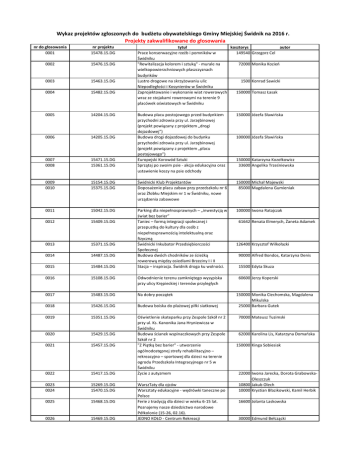 Wykaz projektów zgłoszonych do budżetu obywatelskiego Gminy Miejskiej Świdnik na 2016 r. Projekty zakwalifikowane do głosowania nr do głosowania 0001 nr projektu 15478.15.DG 0002 15476.15.DG 0003 15463.15.DG 0004 15482.15.DG 0005 14204.15.DG 0006 14205.15.DG 0007 0008 15471.15.DG 15361.15.DG 0009 0010 tytuł kosztorys autor Prace konserwacyjne rzeźb i pomników w 149540 Grzegorz Cel Świdniku "Rewitalizacja kolorem i sztuką" - murale na 72000 Monika Kozień wielkopowierzchniowych płaszczyznach budynków Lustro drogowe na skrzyżowaniu ulic 1500 Konrad Sawicki Niepodległości i Kosynierów w Świdniku Zaprojektowanie i wykonanie wiat rowerowych 150000 Tomasz Łasak wraz ze stojakami rowerowymi na terenie 9 placówek oświatowych w Świdniku Budowa placu postojowego przed budynkiem przychodni zdrowia przy ul. Jarzębinowej (projekt powiązany z projektem „drogi dojazdowej”) Budowa drogi dojazdowej do budynku przychodni zdrowia przy ul. Jarzębinowej (projekt powiązany z projektem „placu postojowego”) Europejski Korowód Sztuki Sprzątaj po swoim psie - akcja edukacyjna oraz ustawienie koszy na psie odchody 150000 Józefa Sławińska 15154.15.DG 15375.15.DG Świdnicki Klub Projektantów Doposażenie placu zabaw przy przedszkolu nr 6 oraz Żłobku Miejskim nr 1 w Świdniku, nowe urządzenia zabawowe 150000 Michał Majewski 85000 Magdalena Gumieniak 0011 15042.15.DG 100000 Iwona Ratajczak 0012 15409.15.DG 0013 15371.15.DG 0014 14487.15.DG 0015 15484.15.DG Parking dla niepełnosprawnych – „inwestycją w świat bez barier” Taniec – formą integracji społecznej i przepustką do kultury dla osób z niepełnosprawnością intelektualną oraz fizyczną Świdnicki Inkubator Przedsiębiorczości Społecznej Budowa dwóch chodników ze ścieżką rowerową między osiedlami Brzeziny I i II Stacja – inspiracja. Świdnik droga ku wolności. 0016 15108.15.DG Odwodnienie terenu zamkniętego wysypiska przy ulicy Krępieckiej i terenów przyległych 0017 15483.15.DG Na dobry początek 0018 15426.15.DG Budowa boiska do plażowej piłki siatkowej 0019 15351.15.DG 0020 15429.15.DG 0021 15457.15.DG 0022 15417.15.DG Oświetlenie skateparku przy Zespole Szkół nr 2 przy ul. Ks. Kanonika Jana Hryniewicza w Świdniku Budowa ścianek wspinaczkowych przy Zespole Szkół nr 2 "Z Piątką bez barier" - utworzenie ogólnodostępnej strefy rehabilitacyjno – rekreacyjno – sportowej dla dzieci na terenie ogrodu Przedszkola Integracyjnego nr 5 w Świdniku Życie z autyzmem 0023 0024 15269.15.DG 15470.15.DG 0025 15468.15.DG 0026 15469.15.DG WarszTaty dla ojców Warsztaty edukacyjne - wędrówki taneczne po Polsce Ferie z tradycją dla dzieci w wieku 6-15 lat. Poznajemy nasze dziedzictwo narodowe Półkolonie (15-26, 02.16). JEDNO KOŁO - Centrum Rekreacji 100000 Józefa Sławińska 150000 Katarzyna Kozołkowicz 33600 Angelika Trześniewska 61642 Renata Elmerych, Żaneta Adamek 126400 Krzysztof Wilkołazki 90000 Alfred Bondos, Katarzyna Denis 15500 Edyta Skuza 60600 Jerzy Koperski 150000 Monika Ciechomska, Magdalena Mikulska 25000 Barbara Gutek 70000 Mateusz Tuzimski 62000 Karolina Lis, Katarzyna Domańska 150000 Kinga Sobiesiak 22000 Iwona Jarecka, Dorota GrabowskaOleszczuk 10800 Jakub Olech 10000 Krystian Błazikowski, Kamil Herbik 16600 Jolanta Laskowska 30000 Edmund Bełczącki 0027 15363.15.DG Utwardzenie nawierzchni drogi poprzez wysypanie kory asfaltowej przy ul. Kruczkowskiego Modernizacja skwerku przy ul. Okulickiego obok targu 0028 15353.15.DG 0029 15477.15.DG Modernizacja chodników dla pieszych oraz parkingów z wykonaniem dodatkowych miejsc postojowych przy dojazdowej ulicy Kosynierów 137390 Janusz Królik 0030 15381.15.DG Stojaki na rowery 0031 15380.15.DG Ławeczki dla seniorów 0032 15270.15.DG 0033 15282.15.DG Budowa miasteczka ruchu drogowego ze strefą gier Oświetlenie północnego odcinka ul. Brzegowej 3000 Anna Bugalska-Turek, Danuta Kobylańska, Aleksander Suski 16900 Anna Bugalska-Turek, Helena Czerwonogrodzka, Aleksander Suski 149350 Karolina Fijałkowska 0034 15350.15.DG 0035 15421.15.DG 0036 15354.15.DG 0037 0038 15362.15.DG 15405.15.DG 0039 15420.15.DG Zaplecze higieniczno-rekreacyjne dla psów na terenie Gminy Miejskiej Świdnik 0040 ILOŚĆ : 15155.15.DG 40 Przystanki autobusowe ŁĄCZNA KWOTA Ogólna koncepcja zabezpieczenia miasta Świdnik na obszarze zlewni Stawek-Stoki przy występowaniu maksymalnych opadów miarodajnych Nowoczesny plac zabaw z infrastrukturą sportową na osiedlu Wschód Rewitalizacja skweru przy ul. Niepodległości 2, Norwida3, ul. Reja 6 - OAZA CISZY „RÓŻANY OGRÓD" Sterylizacja psów i kotów Wybieg dla psów 30000 Piotr Małek 112500 Elżbieta Kusak, Katarzyna Sienkiewicz, Regina Brzozowska 150000 Andrzej Nieznaj 70000 Jerzy Koperski 148277 Maciej Kantor 95000 Barbara Duda, Piotr Gajewski, Krzysztof Kruczek, Zenon Dec 37000 Angelika Trześniewska 148000 Marta Kubiak, Mateusz Gładysz 107106 Edyta Lipniowiecka 149850 Tadeusz Chwałczyk 3396555 PLN