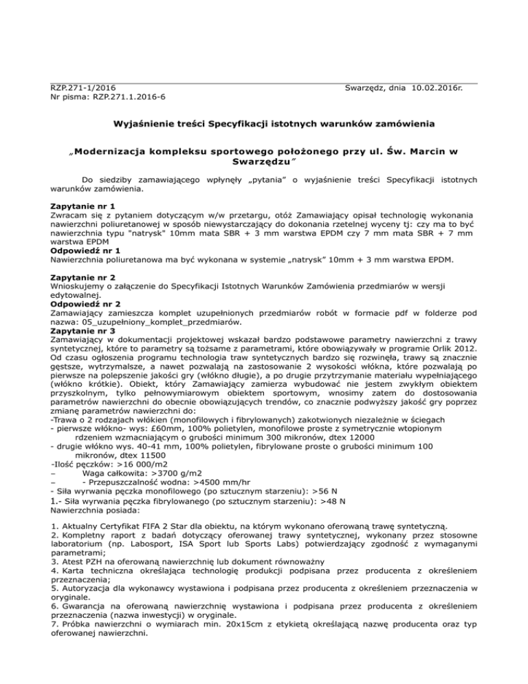 RZP.271-1/2016 Nr pisma: RZP.271.1.2016-6 Swarzędz, dnia 10.02.2016r. Wyjaśnienie treści Specyfikacji istotnych warunków zamówienia „Modernizacja kompleksu sportowego położonego przy ul. Św. Marcin w Swarzędzu” Do siedziby zamawiającego wpłynęły „pytania” o wyjaśnienie treści Specyfikacji istotnych warunków zamówienia. Zapytanie nr 1 Zwracam się z pytaniem dotyczącym w/w przetargu, otóż Zamawiający opisał technologię wykonania nawierzchni poliuretanowej w sposób niewystarczający do dokonania rzetelnej wyceny tj: czy ma to być nawierzchnia typu "natrysk" 10mm mata SBR + 3 mm warstwa EPDM czy 7 mm mata SBR + 7 mm warstwa EPDM Odpowiedź nr 1 Nawierzchnia poliuretanowa ma być wykonana w systemie „natrysk” 10mm + 3 mm warstwa EPDM. Zapytanie nr 2 Wnioskujemy o załączenie do Specyfikacji Istotnych Warunków Zamówienia przedmiarów w wersji edytowalnej. Odpowiedź nr 2 Zamawiający zamieszcza komplet uzupełnionych przedmiarów robót w formacie pdf w folderze pod nazwa: 05_uzupełniony_komplet_przedmiarów. Zapytanie nr 3 Zamawiający w dokumentacji projektowej wskazał bardzo podstawowe parametry nawierzchni z trawy syntetycznej, które to parametry są tożsame z parametrami, które obowiązywały w programie Orlik 2012. Od czasu ogłoszenia programu technologia traw syntetycznych bardzo się rozwinęła, trawy są znacznie gęstsze, wytrzymalsze, a nawet pozwalają na zastosowanie 2 wysokości włókna, które pozwalają po pierwsze na polepszenie jakości gry (włókno długie), a po drugie przytrzymanie materiału wypełniającego (włókno krótkie). Obiekt, który Zamawiający zamierza wybudować nie jestem zwykłym obiektem przyszkolnym, tylko pełnowymiarowym obiektem sportowym, wnosimy zatem do dostosowania parametrów nawierzchni do obecnie obowiązujących trendów, co znacznie podwyższy jakość gry poprzez zmianę parametrów nawierzchni do: -Trawa o 2 rodzajach włókien (monofilowych i fibrylowanych) zakotwionych niezależnie w ściegach - pierwsze włókno- wys: £60mm, 100% polietylen, monofilowe proste z symetrycznie wtopionym rdzeniem wzmacniającym o grubości minimum 300 mikronów, dtex 12000 - drugie włókno wys. 40-41 mm, 100% polietylen, fibrylowane proste o grubości minimum 100 mikronów, dtex 11500 -Ilość pęczków: >16 000/m2 – Waga całkowita: >3700 g/m2 – - Przepuszczalność wodna: >4500 mm/hr - Siła wyrwania pęczka monofilowego (po sztucznym starzeniu): >56 N 1.- Siła wyrwania pęczka fibrylowanego (po sztucznym starzeniu): >48 N Nawierzchnia posiada: 1. Aktualny Certyfikat FIFA 2 Star dla obiektu, na którym wykonano oferowaną trawę syntetyczną. 2. Kompletny raport z badań dotyczący oferowanej trawy syntetycznej, wykonany przez stosowne laboratorium (np. Labosport, ISA Sport lub Sports Labs) potwierdzający zgodność z wymaganymi parametrami; 3. Atest PZH na oferowaną nawierzchnię lub dokument równoważny 4. Karta techniczna określająca technologię produkcji podpisana przez producenta z określeniem przeznaczenia; 5. Autoryzacja dla wykonawcy wystawiona i podpisana przez producenta z określeniem przeznaczenia w oryginale. 6. Gwarancja na oferowaną nawierzchnię wystawiona i podpisana przez producenta z określeniem przeznaczenia (nazwa inwestycji) w oryginale. 7. Próbka nawierzchni o wymiarach min. 20x15cm z etykietą określającą nazwę producenta oraz typ oferowanej nawierzchni. Odpowiedź nr 3 Zamawiający zmienia parametry sztucznej nawierzchni boiska treningowego: Parametry trawy (kolor zielony): • wysokość włókna 40mm • typ włókna: monofil • rodzaj włókna: 100% polietylen • Dtex: min 13000 dtex • grubość każdego włókna: min 400 mikronów • ilość włókien: min. 102000/m2 • waga całkowita: min 2000g/m2 • kształt włókien: diament lub X • wytrzymałość łączenia klejonego między brytami po starzeniu wodą min 62N/100mm • siła potrzeba do wyrwania pęczka trawy po starzeniu wodą min. 64N • wypełnienie: piasek kwarcowy i granulat SBR w ilości zgodnej z badaniem laboratoryjnym • pod trawą należy zamontować matę prefabrykowaną o grubości 20mm Parametry maty: • grubość maty: 20mm • typ: mata prefabrykowana, jednostronnie pokryta geowłókniną • tłumienie siły min. 50% • odkształcenie pionowe max 6,3mm • zwrot energii min 40% Zapytanie nr 4 Zamawiający bardzo nieprecyzyjnie opisuje nawierzchnię poliuretanową na bieżnię. Według rys. PB_AR_01 przedstawiający przekrój przez bieżnię nawierzchnia powinna być grubości 20mm. W opisie natomiast jest zapis że „na wierzchnią warstwę bieżni zastosowano nieprzepuszczalną warstwę granulatu EPDM, zespojonego lepiszczem poliuretanowym, ułożonym na wcześniej przygotowanym podłożu gumowym o grubości 10mm”. Analizując powyższe zapisy prawdopodobnie Zamawiający miał nawierzchnię typu „sandwich”, jednakże tego typu nawierzchnie są o grubości 13-14 mm, a wymagane parametry nawierzchni są znacznie odbiegające od standardowo przyjętych. W związku z powyższym czy Zamawiający zweryfikuje zapisy w zakresie nawierzchni poliuretanowej na: Nawierzchnia sportowa bez-spoinowa, poliuretanowo-gumowa, o grubości min 13 mm, nieprzepuszczalna dla wody, do użytkowania w butach z kolcami, wykonywana bezpośrednio na placu budowy Składa się z dwu warstw: - elastycznego podkładu - mieszanka z granulatu gumowego o granulacji 1-4mm, zmieszanego z lepiszczem poliuretanowym Po wykonaniu warstwy z granulatu gumowego należy ja zaszpachlować przy pomocy ręcznych pac stalowych. Grubość maty z granulatu gumowego powinna wynosić ok. 10mm - warstwy użytkowej - wylewka poliuretanowa z granulatem EPDM, o granulacji 1-4 mm, który pod wpływem swojego ciężaru zatapia się. Po utwardzeniu systemu, nadmiar granulatu należy zebrać Grubość warstwy 3-4 mm. Parametry nawierzchni: 1.Wytrzymałość na rozdzieranie (N) 110 - 119,5 2.Współczynnik tarcia kinetycznego: 