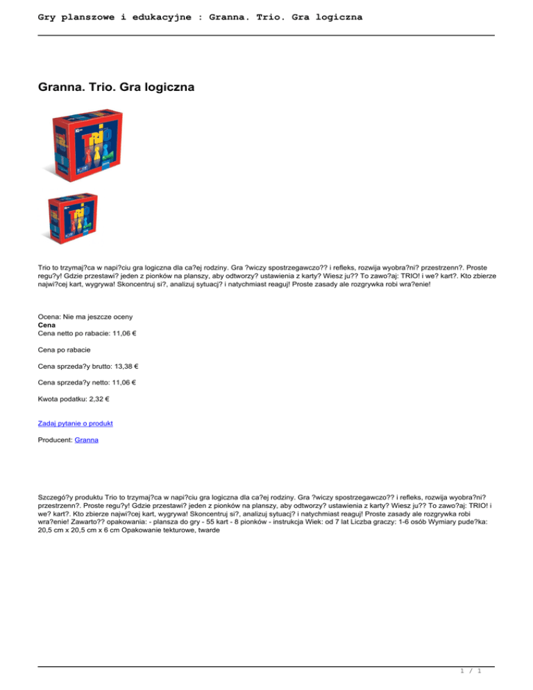 Gry planszowe i edukacyjne : Granna. Trio. Gra logiczna Granna. Trio. Gra logiczna Trio to trzymaj?ca w napi?ciu gra logiczna dla ca?ej rodziny. Gra ?wiczy spostrzegawczo?? i refleks, rozwija wyobra?ni? przestrzenn?. Proste regu?y! Gdzie przestawi? jeden z pionków na planszy, aby odtworzy? ustawienia z karty? Wiesz ju?? To zawo?aj: TRIO! i we? kart?. Kto zbierze najwi?cej kart, wygrywa! Skoncentruj si?, analizuj sytuacj? i natychmiast reaguj! Proste zasady ale rozgrywka robi wra?enie! Ocena: Nie ma jeszcze oceny Cena Cena netto po rabacie: 11,06 € Cena po rabacie Cena sprzeda?y brutto: 13,38 € Cena sprzeda?y netto: 11,06 € Kwota podatku: 2,32 € Zadaj pytanie o produkt Producent: Granna Szczegó?y produktu Trio to trzymaj?ca w napi?ciu gra logiczna dla ca?ej rodziny. Gra ?wiczy spostrzegawczo?? i refleks, rozwija wyobra?ni? przestrzenn?. Proste regu?y! Gdzie przestawi? jeden z pionków na planszy, aby odtworzy? ustawienia z karty? Wiesz ju?? To zawo?aj: TRIO! i we? kart?. Kto zbierze najwi?cej kart, wygrywa! Skoncentruj si?, analizuj sytuacj? i natychmiast reaguj! Proste zasady ale rozgrywka robi wra?enie! Zawarto?? opakowania: - plansza do gry - 55 kart - 8 pionków - instrukcja Wiek: od 7 lat Liczba graczy: 1-6 osób Wymiary pude?ka: 20,5 cm x 20,5 cm x 6 cm Opakowanie tekturowe, twarde 1 / 1 Powered by TCPDF (www.tcpdf.org)