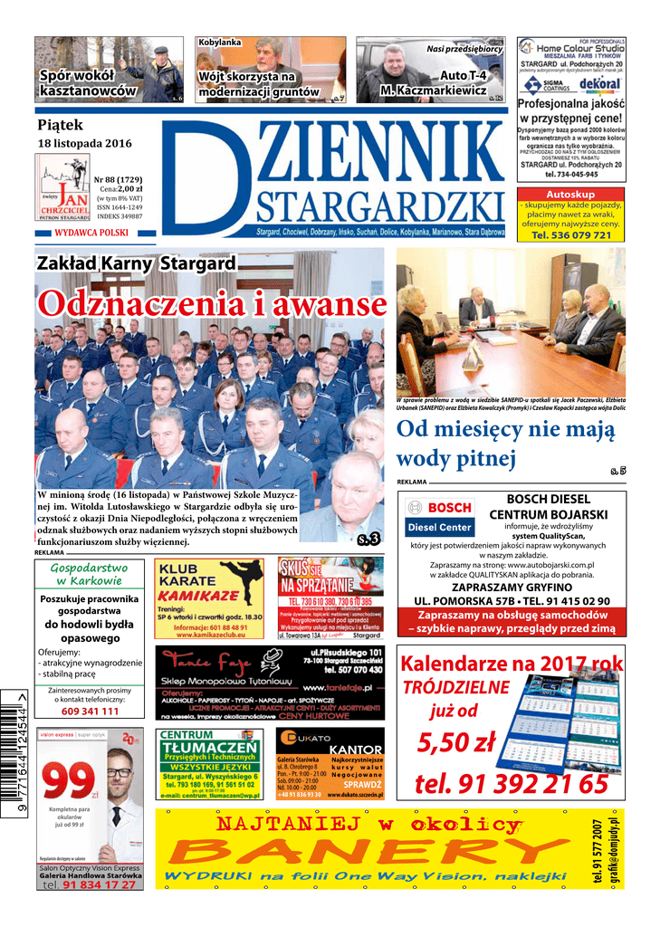 Kobylanka Spór wokół kasztanowców s. 6 Nasi przedsiębiorcy Wójt skorzysta na modernizacji gruntów Auto T-4 M. Kaczmarkiewicz s. 12 s. 7 Piątek 18 listopada 2016 Nr 88 (1729) Cena:2,00 zł Autoskup (w tym 8% VAT) ISSN 1644-1249 INDEKS 349887 - skupujemy każde pojazdy, płacimy nawet za wraki, oferujemy najwyższe ceny. WYDAWCA POLSKI Tel. 536 079 721 Zakład Karny Stargard Odznaczenia i awanse W sprawie problemu z wodą w siedzibie SANEPID-u spotkali się Jacek Paczewski, Elżbieta Urbanek (SANEPID) oraz Elżbieta Kowalczyk (Promyk) i Czesław Kopacki zastępca wójta Dolic Od miesięcy nie mają wody pitnej s. 5 reklama W minioną środę (16 listopada) w Państwowej Szkole Muzycznej im. Witolda Lutosławskiego w Stargardzie odbyła się uroczystość z okazji Dnia Niepodległości, połączona z wręczeniem odznak służbowych oraz nadaniem wyższych stopni służbowych funkcjonariuszom służby więziennej. s. 3 Gospodarstwo w Karkowie ZAPRASZAMY GRYFINO UL. POMORSKA 57B • TEL. 91 415 02 90 Zapraszamy na obsługę samochodów – szybkie naprawy, przeglądy przed zimą ul. Pomorska 57b 74-100 Gryfino tel. +48 91 415 02 90 tel. +48 91 415 12 48 [email protected] www.autobojarski.com.pl Poszukuje pracownika gospodarstwa do hodowli bydła opasowego Oferujemy: - atrakcyjne wynagrodzenie - stabilną pracę Kalendarze na 2017 rok TRÓJDZIELNE już od Zainteresowanych prosimy o kontakt telefoniczny: 609 341 111 Galeria Starówka Najkorzystniejsze ul. B. Chrobrego 8 kursy walut Pon. - Pt. 9:00 - 21:00 N e g o c j o w a n e Sob. 09:00 - 21:00 SPRAWDŹ Nd. 10.00 - 20.00 +48 91 836 93 30 www.dukato.szczecin.pl Kompletna para okularów już od 99 zł Regulamin dostępny w salonie informuje, że wdrożyliśmy system QualityScan, Bosch Diesel który jestCentrum potwierdzeniem jakości napraw wykonywanych Bojarski w naszym zakładzie. Zapraszamy na stronę: www.autobojarski.com.pl w zakładce QUALITYSKAN aplikacja do pobrania. mgr inż. Tadeusz Bojarski 5,50 zł tel. 91 392 21 65 NAJTANIEJ w okolicy BANERY WYDRUKI na folii One Way Vision, naklejki tel. 91 577 2007 [email protected] reklama BOSCH DIESEL CENTRUM BOJARSKI 2 Nr 88 (1729) Puls Miasta Nasza Sonda W ostatnim czasie rozpoczęły się ekshumacje ofiar katastrofy smoleńskiej. Decyzja o ich przeprowadzeniu budzi spore kontrowersje, biorąc pod uwagę zarówno ich celowość jak i jednoznaczny sprzeciw części rodzin osób, które zginęły 10 kwietnia 2010 r. W dzisiejszej sondzie pytamy mieszkańców, co sądzą na ten temat. Wiesław Kot Uważam, że ekshumacje to totalny błąd. Niech zostawią tych ludzi w spokoju. Jeżeli zostali już pochowani, to należy im się spoczynek. Nie można zakłócać ich spokoju, tym bardziej, że jest to wielka tragedia dla ich rodzin. Niby temat nie jest jeszcze skończony, ale ekshumacje tym bardziej nie mają sensu, bo nie wrócą życia tym, którzy zginęli. Marta Myślę, że te ekshumacje to jakiś żart i paranoja. Po pierwsze ofiarom należy się szacunek, a po drugie nie było żadnego zamachu. 122 We wtorek (15 listopada) przy ul. Wyszyńskiego, nieopodal kręgielni Rondo, został zdjęty fragment kostki brukowej chodnika i dokonywano drobnych napraw przy studzience. Zarządcą pasa drogowego w tym miejscu jest Zarząd Dróg Powiatowych. Remont został zakończony jeszcze tego samego dnia, a studzienkę zabezpieczono znakiem. Ryszard Wiśniewski Nie powinni ruszać zmarłych, skoro już zostali pochowani. Moim zdaniem nie można tego robić. Jest to przykre doświadczenie dla rodzin, bliskich i znajomych. Jadwiga Dykta-Bugaj Przeżyłam tę tragedię, choć nie zginęła tam moja rodzina. Moim zdaniem ekshumacje nie są dobrym pomysłem. Nie chciałabym, żeby ktoś wydobywał z grobu ciało mojego męża. Nie ruszałabym zmarłych, nawet tych, którzy od dawna leżą na obczyźnie. Człowiek po śmierci powinien mieć spokój. 121 W środę (16 listopada) jeden z mieszkańców poinformował redakcję Dziennika Stargardzkiego o nieuprzątniętej stercie liści na alejkach w parku 3 Maja. Liście zaczęły już gnić, przez co na ścieżkach zrobiło się ślisko. Zgłosiliśmy tę sprawę do Zarządu Usług Komunalnych, który jest odpowiedzialny za utrzymanie zieleni w mieści. Następnego dnia, alejki zostały już oczyszczone z zalegających liści. 123 W Parku Zamkowym powstały nowe alejki oraz zainwestowano również w latarnie. Miasto na 170 metrów ścieżki dla pieszych wydało około 105 tys. zł, natomiast na 11 latarń LED około 69 tys. zł. Latarnie stanęły na całej długości nowo powstałej alejki, która ma 3 metry szerokości i prowadzi wzdłuż Iny od cerkwi greckokatolickiej do mostu przy ul. Chrobrego. Ścieżka została podzielona na dwa pasy – rowerowy, który powstał z kostki betonowej oraz spacerowy, wykonany z nawierzchni mineralnej. Władze miasta zapowiadają, że w Parku Zamkowym planowane są kolejne inwestycje, jeśli pogoda będzie sprzyjała - być może jeszcze w tym roku. KR Za włamanie pod dozór Policji Roger Gwardecki Moim zdaniem jest to zupełnie niepotrzebne. Z powodu ekshumacji ucierpią tylko rodziny ofiar katastrofy, a nic więcej z nich nie wyniknie. (ps) Kryminalni z Komendy Powiatowej Policji w Stargardzie zatrzymali 32-latka, który włamał się do jednego z mieszkań na ul. Płatnerzy. Podejrzany, który usłyszał zarzut w warunkach recydywy trafił pod dozór Policji. W październiku do jednego z mieszkań przy ulicy Płatnerzy w Stargardzie na tzw. pasówkę włamał się nieznany sprawca, który „wyczyścił” wszystko, co cenne i możliwe, dlatego od chwili zawiadomienia sprawą intensywnie zajmowali się stargardzcy śledczy oraz kryminalni. Efektem wielu analiz i drobiazgowych ustaleń było wytypowanie za ten czyn 32-latka, który już wcześniej skazany był za podobne czyny. Realizacja sprawy w tym tygodniu skutkowała zatrzymaniem podejrzewanego na terenie miasta, a przeprowadzone przez policjantów prze- szukania 