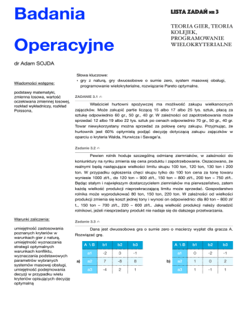 Badania Lista zadań nr 3 TEORIA GIER, TEORIA KOLEJEK, PROGRAMOWANIE WIELOKRYTERIALNE Operacyjne dr Adam SOJDA Wiadomości wstępne: podstawy matematyki, zmienna losowa, wartość oczekiwana zmiennej losowej, rozkład wykładniczy, rozkład Poissona, Słowa kluczowe: • gry z naturą, gry dwuosobowe o sumie zero, system masowej obsługi, programowanie wielokryterialne, rozwiązanie Pareto optymalne. ZADANIE 3.1 ✍ Właściciel hurtowni spożywczej ma możliwość zakupu wielkanocnych zajączków. Może zakupić partie liczącą 15 albo 17 albo 25 tys. sztuk, płacą za sztukę odpowiednio 60 gr., 50 gr., 40 gr. W zależności od zapotrzebowania może sprzedać 12 albo 19 albo 22 tys. sztuk po cenach odpowiednio 70 gr., 50 gr., 40 gr. Towar niewykorzystany można sprzedać za połowę ceny zakupu. Przyjmując, że hurtownik jest 60% optymistą podjąć decyzję dotyczącą zakupu zajączków w oparciu o kryteria Walda, Hurwicza i Savage’a. Zadanie 3.2 ✍ Pewien rolnik hoduje szczególną odmianę ziemniaków, w zależności do koniunktury na rynku zmienia się cena produktu i zapotrzebowanie. Oszacowano, że realnymi będą następujące wielkości limitu skupu 100 ton, 120 ton, 130 ton i 200 ton. W przypadku ogłoszenia chęci skupu tylko do 100 ton cena za tonę towaru wyniesie 1000 zł/t., do 120 ton – 900 zł/t., 150 ton – 800 zł/t., 200 ton – 750 zł/t.. Będąc stałym i największym dostarczycielem ziemniaków ma pierwszeństwo, zatem każdą wielkość produkcji nieprzekraczającą limitu może sprzedać. Gospodarstwo rolnika może wyprodukować 80 ton, 150 ton, 220 ton. W zależności od wielkości produkcji zmienia się koszt jednej tony i wynosi on odpowiednio: dla 80 ton – 800 zł/ t., 150 ton – 700 zł/t., 220 – 600 zł/t.. Jaką wielkość produkcji należy doradzić rolnikowi, jeżeli niesprzedany produkt nie nadaje się do dalszego przetwarzania. Warunki zaliczenia: umiejętność zastosowania poznanych kryteriów w warunkach gier z naturą, umiejętność wyznaczania strategii optymalnych warunkach konfliktu, wyznaczania podstawowych parametrów wybranych systemów masowej obsługi, umiejętność podejmowania decyzji w przypadku wielu kryteriów opisujących decyzję optymalną Zadanie 3.3 ✍ Dana jest dwuosobowa gra o sumie zero o macierzy wypłat dla gracza A. Rozwiązać grę. A \B b1 b2 b3 A \B b1 b2 b3 a) a1 -2 3 -1 a2 7 -8 8 a3 -4 2 1 b) a1 0 -2 -1 a2 1 0 2 a3 1 -1 1 c) A \B b1 b2 b3 A \B b1 b2 b3 a1 -2 3 -1 a1 -2 3 -4 a2 7 -8 7 a2 7 -8 2 a3 -4 5 3 a3 -4 2 -5 d) Zadanie 3.4. ✍ W sklepie jest zainstalowana jedna kasa. Przeciętna stopa przybyć klientów λ = 4 przy przeciętnej stopie obsługi równej µ = 7 w ciągu pół godziny. Dokonać diagnozy systemu obsługi. Zadanie 3.5. ✍ W pewnej sieci sprzedaży jest jedno okienko obsługujące klientów podjeżdżających samochodami. Przed okienkiem znajdują się 3 miejsca i jeśli wszystkie są zajęte, to klient odjeżdża do konkurencji. Obliczyć średni czas oczekiwana na obsługę, jeśli liczba chętnych do skorzystania z tej sieci wyraża się intensywnością 15 samochodów na godzinę, średnio w czasie godziny jest obsługiwanych 10 samochodów. Zadanie 3.6. ✍ 💻 Dane jest zagadnienie programowania wielokryteriowego, przy czym kryterium pierwsze jest dwa razy ważniejsze niż drugie. Wyznaczyć rozwiązanie optymalne. f1 ( x1 , x2 ) = 4x1 + 5x2 → max f1 ( x1 , x2 , x3 ) = 4x1 + 5x2 + 2x3 → max f1 ( x1 , x2 ) = 8x1 + 1x2 → max a) ✍ ⎧ 3x1 + 7x2 ≤ 210 ⎨ ⎩8x1 + 4x2 ≤ 320 x1 , x2 ≥ 0 f1 ( x1 , x2 , x3 ) = 8x1 + 1x2 + 7x3 → max b) 💻 ⎧ 3x1 + 7x2 + 3x3 ≤ 210 ⎨ ⎩8x1 + 4x2 + 2x3 ≤ 320 x1 , x2 , x3 ≥ 0 Zadanie 3.7. ✍ W tabeli podano zyski (mln zł) i udziały w rynku (%) jaki pewna firma spodziewa się osiągnąć stosując wybrane strategie marketingowe. Wyznaczyć strategie Paretooptymalne. Podać przykład strategii G, która też będzie Pareto-optymalna w zbiorze strategii A-G oraz optymalnej strategii J w zbiorze strategii A-J Strategie marketingowe Kryteria A B C D E F Zysk f1 4 3 4 3 3,5 3 Udział w rynku f2 30 30 40 30 50 50 Badania Operacyjne dr Adam SOJDA LISTA III Strona 2 z 2
