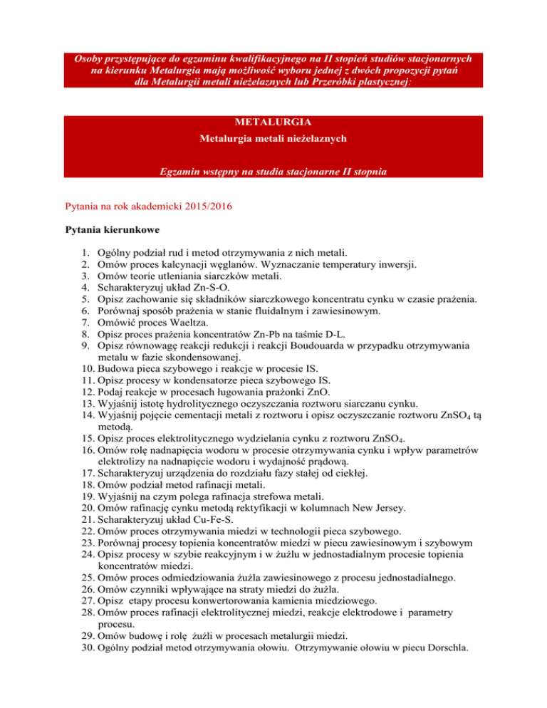 Osoby przystępujące do egzaminu kwalifikacyjnego na II stopień studiów stacjonarnych na kierunku Metalurgia mają możliwość wyboru jednej z dwóch propozycji pytań dla Metalurgii metali nieżelaznych lub Przeróbki plastycznej: METALURGIA Metalurgia metali nieżelaznych Egzamin wstępny na studia stacjonarne II stopnia Pytania na rok akademicki 2015/2016 Pytania kierunkowe Ogólny podział rud i metod otrzymywania z nich metali. Omów proces kalcynacji węglanów. Wyznaczanie temperatury inwersji. Omów teorie utleniania siarczków metali. Scharakteryzuj układ Zn-S-O. Opisz zachowanie się składników siarczkowego koncentratu cynku w czasie prażenia. Porównaj sposób prażenia w stanie fluidalnym i zawiesinowym. Omówić proces Waeltza. Opisz proces prażenia koncentratów Zn-Pb na taśmie D-L. Opisz równowagę reakcji redukcji i reakcji Boudouarda w przypadku otrzymywania metalu w fazie skondensowanej. 10. Budowa pieca szybowego i reakcje w procesie IS. 11. Opisz procesy w kondensatorze pieca szybowego IS. 12. Podaj reakcje w procesach ługowania prażonki ZnO. 13. Wyjaśnij istotę hydrolitycznego oczyszczania roztworu siarczanu cynku. 14. Wyjaśnij pojęcie cementacji metali z roztworu i opisz oczyszczanie roztworu ZnSO4 tą metodą. 15. Opisz proces elektrolitycznego wydzielania cynku z roztworu ZnSO4. 16. Omów rolę nadnapięcia wodoru w procesie otrzymywania cynku i wpływ parametrów elektrolizy na nadnapięcie wodoru i wydajność prądową. 17. Scharakteryzuj urządzenia do rozdziału fazy stałej od ciekłej. 18. Omów podział metod rafinacji metali. 19. Wyjaśnij na czym polega rafinacja strefowa metali. 20. Omów rafinację cynku metodą rektyfikacji w kolumnach New Jersey. 21. Scharakteryzuj układ Cu-Fe-S. 22. Omów proces otrzymywania miedzi w technologii pieca szybowego. 23. Porównaj procesy topienia koncentratów miedzi w piecu zawiesinowym i szybowym 24. Opisz procesy w szybie reakcyjnym i w żużlu w jednostadialnym procesie topienia koncentratów miedzi. 25. Omów proces odmiedziowania żużla zawiesinowego z procesu jednostadialnego. 26. Omów czynniki wpływające na straty miedzi do żużla. 27. Opisz etapy procesu konwertorowania kamienia miedziowego. 28. Omów proces rafinacji elektrolitycznej miedzi, reakcje elektrodowe i parametry procesu. 29. Omów budowę i rolę żużli w procesach metalurgii miedzi. 30. Ogólny podział metod otrzymywania ołowiu. Otrzymywanie ołowiu w piecu Dorschla. 1. 2. 3. 4. 5. 6. 7. 8. 9. 31. Wymień etapy rafinacji ołowiu surowego. Omów odmiedziowanie i rafinację metodą Harrisa. 32. Recykling ołowiu z akumulatorów. 33. Odzysk srebra ze szlamu anodowego i piany srebronośnej. 34. Otrzymywanie tlenku glinowego metodą Bayera w układzie Na2O-Al2O3-H2O. 35. Otrzymywanie aluminium metodą elektrolizy soli stopionych 36. Wpływ liczby kriolitowej na temperaturę topnienia elektrolitu i rozpuszczalność tlenku glinowego. 37. Wpływ zawartości tlenku glinowego na napięcie elektrolizera do otrzymywania aluminium. 38. Wpływ napięcia elektrolizera oraz wydajności prądowej na zużycie energii elektrycznej w procesie elektrolizy tlenku glinowego. 39. Recykling aluminium z puszek po napojach. 40. Podstawy termodynamiczne otrzymywania magnezu metodą silikotermiczną. 41. Omów pierwszą i drugą zasadę termodynamiki. 42. Wyjaśnij różnicę między potencjałem termodynamicznym Gibbsa, a potencjałem chemicznym (μ). 43. Wyprowadź i omów równanie Clausiusa-Clapeyrona. 44. Omów pojęcia izotermy i izobary Van’t Hoffa. 45. Wyjaśnij regułę faz Gibbsa. 46. Równanie Gibbsa-Duhema i jego zastosowanie. 47. Przedstaw prawo Raoulta i prawo Henry’ego oraz omów standardy aktywności. 48. Podaj termodynamiczny warunek równowagi reakcji chemicznej. Na przykładzie reakcji Boudouarda określ wpływ ciśnienia i temperatury na równowagę tej reakcji. 49. Omów zachowanie elektrody w warunkach równowagi i w warunkach polaryzacji. 50. Na przykładzie prostego układu eutektycznego omów metodę jego obliczenia. Pytania uzupełniające 1. Rodzaje oddziaływań podstawowych i wiązań międzyatomowych oraz ich konsekwencje dla ciała stałego – sprężystość kryształów. 2. Struktura i sieć krystaliczna – opis matematyczny elementów i zespołów elementów sieci. 3. Defekty struktury krystalicznej – podział, opis i właściwości. 4. Dyfuzja i samodyfuzja w ciele stałym – istota, opis i zależności od parametrów termodynamicznych. 5. Krystalizacja – mechanizmy, zależności od szybkości zmian temperatury. Tworzenie mono- i polikryształów. 6. Stopy metali – definicje i określenia elementów oraz pojęcia i rodzaje faz w stopach z uwzględnieniem układów równowagi faz. 7. Umocnienie metali i stopów i ich związek z procesami strukturalnymi w ciele stałym. 8. Strukturalne skutki deformacji plastycznej – mechanizmy deformacji plastycznej. 9. Podział i zasady obróbek cieplnych uplastyczniających w metalach i stopach. 10. Ulepszanie cieplne i utwardzanie wydzieleniowe w metalach i stopach. 11. Definicja naprężenia i stanu naprężenia, aksjator i dewiator stanu naprężenia, przykłady. 12. Kryterium plastyczności Tresci, kryterium Hubera-Misesa. Interpretacja geometryczna. 13. Krzywa umocnienia. Konstrukcja krzywej umocnienia. Praca czystego odkształcenia plastycznego. 14. Prędkość odkształcenia i jej rola w procesach przeróbki plastycznej metali. 15. Modele tarcia w procesach przeróbki plastycznej. Współczynnik tarcia. Czynnik tarcia. 16. Nacisk jednostkowy i jego rozkład na długości łuku styku pod wpływem warunków realizacji procesu walcowania. 17. Metody wytwarzania rur z metali nieżelaznych 18. Procesy kształtowania blach – otrzymywania wyrobów o powierzchni nierozwijalnej (wymienić, narysować schematy, krótko scharakteryzować). 19. Wyroby kute i metody ich otrzymywania. 20. Przebiegi sił w procesach wyciskania współbieżnego i przeciwbieżnego. Dyplomant