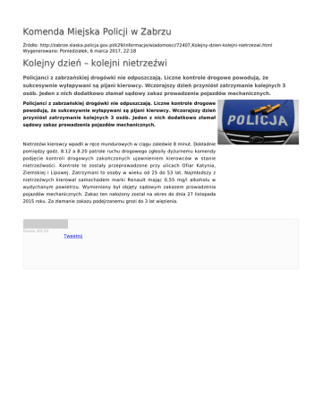 Komenda Miejska Policji w Zabrzu Źródło: http://zabrze.slaska.policja.gov.pl/k29/informacje/wiadomosci/72407,Kolejny-dzien-kolejni-nietrzezwi.html Wygenerowano: Poniedziałek, 6 marca 2017, 22:18 Kolejny dzień – kolejni nietrzeźwi Policjanci z zabrzańskiej drogówki nie odpuszczają. Liczne kontrole drogowe powodują, że sukcesywnie wyłapywani są pijani kierowcy. Wczorajszy dzień przyniósł zatrzymanie kolejnych 3 osób. Jeden z nich dodatkowo złamał sądowy zakaz prowadzenia pojazdów mechanicznych. Policjanci z zabrzańskiej drogówki nie odpuszczają. Liczne kontrole drogowe powodują, że sukcesywnie wyłapywani są pijani kierowcy. Wczorajszy dzień przyniósł zatrzymanie kolejnych 3 osób. Jeden z nich dodatkowo złamał sądowy zakaz prowadzenia pojazdów mechanicznych. Nietrzeźwi kierowcy wpadli w ręce mundurowych w ciągu zaledwie 8 minut. Dokładnie pomiędzy godz. 8.12 a 8.20 patrole ruchu drogowego zgłosiły dyżurnemu komendy podjęcie kontroli drogowych zakończonych ujawnieniem kierowców w stanie nietrzeźwości. Kontrole te zostały przeprowadzone przy ulicach Ofiar Katynia, Ziemskiej i Lipowej. Zatrzymani to osoby w wieku od 25 do 53 lat. Najmłodszy z nietrzeźwych kierował samochodem marki Renault mając 0,55 mg/l alkoholu w wydychanym powietrzu. Wymieniony był objęty sądowym zakazem prowadzenia pojazdów mechanicznych. Zakaz ten nałożony został na okres do dnia 27 listopada 2015 roku. Za złamanie zakazu podejrzanemu grozi do 3 lat więzienia. Ocena: 0/5 (0) Tweetnij