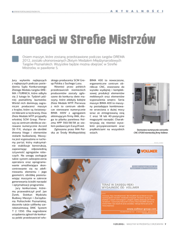 a www.portalmaszynowy.pl k t u a l n o ś c i Laureaci w Strefie Mistrzów Osiem maszyn, które zostaną przedstawione podczas targów DREMA 2012, zostało uhonorowanych Złotym Medalem Międzynarodowych Targów Poznańskich. Wszystkie będzie można obejrzeć w Strefie Mistrzów, w pawilonie 5. Jury wyłoniło najlepszych z najlepszych podczas posiedzenia Sądu Konkursowego Złotego Medalu targów DREMA i FURNICA, które odbyło się 2 lutego br. Tydzień później poznaliśmy laureatów. Wśród nich dominują zagraniczni producenci maszyn z krajów, które są światowymi liderami w tej branży. Dwa Złote Medale MTP przypadły włoskiej SCM Group. Pierwszy za centrum obróbcze sterowane numerycznie Accord 30 F/X, służące do obróbki drewna litego i elementów stolarki budowlanej. Maszyna jest wyposażona w ruchomy portal, który maksymalnie stabilizuje konstrukcję, zapewniając odpowiednią sztywność agregatów roboczych. Na uwagę zasługuje także system zabezpieczenia operatora oraz oprogramowanie umożliwiające skoncentrowanie się na zdefiniowaniu elementu i jego geometrii, obróbkę pozostawiając maszynie w zakresie generowania ścieżki narzędzi i optymalizacji programów. Jury konkursowe, któremu przewodniczył prof. Jan Żurek, Dziekan Wydziału Budowy Maszyn i Zarządzania Politechniki Poznańskiej, doceniło także szlifierkę szerokotaśmową DMC System T 2 1350. Oba nagrodzone urządzenia zgłosił do konkursu polski przedstawiciel wło- skiego producenta SCM Group Polska z Suchego Lasu. Również przez polskich przedstawicieli niemieckich producentów zostały zgłoszone do konkursu dwie maszyny, które zdobyły kolejne Złote Medale MTP. Pierwsza z nich to centrum obróbcze sterowane numerycznie BIMA 400V z agregatem okleinującym firmy IMA, druga to pilarka panelowa Holzma HPP 350/38/38 ze stołem podawczym Easy2Feed. Zgłoszona przez IMA Polska ze Środy Wielkopolskiej BIMA 400 to nowoczesne, ergonomiczne centrum obróbcze CNC, stworzone do wysoko wydajnej i kompleksowej produkcji elementów meblowych oraz elementów wyposażenia wnętrz. Seria maszyn BIMA 400 to maszyny posiadające kombinowane wrzeciona o dużej mocy wraz ze zintegrowaną osią C oraz 18 lub 40-pozycyjne magazynki narzędzi. Charakteryzują się również wysokimi przyspieszeniami oraz prędkościami na wszystkich osiach. Sterowana numerycznie ostrzarka CNC CP200 niemieckiej firmy Vollmer. REKLAMA 1 (21) 2012 r. MASZYNY W PRZEMYŚLE DRZEWNYM 7