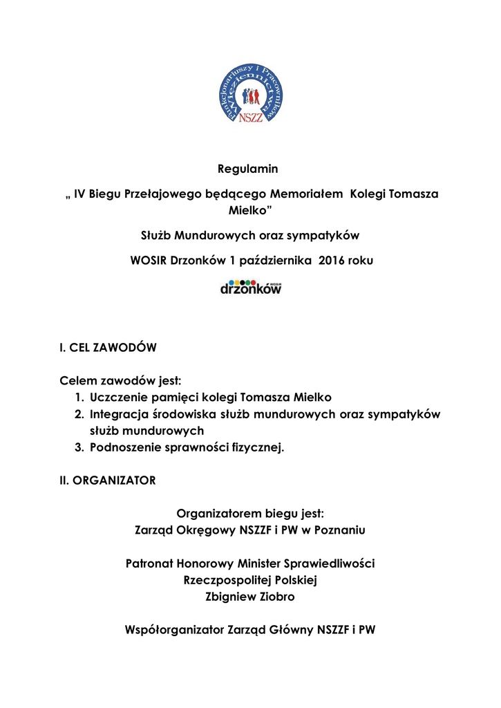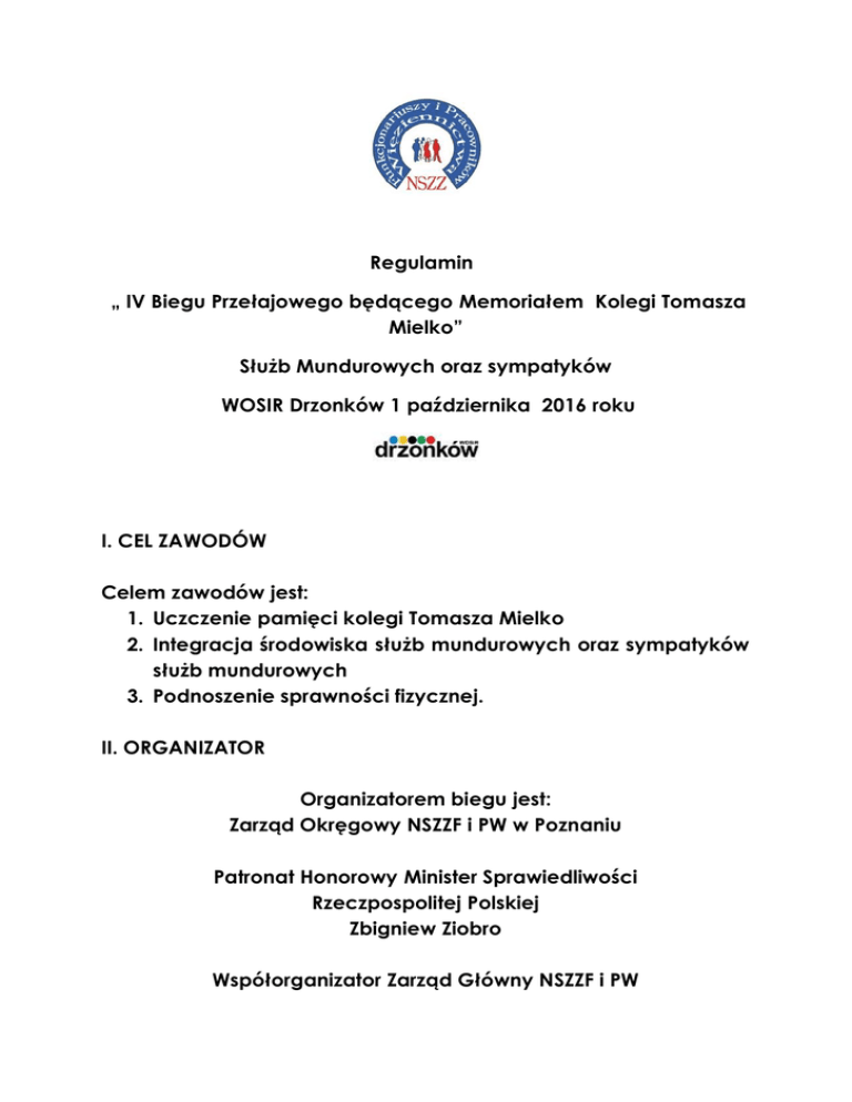 Regulamin „ IV Biegu Przełajowego będącego Memoriałem Kolegi Tomasza Mielko” Służb Mundurowych oraz sympatyków WOSIR Drzonków 1 października 2016 roku I. CEL ZAWODÓW Celem zawodów jest: 1. Uczczenie pamięci kolegi Tomasza Mielko 2. Integracja środowiska służb mundurowych oraz sympatyków służb mundurowych 3. Podnoszenie sprawności fizycznej. II. ORGANIZATOR Organizatorem biegu jest: Zarząd Okręgowy NSZZF i PW w Poznaniu Patronat Honorowy Minister Sprawiedliwości Rzeczpospolitej Polskiej Zbigniew Ziobro Współorganizator Zarząd Główny NSZZF i PW oraz Dyrektor Okręgowy Służby Więziennej w Poznaniu III. TERMIN, MIEJSCE I TRASA 1. Bieg odbędzie się 1 października 2016 r. o godz. 12:00 i 12:15 2. Start wspólny i meta na terenie WOSIR w Drzonkowie. Start 12:00 kategoria 5 km i 12:15 kategoria 10 km 3. Kategoria Open i Służby Mundurowe Trasa nr 1 : ok. 5 km drogą asfaltową, pozostała część drogami gruntowymi i ścieżkami leśnymi po przylegających terenach leśnych. Start 12:00 4. Kategoria Open i Służby Mundurowe Trasa nr 2 : ok. 10 km drogą asfaltową, pozostała część drogami gruntowymi i ścieżkami leśnymi po przylegających terenach leśnych. Start 12:15 5. Dystans biegu dla kobiet i mężczyzn: Trasa nr 1. ok. 5 km. Trasa nr 2. ok. 10 km. IV. UCZESTNICTWO 1. Uczestnikami biegu mogą być funkcjonariusze, emeryci i pracownicy cywilni służb mundurowych, osoby cywilne wyrażające chęć udziału w biegu, dopuszczalne są starty osób od 16 lat warunek: wymagana jest zgoda rodzica/opiekuna prawnego. Zgoda ta musi być podpisana 2. 3. 4. 5. 6. przez rodzica/ w biurze zawodów. Wzór oświadczenia będzie dostępny w biurze zawodów. Uczestnicy otrzymają numery startowe oraz chipy. Wszyscy uczestnicy biorą udział w zawodach na własną odpowiedzialność. Uczestnik zawodów we własnym zakresie dokonuje ubezpieczenia od następstw nieszczęśliwych wypadków. Dokonanie zgłoszenia jest równoznaczne z akceptacją niniejszego regulaminu. Uczestnik wyraża zgodę, że nie będzie wnosić żadnych roszczeń w stosunku do Organizatorów w razie zaistnienia zdarzeń losowych podczas trwania zawodów. Wśród wszystkich uczestników, którzy ukończą bieg zostaną rozlosowane nagrody wartościowe o łącznej kwocie 4 tyś. zł V. KLASYFIKACJE Zawody rozgrywane są w następujących klasyfikacji: − Bieg wspólny dla kobiet i mężczyzn trasa około 5 km z podziałem na Klasyfikację Open mężczyzn i kobiet oraz dodatkową Klasyfikację mężczyzn i kobiet służb mundurowych. VI. NAGRODY Klasyfikacja Open 5 km Kobiety 1. Puchary od I do III miejsca – klasyfikacja kobiet 2. Medale od I do III miejsca – klasyfikacja kobiet 3. Statuetki pamiątkowe od miejsc IV do X – klasyfikacja kobiet 4. Dyplomy pamiątkowe dla wszystkich uczestników 5. Medal pamiątkowy Mężczyźni 1. Puchary od I do III miejsca – klasyfikacja mężczyzn 2. Medale od I do III miejsca – klasyfikacja mężczyzn 3. Statuetki pamiątkowe od miejsc IV do X – klasyfikacja mężczyzn 4. Dyplomy pamiątkowe dla wszystkich uczestników 5. Medal pamiątkowy Klasyfikacja Służby Mundurowe Kobiety 1. Puchary od I do III miejsca – klasyfikacja kobiet 2. Medale od I do III miejsca – klasyfikacja kobiet Mężczyźni 1. Puchary od I do III miejsca – klasyfikacja mężczyzn 2. Medale od I do III miejsca – klasyfikacja mężczyzn Liczba osób ograniczona max 100 osób, decyduje termin zgłoszenia. − Bieg wspólny dla kobiet i mężczyzn trasa około 10 km z podziałem na Klasyfikację Open mężczyzn i kobiet oraz dodatkową Klasyfikację mężczyzn i kobiet służb mundurowych. Klasyfikacja Open 10 km Kobiety 6. Puchary od I do III miejsca – klasyfikacja kobiet 7. Medale od I do III miejsca – klasyfikacja kobiet 8. Statuetki pamiątkowe od miejsc IV do X – klasyfikacja kobiet 9. Dyplomy pamiątkowe dla wszystkich uczestników 10. Medal pamiątkowy Mężczyźni 6. Puchary od I do III miejsca – klasyfikacja mężczyzn 7. Medale od I do III miejsca – klasyfikacja mężczyzn 8. Statuetki pamiątkowe od miejsc IV do X – klasyfikacja mężczyzn 9. Dyplomy pamiątkowe dla wszystkich uczestników 10. Medal pamiątkowy Klasyfikacja Służby Mundurowe Kobiety 3. Puchary od I do III miejsca – klasyfikacja kobiet 4. Medale od I do III miejsca – klasyfikacja kobiet Mężczyźni 3. Puchary od I do III miejsca – klasyfikacja mężczyzn 4. Medale od I do III miejsca – klasyfikacja mężczyzn Liczba osób ograniczona max 100 osób, decyduje termin zgłoszenia. VII. ZGŁOSZENIA 1. Każdy uczestnik chcąc zostać zarejestrowany na liście startowej musi dokonać indywidualnego zgłoszenia, formularz dostępny pod adresem : http://super-sport.com.pl/zapisy/869-iv-bieg-przelajowymemorial-kolegi-tomasza-mielko.html 2. Organizator wprowadza opłatę startową w wysokości 40 zł w dniu zawodów 50 zł od zawodnika, wpłaty należy dokonywać na konto pod powyższym adresem gdzie można należy się rejestrować. „ Z dopiskiem IV Memoriał Tomasza Mielki „ 3. Warunkiem uczestnictwa w zawodach jest zarejestrowanie się na stronie wypełnienie stosownego formularzu zgłoszeniowego oraz dokonania wpłaty na wskazane konto, lub opłaty startowej na miejscu zawodów: Do 20 września 2016 roku „Każdy uczestnik w dniu zawodów powinien posiadać przy sobie formularz zgłoszeniowy, dowód wpłaty oraz dokument potwierdzający tożsamość w celu weryfikacji zgłoszenia do zawodów.” 4. Szczegółowych informacji dotyczących biegu udziela Dariusz Mieczyński Tel : 509 199 077, email: [email protected] 5. Weryfikacja listy startowej nastąpi w dniu zawodów do godz. 11.15 VIII. POSTANOWIENIA KOŃCOWE 1. Zawody odbędą się bez względu na warunki atmosferyczne. 2. W sprawach nie ujętych w Regulaminie decyduje Sędzia Główny zawodów. 3. Organizator zastrzega sobie zmianę niniejszego regulaminu bez podania przyczyny. IX. PROGRAM ZAWODÓW 1 października 2016 r. 