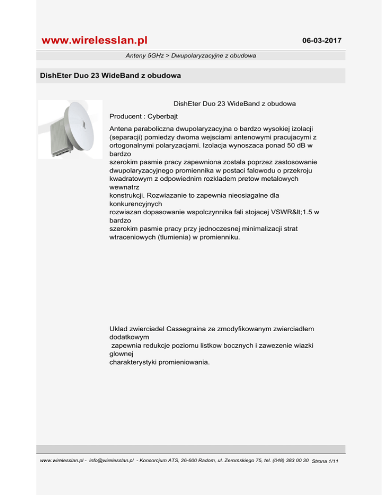 www.wirelesslan.pl 06-03-2017 Anteny 5GHz > Dwupolaryzacyjne z obudowa DishEter Duo 23 WideBand z obudowa DishEter Duo 23 WideBand z obudowa Producent : Cyberbajt Antena paraboliczna dwupolaryzacyjna o bardzo wysokiej izolacji (separacji) pomiedzy dwoma wejsciami antenowymi pracujacymi z ortogonalnymi polaryzacjami. Izolacja wynoszaca ponad 50 dB w bardzo szerokim pasmie pracy zapewniona zostala poprzez zastosowanie dwupolaryzacyjnego promiennika w postaci falowodu o przekroju kwadratowym z odpowiednim rozkladem pretow metalowych wewnatrz konstrukcji. Rozwiazanie to zapewnia nieosiagalne dla konkurencyjnych rozwiazan dopasowanie wspolczynnika fali stojacej VSWR<1.5 w bardzo szerokim pasmie pracy przy jednoczesnej minimalizacji strat wtraceniowych (tlumienia) w promienniku. Uklad zwierciadel Cassegraina ze zmodyfikowanym zwierciadlem dodatkowym zapewnia redukcje poziomu listkow bocznych i zawezenie wiazki glownej charakterystyki promieniowania. www.wirelesslan.pl - [email protected] - Konsorcjum ATS, 26-600 Radom, ul. Zeromskiego 75, tel. (048) 383 00 30 Strona 1/11 www.wirelesslan.pl 06-03-2017 Wyprofilowany i wydluzony kolnierz glownego zwierciadla anteny pozwala na redukcje promieniowania bocznego, dzieki czemu antena nadaje sie do montowania w miejscach, gdzie wystepuja inne systemy dzialajace w tym pasmie, zapewniajac minimalizacje ich wplywu na tworzone lacze. Antena posiada rowniez mniejsza mase i wymiary w porownaniu do konkurencyjnych rozwiazan, co znacznie ulatwia jej montaz i wizowanie w przypadku wykorzystania w budowie linkow o wysokiej przepustowosci typu Nstream Dual. Antena doskonale nadaje sie rowniez do zastosowania w laczach wykorzystujacych technologie 2x2 MIMO standardu 802.11n. Zwierciadlo (parabola) anteny wykonane z 1,5mm stopu aluminium, reflektor Cassegraina wykonany z 1mm stopu aluminium. Zwierciadlo, reflektor, promiennik oraz uchwyt anteny zabezpieczone sa przed wplywem warunkow zewnetrznych strukturalna farba proszkowa. Oslona paraboli i www.wirelesslan.pl - [email protected] - Konsorcjum ATS, 26-600 Radom, ul. Zeromskiego 75, tel. (048) 383 00 30 Strona 2/11 www.wirelesslan.pl 06-03-2017 reflektora wykonana z bardzo trwalego i niskotlumiennego tworzywa HIPS, odpornego na promieniowanie UV. Dzieki temu antena jest doskonale zabezpieczona przed oddzialywaniem warunkow atmosferycznych, co gwarantuje trwalosc i niezmiennosc parametrow w czasie eksploatacji. Zintegrowana z antena hermetyczna obudowa aluminiowa tworzy klatke Faradaya, chroniac umieszczona wewnatrz elektronike przed wplywem pola elektrostatycznego. Rozmiary obudowy pozwalaja na swobodne umieszczenie wewnatrz plyt: RB411/AH, 433/AH, 493/AH ALIX 3D2, Ubiquiti Rocket itp. za pomoca dolaczonych do zestawu metalowych tulejek dystansowych. Karta/karty radiowe wymagaja zastosowania pigtaili z koncowka N/Meska do polaczenia z antena. Solidny uchwyt wraz z cybantem dolaczony do anteny zapewnia stabilnosc, duza odpornosc na dzialanie wiatru oraz umozliwia regulacje kata pochylenia anteny, ulatwiajac optymalne ustawienie. Antena www.wirelesslan.pl - [email protected] - Konsorcjum ATS, 26-600 Radom, ul. Zeromskiego 75, tel. (048) 383 00 30 Strona 3/11 www.wirelesslan.pl 06-03-2017 dostarczana jako zmontowany w calosci produkt, gotowy do zamocowania na maszcie. Specyfikacja techniczna Gwarancja 36 m-cy Typ anteny paraboliczna Dwupolaryzacyjna, www.wirelesslan.pl - [email protected] - Konsorcjum ATS, 26-600 Radom, ul. Zeromskiego 75, tel. (048) 383 00 30 Strona 4/11 www.wirelesslan.pl 06-03-2017 Zakres czestotliwosci 4,9 - 6.2 GHz Zysk energetyczny dla polaryzacji pionowej dBi 5,2 - 5,7 GHz 23 4,9 - 5,2 i 5,7-6.2 GHz >20,5 dBi www.wirelesslan.pl - [email protected] - Konsorcjum ATS, 26-600 Radom, ul. Zeromskiego 75, tel. (048) 383 00 30 Strona 5/11 www.wirelesslan.pl Zysk energetyczny dla polaryzacji poziomej dBi 06-03-2017 5,2 - 5,7 GHz 23 4,9 - 5,2 i 5,7-6.2 GHz >20,5 dBi Polaryzacja oraz pozioma Liniowa, pionowa www.wirelesslan.pl - [email protected] - Konsorcjum ATS, 26-600 Radom, ul. Zeromskiego 75, tel. (048) 383 00 30 Strona 6/11 www.wirelesslan.pl Promieniowanie wsteczne Separacja pomiedzy zlaczami Kat promieniowania w plaszczyznie pionowej -3dB 06-03-2017 >40 dB >50 dB 7,5-8,5 ° dla www.wirelesslan.pl - [email protected] - Konsorcjum ATS, 26-600 Radom, ul. Zeromskiego 75, tel. (048) 383 00 30 Strona 7/11 www.wirelesslan.pl 06-03-2017 Kat promieniowania w plaszczyznie poziomej -3dB VSWR GHz 7,5-8,5 ° dla <1,5 dla 5.0 - 5,9 <1,9 dla 4.9 - 5.0 i 5.9 6.2 GHz www.wirelesslan.pl - [email protected] - Konsorcjum ATS, 26-600 Radom, ul. Zeromskiego 75, tel. (048) 383 00 30 Strona 8/11 www.wirelesslan.pl Listki boczne <-18 dB 06-03-2017 5.2 - 5.7 GHz: 4.9 - 5.2 i 5.7 - 6.2 GHz: <-14dB Zlacze 2 x N/Zenskie www.wirelesslan.pl - [email protected] - Konsorcjum ATS, 26-600 Radom, ul. Zeromskiego 75, tel. (048) 383 00 30 Strona 9/11 www.wirelesslan.pl Odpornosc na wiatr Srednica masztu/uchwytu Wymiary 06-03-2017 85 m/s 38 - 51 mm 380 x 245 mm www.wirelesslan.pl - [email protected] - Konsorcjum ATS, 26-600 Radom, ul. Zeromskiego 75, tel. (048) 383 00 30 Strona 10/11 www.wirelesslan.pl Wymiary czaszy Waga 06-03-2017 ø 360 mm 1800 g www.wirelesslan.pl - [email protected] - Konsorcjum ATS, 26-600 Radom, ul. Zeromskiego 75, tel. (048) 383 00 30 Strona 11/11