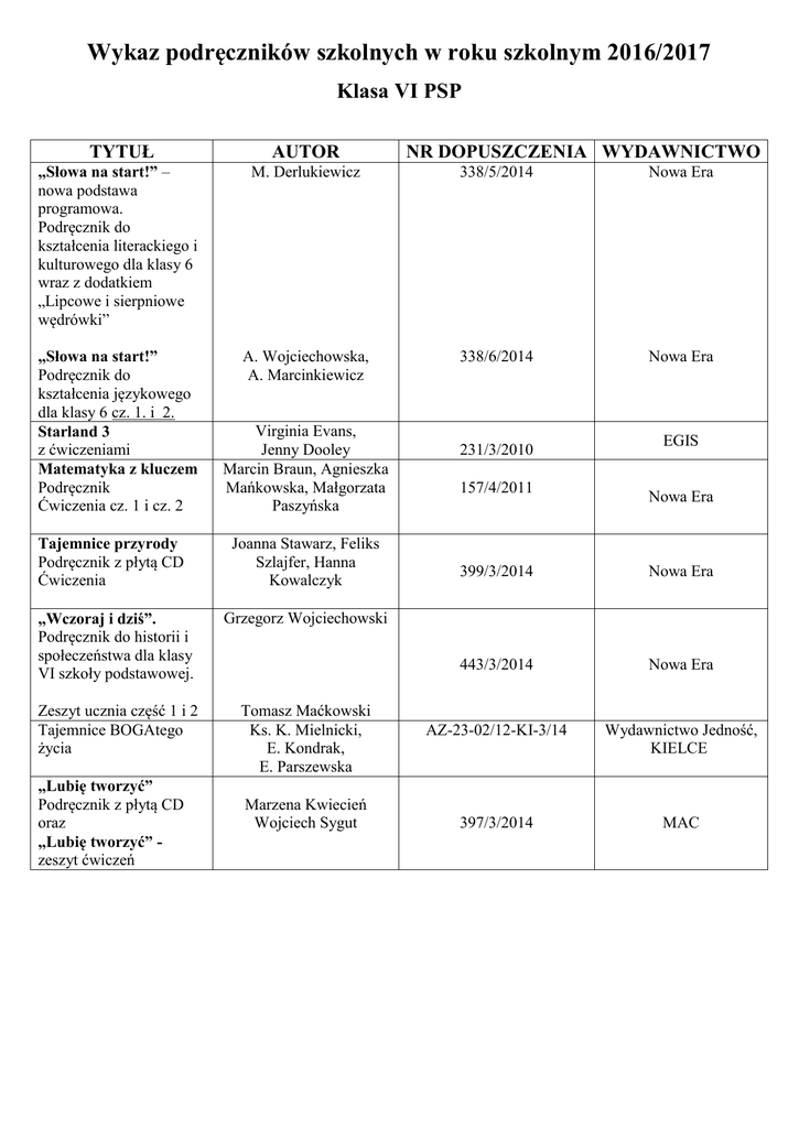 Wykaz podręczników szkolnych w roku szkolnym 2016/2017 Klasa VI PSP TYTUŁ AUTOR „Słowa na start!” – nowa podstawa programowa. Podręcznik do kształcenia literackiego i kulturowego dla klasy 6 wraz z dodatkiem „Lipcowe i sierpniowe wędrówki” M. Derlukiewicz 338/5/2014 Nowa Era „Słowa na start!” Podręcznik do kształcenia językowego dla klasy 6 cz. 1. i 2. Starland 3 z ćwiczeniami Matematyka z kluczem Podręcznik Ćwiczenia cz. 1 i cz. 2 A. Wojciechowska, A. Marcinkiewicz 338/6/2014 Nowa Era Tajemnice przyrody Podręcznik z płytą CD Ćwiczenia Virginia Evans, Jenny Dooley Marcin Braun, Agnieszka Mańkowska, Małgorzata Paszyńska Joanna Stawarz, Feliks Szlajfer, Hanna Kowalczyk „Wczoraj i dziś”. Podręcznik do historii i społeczeństwa dla klasy VI szkoły podstawowej. Grzegorz Wojciechowski Zeszyt ucznia część 1 i 2 Tajemnice BOGAtego życia Tomasz Maćkowski Ks. K. Mielnicki, E. Kondrak, E. Parszewska „Lubię tworzyć” Podręcznik z płytą CD oraz „Lubię tworzyć” zeszyt ćwiczeń Marzena Kwiecień Wojciech Sygut NR DOPUSZCZENIA WYDAWNICTWO 231/3/2010 157/4/2011 EGIS Nowa Era 399/3/2014 Nowa Era 443/3/2014 Nowa Era AZ-23-02/12-KI-3/14 Wydawnictwo Jedność, KIELCE 397/3/2014 MAC